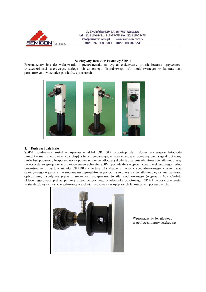 Selektywny Detektor Pasmowy SDP-1 Przeznaczony jest do wykrywania i przetwarzania na sygnał elektryczny promieniowania optycznego, w szczególności laserowego, stałego lub zmiennego (impulsowego lub modulowanego) w laboratoriach pomiarowych, w technice pomiarów optycznych. 1. Budowa i działanie. SDP-1 zbudowany został w oparciu o układ OPT101P produkcji Burr Bown zawierający fotodiodę monolityczną zintegrowaną (on chip) z transimpedancyjnym wzmacniaczem operacyjnym. Sygnał optyczny może być podawany bezpośrednio na powierzchnię światłoczułą diody lub za pośrednictwem światłowodu przy wykorzystaniu specjalnie zaprojektowanego uchwytu. SDP-1 posiada dwa wyjścia sygnału elektrycznego. Jedno bezpośrednie z wyjścia układu OPT101P (wyjście x1) drugie z wyjścia specjalizowanego wzmacniacza selektywnego o paśmie i wzmocnieniu zaprojektowanym do współpracy ze światłowodowymi analizatorami optycznymi, współpracującymi z laserowymi nadajnikami światła modulowanego (wyjście x100). Czułość układu regulowana jest za pomocą cztero pozycyjnego przełacznika obrotowego. SDP-1 wyposażony został w standardowy uchwyt o regulowanej wysokości, stosowany w optycznych laboratoriach pomiarowych. Wprowadzenie światłowodu w pobliże struktury detekcyjnej. 2. • • • • • Dane techniczne dla wyjścia x1 (praktycznie są to dane układu OPT101P). powierzchnia światłoczuła fotodiody 2,29 x 2,29mm(5,2mm2); czułość prądowa 0,45A/W; (λ=650nm); czułość napięciowa 0,45V/µW; (λ=650nm); maksymalne przesunięcie napięcia wyjściowego 10mV; przełącznik obrotowy zmiany czułości układu OPT101P: Pozycja przełącznika 1 2 3 4 Mnożnik skali czułości x (106V/A) 0,05 1 2 5 Pasmo (kHz) 58 23 9,4 3,6 Uwaga! Z uwagi na małe gabaryty detektora, pozycje przełącznika nie są osobno numerowane. Podane są bezpośrednio mnożniki skali. • • • prąd zwarcia 15mA; maksymalne napięcie wyjściowe 3,8VDC/VAC; charakterystyka spektralna układu OPT101P (wyjście x1; przeł. obrot. poz. x1), przedstawiona jest na poniższym wykresie. 4. • • • • • 4. • • • • • Dane techniczne dla wyjścia x100. (Wyjście x100 połączone jest szeregowo z wyjściem x1 za pomącą specjalizowanego wzmacniacza selektywnego) wzmocnienie wzmacniacza selektywnego 100; pasmo wzmacniacza selektywnego 800Hz÷3KHz (3dB); oporność wyjściowa 1kOhm; charakterystyka tłumienia 48dB/oktwę (filtr 8 rzędowy); maksymalne napięcie wyjściowe 4Vpp; Dane ogólne: zasilanie 5VDC; wymiary (bez uchwytów) 23 x19x 86mm; obudowa aluminium anodyzowane; Uchwyt światłowodu 0,5÷3,5mm, typ DREMEL 4486; Wykorzystanie pełnej powierzchni foto czułej układu OPT101P odbywa się poprzez wykręcenie głowicy wraz z uchwytem DREMEL 4486. 3. • • • • Skompletowanie: detektor wraz z uchwytem światłowodu i regulowaną podstawą; zasilacz 230VAC/5VDC; kabel LEMO-1 z wtyczkami bananowymi; kabel LEMO-1 – BNC.
