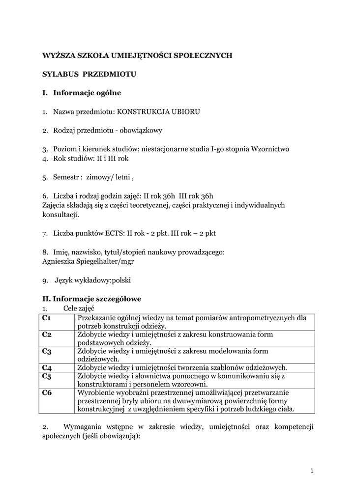 KONSTRUKCJA UBIORU 2 - Wyższa Szkoła Umiejętności