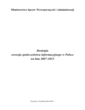 Ministerstwo Spraw Wewnętrznych i Administracji Strategia rozwoju społeczeństwa informacyjnego w Polsce na lata 2007-2013 Warszawa, 18 października 2007 r. Spis treści: I. Cele i uwarunkowania rozwoju społeczeństwa informacyjnego......................................................1 I.1. Europejskie i światowe uwarunkowania rozwoju społeczeństwa informacyjnego ...................1 I.2. Rola państwa w procesie budowy społeczeństwa informacyjnego ...........................................4 I.3. Uwarunkowania technologiczne i społeczne rozwoju społeczeństwa informacyjnego i ich zaleŜność od działań państwa ..................................................................................................6 I.4. Uwarunkowania sprawnej informatyzacji państwa. ................................................................13 II. Stan informatyzacji Polski w roku 2006 na tle Unii Europejskiej – diagnoza sytuacji i prognoza trendów rozwojowych..................................................................................................................19 II.1. Dokumenty rządowe określające ramy i kierunki informatyzacji Polski do roku 2006 ........19 II.2. Akty prawne związane z problematyką informatyzacji Polski ..............................................19 II.3. Infrastruktura telekomunikacyjna i dostęp do Internetu w Polsce w 2006 r. .........................25 II.4. Stan informatyzacji polskiej administracji publicznej w roku 2006 ......................................34 II.5. Wykorzystanie Internetu w Polsce na tle Unii Europejskiej i świata w 2006 r. ....................43 II.6. Ocena realizacji dokumentu „Strategia informatyzacji Rzeczypospolitej Polskiej – e-Polska na lata 2004-2006” i uwagi o aktualności dokumentu „Strategia kierunkowa rozwoju informatyzacji Polski do roku 2013 oraz perspektywiczna prognoza transformacji społeczeństwa informacyjnego do roku 2020”.......................................................................51 II.7. Prognozy uwarunkowań rozwoju społeczeństwa informacyjnego w latach 2007-2013........53 II.8. Analiza SWOT stanu informatyzacji Polski w roku 2007 .....................................................56 III. Strategiczne cele działań państwa na rzecz budowy społeczeństwa informacyjnego w latach 20072013..............................................................................................................................................58 V. System realizacji zadań państwa w dziedzinie budowy społeczeństwa informacyjnego w latach 2007-2013 ....................................................................................................................................70 Spis rysunków ..................................................................................................................................107 2 I. Cele i uwarunkowania rozwoju społeczeństwa informacyjnego Społeczeństwo informacyjne to społeczeństwo, w którym towarem staje się informacja traktowana jako szczególne dobro niematerialne, równowaŜne lub cenniejsze nawet od dóbr materialnych. Przewiduje się rozwój usług związanych z 3P (przechowywanie, przesyłanie, przetwarzanie informacji). Warunkami koniecznymi dla jego funkcjonowania są: a) powszechna umiejętność korzystania z Internetu przez obywateli oraz świadomość związanych z nim korzyści oraz zagroŜeń, b) brak technicznych i ekonomicznych barier dostępu do informacji w formie cyfrowej, a szczególnie do Internetu - powszechna dostępność sprzętu komputerowego i innych urządzeń komunikacji elektronicznej oraz taniego szerokopasmowego dostępu do Internetu zapewniającego moŜliwość komfortowego korzystania z usług opartych na technologiach informacyjnych i komunikacyjnych, c) powszechne wykorzystanie technologii informacyjnych i telekomunikacyjnych przez instytucje państwa i samorządy, umoŜliwiające ich sprawne funkcjonowanie we współczesnych warunkach społecznych i gospodarczych – w tym udostępnianie informacji publicznej oraz świadczenie usług w formie elektronicznej, d) digitalizacja dorobku kultury i nauki oraz bezpłatne udostępnianie tych zasobów informacji, e) funkcjonowanie gospodarki opartej na wiedzy (wymuszająca stałe podnoszenie kwalifikacji obywateli), w tym gospodarki elektronicznej (wysoka podaŜ sprzętu i usług ICT, wielość firm funkcjonujących na rynku na zasadach wolnej konkurencji, stały postęp technologiczny) f) skuteczne zwalczanie zagroŜeń technicznych i społecznych związanych z Internetem i zapobieganie tym zagroŜeniom I.1. Europejskie informacyjnego i światowe uwarunkowania rozwoju społeczeństwa Przekonanie o konieczności inwestowania w innowacyjność oraz wdraŜania gospodarki opartej na wiedzy dla rozwoju Unii Europejskiej jest główną ideą Strategii Lizbońskiej. Kluczowe znaczenie przypisuje ona rozwojowi technologii informacyjnych i telekomunikacyjnych (ICT) jako siły napędzającej konkurencyjność gospodarki i wzrost zatrudnienia. Komunikat Komisji Europejskiej „i2010 – Europejskie społeczeństwo informacyjne na rzecz wzrostu i zatrudnienia” z dnia 1 czerwca 2005 r. wskazuje kierunki działań Unii Europejskiej w najbliŜszych latach, będące kontynuacją inicjatyw eEurope 2002 – Społeczeństwo informacyjne dla wszystkich oraz eEurope+2003 – Wspólne działania na rzecz wdroŜenia społeczeństwa informacyjnego w Europie i eEurope 2005. Ustanawia następujące priorytety rozwoju europejskiego społeczeństwa informacyjnego: − ukończenie budowy jednolitej przestrzeni informacyjnej, wspierającej otwarty i konkurencyjny rynek wewnętrzny w dziedzinie społeczeństwa informacyjnego i mediów, − wzmocnienie innowacji i inwestycji w badaniach nad ICT zmierzające do tworzenia nowych i lepszych miejsc pracy, 1 − stworzenie integracyjnego europejskiego społeczeństwa informacyjnego, które przyczyni się do wzrostu i powstania nowych mie