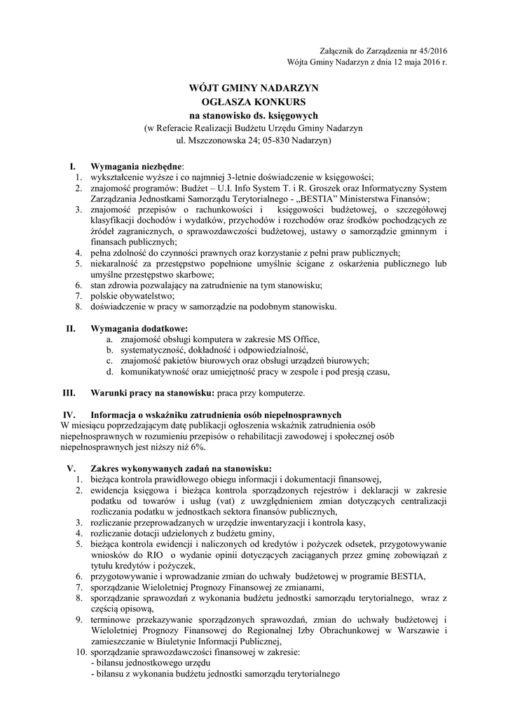 Załącznik do Zarządzenia nr 45/2016 Wójta Gminy Nadarzyn z dnia 12 maja 2016 r. WÓJT GMINY NADARZYN OGŁASZA KONKURS na stanowisko ds. księgowych (w Referacie Realizacji Budżetu Urzędu Gminy Nadarzyn ul. Mszczonowska 24; 05-830 Nadarzyn) I. Wymagania niezbędne: 1. wykształcenie wyższe i co najmniej 3-letnie doświadczenie w księgowości; 2. znajomość programów: Budżet – U.I. Info System T. i R. Groszek oraz Informatyczny System Zarządzania Jednostkami Samorządu Terytorialnego - „BESTIA” Ministerstwa Finansów; 3. znajomość przepisów o rachunkowości i księgowości budżetowej, o szczegółowej klasyfikacji dochodów i wydatków, przychodów i rozchodów oraz środków pochodzących ze źródeł zagranicznych, o sprawozdawczości budżetowej, ustawy o samorządzie gminnym i finansach publicznych; 4. pełna zdolność do czynności prawnych oraz korzystanie z pełni praw publicznych; 5. niekaralność za przestępstwo popełnione umyślnie ścigane z oskarżenia publicznego lub umyślne przestępstwo skarbowe; 6. stan zdrowia pozwalający na zatrudnienie na tym stanowisku; 7. polskie obywatelstwo; 8. doświadczenie w pracy w samorządzie na podobnym stanowisku. II. III. Wymagania dodatkowe: a. znajomość obsługi komputera w zakresie MS Office, b. systematyczność, dokładność i odpowiedzialność, c. znajomość pakietów biurowych oraz obsługi urządzeń biurowych; d. komunikatywność oraz umiejętność pracy w zespole i pod presją czasu, Warunki pracy na stanowisku: praca przy komputerze. IV. Informacja o wskaźniku zatrudnienia osób niepełnosprawnych W miesiącu poprzedzającym datę publikacji ogłoszenia wskaźnik zatrudnienia osób niepełnosprawnych w rozumieniu przepisów o rehabilitacji zawodowej i społecznej osób niepełnosprawnych jest niższy niż 6%. V. Zakres wykonywanych zadań na stanowisku: 1. bieżąca kontrola prawidłowego obiegu informacji i dokumentacji finansowej, 2. ewidencja księgowa i bieżąca kontrola sporządzonych rejestrów i deklaracji w zakresie podatku od towarów i usług (vat) z uwzględnieniem zmian dotyczących centralizacji rozliczania podatku w jednostkach sektora finansów publicznych, 3. rozliczanie przeprowadzanych w urzędzie inwentaryzacji i kontrola kasy, 4. rozliczanie dotacji udzielonych z budżetu gminy, 5. bieżąca kontrola ewidencji i naliczonych od kredytów i pożyczek odsetek, przygotowywanie wniosków do RIO o wydanie opinii dotyczących zaciąganych przez gminę zobowiązań z tytułu kredytów i pożyczek, 6. przygotowywanie i wprowadzanie zmian do uchwały budżetowej w programie BESTIA, 7. sporządzanie Wieloletniej Prognozy Finansowej ze zmianami, 8. sporządzanie sprawozdań z wykonania budżetu jednostki samorządu terytorialnego, wraz z częścią opisową, 9. terminowe przekazywanie sporządzonych sprawozdań, zmian do uchwały budżetowej i Wieloletniej Prognozy Finansowej do Regionalnej Izby Obrachunkowej w Warszawie i zamieszczanie w Biuletynie Informacji Publicznej, 10. sporządzanie sprawozdawczości finansowej w zakresie: - bilansu jednostkowego urzędu - bilansu z wykonania budżetu jednostki samorządu terytorialnego - zbiorczych i skonsolidowanych bilansów jednostki - rachunku zysków i strat jednostkowego i zbiorczych - zestawienia zmian w funduszu jednostki i zbiorczych - informacji dodatkowych obejmujących wprowadzenie do sprawozdania finansowego oraz dodatkowych informacji i objaśnień - wystawianie Polecenia Księgowania niezbędnego w zakresie sporządzenia sprawozdawczości finansowej 11. przygotowywanie według potrzeb analiz z wykonania planu dochodów i wydatków budżetu gminy, 12. inne zadania wynikające z przepisów szczególnych lub zlecone przez Wójta, Zastępcę Wójta, Sekretarza Gminy i Skarbnika Gminy. VI. Wymagane dokumenty i oświadczenia: 1. życiorys (CV) 2. list motywacyjny, 3. potwierdzone za zgodność kserokopie dokumentów poświadczających wykształcenie oraz doświadczenie w księgowości 4. potwierdzone za zgodność kserokopie dokumentów potwierdzających znajomość programów oraz przepisów - określonych w wymaganiach niezbędnych (pkt 2 oraz pkt 3); ewentualnie oświadczenie o znajomości ww. programów i przepisów 5. potwierdzona kopia obu stron dowodu osobistego albo oświadczenie o posiadaniu obywatelstwa polskiego, 6. oświadczenie o zdolności do czynności prawnych oraz korzystaniu z pełni praw publicznych, 7. oświadczenie kandydata o niekaralności za przestępstwo popełnione umyślnie ścigane z oskarżenia publicznego lub umyślne przestępstwo skarbowe, 8. potwierdzone za zgodność kserokopie dokumentów poświadczających doświadczenie w pracy w samorządzie na podobnym stanowisku, 9. aktualne zaświadczenie lekarskie o braku przeciwwskazań zdrowotnych do wykonywania pracy na ww. stanowisku (może być wystawione przez lekarza pierwszego kontaktu), 10. oświadczenie kandydata o wyrażeniu zgody na przetwarzanie danych osobowych do celów rekrutacji, VII. VII. Dodatkowe informacje 1. wszystkie oświadczenia mogą być sporządzone w formie jednego dokumentu, 2. znajomość programów oraz przepisów określonych w wymaganiach niezbędnych (pkt 2 oraz pkt 3) będzie weryfikowana podczas rozmowy kwalifikacyjnej i przy stanowisku pracy Wymagane dokumenty aplikacyjne wraz z adresem zwrotnym należy składać osobiście w siedzibie Urzędu Gminy Nadarzyn, ul. Mszczonowska 24, 05-830 Nadarzyn, Kancelaria - pokój 100, z dopiskiem: Dotyczy konkursu stanowisko ds. księgowych w terminie do dnia 24 maja 2016 r. do godz. 10.00. Aplikacje, które wpłyną do urzędu po upływie wyżej określonego terminu nie będą rozpatrywane. Informacji w sprawie konkursu udziela Edyta Gawrońska, Sekretarz Gminy, tel. 22 729 81 85 w. 104. Konkurs przeprowadzi komisja konkursowa powołana przez Wójta Gminy Nadarzyn. Kandydaci, którzy po analizie dokumentów aplikacyjnych spełnią wymogi formalne, zostaną indywidualnie powiadomieni o te