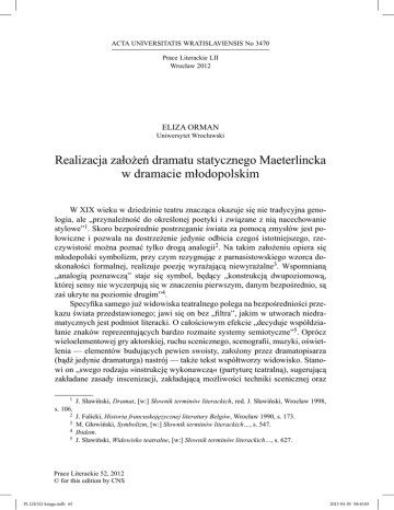 ACTAdramatu UNIVERSITATIS No 3470 Realizacja założeń statycznegoWRATISLAVIENSIS Maeterlincka w dramacie młodopolskim 65 Prace Literackie LII Wrocław 2012 ELIZA ORMAN Uniwersytet Wrocławski Realizacja założeń dramatu statycznego Maeterlincka w dramacie młodopolskim W XIX wieku w dziedzinie teatru znacząca okazuje się nie tradycyjna genologia, ale „przynależność do określonej poetyki i związane z nią nacechowanie stylowe”1. Skoro bezpośrednie postrzeganie świata za pomocą zmysłów jest połowiczne i pozwala na dostrzeżenie jedynie odbicia czegoś istotniejszego, rzeczywistość można poznać tylko drogą analogii2. Na takim założeniu opiera się młodopolski symbolizm, przy czym rezygnując z parnasistowskiego wzorca doskonałości formalnej, realizuje poezję wyrażającą niewyrażalne3. Wspomnianą „analogią poznawczą” staje się symbol, będący „konstrukcją dwupoziomową, której sensy nie wyczerpują się w znaczeniu pierwszym, danym bezpośrednio, są zaś ukryte na poziomie drugim”4. Specyfika samego już widowiska teatralnego polega na bezpośredniości przekazu świata przedstawionego; jawi się on bez „filtra”, jakim w utworach niedramatycznych jest podmiot literacki. O całościowym efekcie „decyduje współdziałanie znaków reprezentujących bardzo rozmaite systemy semiotyczne”5. Oprócz wieloelementowej gry aktorskiej, ruchu scenicznego, scenografii, muzyki, oświetlenia — elementów budujących pewien swoisty, założony przez dramatopisarza (bądź jedynie dramaturga) nastrój — także tekst współtworzy widowisko. Stanowi on „swego rodzaju »instrukcję wykonawczą« (partyturę teatralną), sugerującą zakładane zasady inscenizacji, zakładającą możliwości techniki scenicznej oraz 1 J. Sławiński, Dramat, [w:] Słownik terminów literackich, red. J. Sławiński, Wrocław 1998, s. 106. 2 3 4 5 J. Falicki, Historia francuskojęzycznej literatury Belgów, Wrocław 1990, s. 173. M. Głowiński, Symbolizm, [w:] Słownik terminów literackich…, s. 547. Ibidem. J. Sławiński, Widowisko teatralne, [w:] Słownik terminów literackich…, s. 627. Prace Literackie 52, 2012 © for this edition by CNS PL LII(52)-księga.indb 65 2013-04-30 08:45:05 66 ELIZA ORMAN respektującą zdolności percepcyjne odbiorcy”6; można więc uznać go za swoiste spoiwo, które oprócz przekazywania (do)słownie treści łączy pozostałe elementy konstrukcyjne dramatu. Pełnienie przezeń obu tych funkcji możliwe jest dzięki niejednorodności i wielopoziomowości tekstu dramatycznego; didaskalia trzeba bowiem uznać za osobliwy środek tworzenia fikcyjnego świata. Uznanie takiej „wielotworzywowości” dramatu zostało wyraźnie sformułowane przez S. Skwarczyńską w latach 40. XX wieku w postaci teatralnej teorii dramatu, przeciwstawiającej się dotychczasowej teorii literackiej7. Autorem doskonale pojmującym zarówno pośredniość poznania, jak i oryginalność dramatu jako dzieła sztuki, oraz w doskonały sposób przekładającym to zrozumienie na swoją twórczość, był Maurice Maeterlinck. Stał się on głównym teoretykiem, kodyfikatorem i realizatorem dramatu poetycko-symbolicznego8 być może za sprawą wpływu poznanych osobiście podczas pobytu w Paryżu Mallarmégo i Villiers de l’Isle-Adama, których twórczość nacechowana była mistyką sztuki, oddziaływała przez impresję, skojarzenie mgliście zarysowanych obrazów9. Maeterlinckowska idea: Ważne jest tylko to, z czego nie jesteśmy w stanie do końca zdać sobie sprawy. Nasza nieświadomość czy półświadomość ma, dzięki takim przeczuciom, prowadzić nas do tej nieuchwytnej, lepszej części naszej istoty10 stała się punktem wyjścia konstrukcji pewnej odmiany gatunkowej dramatu. (Pragnę tutaj zaznaczyć, że analizowane przeze mnie cechy konstytutywne tejże odmiany będą szczegółowo omówione w tej właśnie części pracy, natomiast później, aby uniknąć powtarzania treści własnych obserwacji, wykażę jedynie ich obecność w dramatach polskich). Już na początku XX wieku Zenon Przesmycki w swoim artykule Maurycy Maeterlinck zapisał istotne spostrzeżenie: „za obrazem konkretnym muszą otwierać się bezkresne widnokręgi ukrytej, nieskończonej, wiekuistej, niezmiennej i niepojętej istoty rzeczy”11. Belgijski dramatopisarz wykorzystuje do tego symbol w szczególnym rozumieniu: symboliczne stają się statyczne elementy konstrukcyjne świata przedstawionego jego utworów dramatycznych. Zasadniczą jednak cechą jest prawie zupełne pozbawienie tego typu dramatu akcji opartej na konflikcie (który ma raczej charakter filozoficzny, egzystencjalny, 6 M. Leyko, Dramat, [w:] Słownik rodzajów i gatunków literackich, red. G. Gazda, S. Tynecka-Makowska, Kraków 2006, s. 177. 7 M. Głowiński, Teatralna teoria dramatu, [w:] Słownik terminów literackich…, s. 574. 8 M. Bernacki, Dramat poetycko-symboliczny, [w:] M. Bernacki, M. Pawlus, Słownik gatunków literackich, Bielsko-Biała 1999, s. 477. 9 M. Duda, Maeterlinck Maurice, [w:] Słownik pisarzy świata, red. J. Maślanka, Kraków 2008, s. 498. 10 J. Falicki, op. cit., s. 199. 11 Z. Przesmycki, Wstęp, [w:] M. Maeterlinck, Wybór pism dramatycznych, tłum. i wstęp Z. Przesmycki, Warszawa 1894, s. LXVII. Prace Literackie 52, 2012 © for this edition by CNS PL LII(52)-księga.indb 66 2013-04-30 08:45:05 Realizacja założeń dramatu statycznego Maeterlincka w dramacie młodopolskim 67 właśnie — zdałoby się — statyczny, nieprzypominający intryg energicznych bohaterów). „Od początku wszyscy czekają na katastrofę, na nieubłaganie zbliżające się nieszczęście, przeciwko któremu nikt nie usiłuje walczyć. Nie ma więc w ogóle miejsca na żaden konflikt dramatyczny”12. Zamiast dynamicznego rozwoju zdarzeń pojawia się więc w treści utworu układ sytuacyjny, tworzony przez pewien zespół współbrzmień i współznaczeń, jednocześnie subtelnie sugeruj