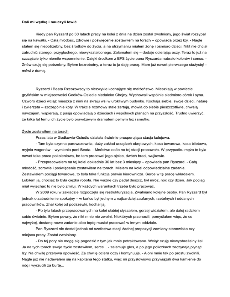 Dali mi wędkę i nauczyli łowić Kiedy pan Ryszard po 30 latach pracy na kolei z dnia na dzień został zwolniony, jego świat rozsypał się na kawałki. - Całą młodość, zdrowie i poświęcenie zostawiłem na torach – opowiada przez łzy. - Nagle stałem się niepotrzebny, bez środków do życia, a na utrzymaniu miałem żonę i ośmioro dzieci. Nikt nie chciał zatrudnić starego, przygłuchego, niewykształconego. Załamałem się – dodaje ocierając oczy. Teraz to już na szczęście tylko niemiłe wspomnienie. Dzięki środkom z EFS życie pana Ryszarda nabrało kolorów i sensu. Znów czuję się potrzebny. Byłem bezrobotny, a teraz to ja daję pracę. Mam już nawet pierwszego stażystę! mówi z dumą. Ryszard i Beata Rzeszowscy to niezwykle kochające się małżeństwo. Mieszkają w powiecie gryfińskim w miejscowości Godków-Osiedle niedaleko Chojny. Wychowali wspólnie siedmioro córek i syna. Czworo dzieci wciąż mieszka z nimi na skraju wsi w urokliwym budynku. Kochają siebie, swoje dzieci, naturę i zwierzęta – szczególnie koty. W trakcie rozmowy stale żartują, mówią do siebie pieszczotliwie, chwalą nawzajem, wspierają, z pasją opowiadają o dzieciach i wspólnych planach na przyszłość. Trudno uwierzyć, że kilka lat temu ich życie było prawdziwym dramatem pełnym łez i smutku. Życie zostawiłem na torach Przez lata w Godkowie-Osiedlu działała świetnie prosperująca stacja kolejowa. - Tam była czynna parowozownia, duży zakład urządzeń okrętowych, kasa towarowa, kasa biletowa, myjnia wagonów – wymienia pani Beata. - Mnóstwo osób na tej stacji pracowało. W przypadku męża to była nawet taka praca pokoleniowa, bo tam pracował jego ojciec, dwóch braci, wujkowie. - Przepracowałem na tej kolei dokładnie 30 lat bez 3 miesięcy – opowiada pan Ryszard. - Całą młodość, zdrowie i poświęcenie zostawiłem na torach. Miałem na kolei odpowiedzialne zadania. Zestawiałem pociągi towarowe, to była taka funkcja prawie kierownicza. Serce w tę pracę wkładałem. Lubiłem ją, chociaż to była ciężka robota. Nie ważne czy padał deszcz, był mróz, noc czy dzień. Jak pociąg miał wyjechać to nie było zmiłuj. W każdych warunkach trzeba było pracować. W 2009 roku w zakładzie rozpoczęła się restrukturyzacja. Zwalniano kolejne osoby. Pan Ryszard był jednak o zatrudnienie spokojny – w końcu był jednym z najbardziej zaufanych, rzetelnych i oddanych pracowników. Znał kolej od podszewki, kochał ją. - Po tylu latach przepracowanych na kolei słabiej słyszałem, gorzej widziałem, ale dalej radziłem sobie świetnie. Byłem pewny, że nikt mnie nie zwolni. Niektórych przenosili, pomyślałem więc, że co najwyżej, dostanę nowe zadanie albo będę musiał pracować w innym oddziale. Pan Ryszard nie dostał jednak od szefostwa stacji żadnej propozycji zamiany stanowiska czy miejsca pracy. Został zwolniony. - Do tej pory nie mogę się pogodzić z tym jak mnie potraktowano. Wciąż czuję niewyobrażalny żal. Ja na tych torach swoje życie zostawiłem, serce .. - załamuje głos, a po jego policzkach zaczynają płynąć łzy. Na chwilę przerywa opowieść. Za chwilę ociera oczy i kontynuuje. - A oni mnie tak po prostu zwolnili. Nagle już nie nadawałem się na kapitana tego statku, więc mi przysłowiowo przywiązali dwa kamienie do nóg i wyrzucili za burtę... Jedzenie albo rachunki Pan Ryszard się załamał. Nie miał przed sobą żadnych perspektyw ani szans na zatrudnienie. - Przez większość mojego życia pracowałem na kolei, na tym się znałem. Nie wyobrażałem sobie, że mógłbym robić cokolwiek innego – mówi pan Ryszard. - Mogłem ewentualnie zostać zwykłym robotnikiem, ale nikt mi pracy dać nie chciał. Bo ja już za stary, bo nie wykształcony, a i nigdzie etatów nie było. Pan Ryszard zaczął więc pobierać zasiłek dla bezrobotnych, tzw. kuroniówkę. Miesięcznie otrzymywał 600 zł. - Nie dało się za takie śmieszne pieniądze utrzymać rodziny. Za samo mieszkanie miałem miesięcznie płacić 620 zł, nie wliczając w to ogrzewania i ciepłej wody – wspomina pan Ryszard. Dostawałem jakieś prace interwencyjne a to na miesiąc, a to na trzy. Ale ile z tego można było zarobić? – grosze, a i żadnej stabilizacji nie było. Skromne zarobki pani Beaty wystarczały tylko na podstawowe wydatki. - Nie zarabiam wiele – mówi pani Beata. - 10 lat po maturze nie pracowałam, bo wychowywałam ośmioro dzieci. Kiedy dzieci podrosły postanowiłam zacząć pracować, ale bez doświadczenia i wykształcenia nie miałam co liczyć na lepszą pracę. Zostałam sprzątaczką, cały czas dorabiałam a to w sadzie, a to w opiece, jeździłam też do pracy do szczecińskich szpitali, gdzie byłam salową. Pracy było mnóstwo. Czasem z mężem w ciągu doby widzieliśmy się tylko po 15 minut, ale nie można było inaczej, trzeba było dzieci utrzymać. Chciałam iść na studia, ale nie było na to pieniędzy. Udało mi się jedynie skończyć studium z księgowości i administracji. - Czasem było tak ciężko, że musieliśmy wybierać między kupnem jedzenia dla dzieci, a opłaceniem rachunków – wspomina pan Ryszard. - Oczywiście woleliśmy nakarmić dzieci, a długi rosły... Silny jak platan Nadszedł grudzień 2012 roku. Pani Beata, która aktywnie działa społecznie w Godkowie-Osiedlu, musiała część spraw załatwić w urzędzie gminy. Na tablicy ogłoszeń wypatrzyła ulotkę z napisem „Projekt Zysku Dojrzałości 50+”. - Zapisałam to sobie w notesie, żeby sprawdzić, o co chodzi – opowiada pani Beata. - Po dotarciu do pracy od razu odpaliłam komputer kolegów i zaczęłam czytać o projekcie. Napisano o nim, że jego celem jest poprawa sytuacji osób po 50 roku życia na rynku pracy. Można było otrzymać dofinansowanie z funduszy unijnych na swoją własną działalność gospodarczą. Pomyślałam, że to szansa dla mojego Ryśka. Postanowiłam z n