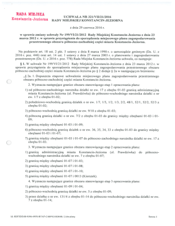 RADA MIEJSKA Konstanejn-Jczjorn* UCH WAŁA NR 321/VII/21/2016 RADY MIEJSKIEJ KONSTANCIN-JEZIORNA z dnia 29 czerwca 2016 r. w sprawie zmiany uchwaly Nr 199/VI/21/2012 Rady Miejskiej Konstancin-Jeziorna z dnia 23 marea 2012 r. w sprawie przystąpienia do sporządzenia miejscowego planu zagospodarowania przestrzennego obszaru pólnocno-zachodniej części miasta Konstancin-Jeziorna. Na podstawie art. 18 ust. 2 pkt. 5 ustawy z dnia 8 marca 1990 r. o samorządzie gminnym (Dz. U. z 2016 r. poz. 446) oraz art. 14 ust. I ustawy z dnia 27 marca 2003 r. o planowaniu i zagospodarowaniu przestrzennym (Dz. Ii. z 2016 r. poz. 778) Rada Miejska Konstancin-Jeziorna uchwala, co następuje: 1. W uchwale Nr 199/VI/21/2012 Rady Miejskiej Konstancin-Jeziorna z dnia 23 marca 2012 r. w sprawie przystąpienia do sporządzenia miejscowego planu zagospodarowania przestrzennego obszaru północno-zachodniej części miasta Konstancin-Jeziorna po 2 dodaje 2a w następującym brzmieniu: 2a. 1. Dopuszcza etapowe uchwalenie miejscowego planu zagospodarowania przestrzennego obszaru północno-zachodniej części ni iasta Konstanc in-Jeziorna. ., 2. Wyznacza następujące granice obszaru stanowiącego etap 1 opracowania planu: 1) od północno-zachodniego narożnika działki nr ew. I 7 z obrębu 01-03 granicą administracyjną miasta Konstancin-Jeziorna (ul. Prawdziwka) do północno-wschodniego narożnika działki o nr ew. 1/7 z obrębu 01-02; 2) południowo-wschodnią granicą działek onr ew. 1/7, 1/5, 1/2, 1/3. 2/2, 48/1, 52/1, 52/2, 52/3 z obrębu 01-02; 3) północno-wschodnią granicą działki nr ew. 9/10 z obrębu 01-03; 4) północną granicą działki o nr ew. 7/2 z obrębu 01-03 do granicy między obrębami 01-03 i 0109; 5) granicą między obrębami 01-03 i 01-09; 6) północno-wschodnią granicą działek o nr ew. 36, 35, 34, 33 z obrębu 01-03 do granicy między obrębami 01-03 i 01-07; 7) granicą między obrębami 01-03 i 01-07 do północno-zachodniego narożnika działki nr ew. 17 z obrębu 01-03. 3. Wyznacza następujące granice obszaru stanowiącego etap 2 opracowania planu: 1) granicą administracyjną miasta Konstancin-Jeziorna wschodniego narożnika działki nr ew. 7 z obrębu 01-07; (ul. Prawdziwka) do północno- 2) granicą między obrębami 01-07 i O 1-03; 3) granicą między obrębami 01-07 i 01-08; 4) granicą między obrębami 01-07 I Ol-lO; 5) granicą między obrębami Ol-07 i 0013 (Kierszek). 4. Wyznacza następujące granice obszaru stanowiącego etap 3 opracowania planu: 1) granicą między obrębami 01-09 i 01-04; 2) północno-wschodnią granicą działki nr ew. 5 z obrębu 01-09; 3) przez działkę o nr ew. 131/4 z obrębu 01-14 do północno-wschodniego narożnika działki nr ew. 7 z obrębu 01-14; Id: 8DF5DE48-9390-49F0-B7AF-C48F9210D04B. Uchwalony Strona I 4) południową granicą działki nr ew. 13 1/4 z obrębu Ol-14 do północno-zachodniego narożnika działki nr ew. 78/2 z obrębu 01-14; 5) w linii prostej, stanowiącej przedłużenie południowej granicy działki nr ew. 13 l/4 z obrębu 0114, do granicy między obrębami Ol-14 i 01-13; 6) granicą między obrębami Ol-14 i 01-13; 7) granicą między obrębami Ol-14 i 01-08; 8) granicą między obrębami Ol-09 i 01-08; 9) granicą między obrębami Ol-09 i Ol-03. 5. Wyznacza następujące granice obszaru stanowiącego etap 4 opracowania planu: 1) granicą między obrębami Ol-10 i 0013 (Kierszek); 2) granicą między obrębami Ol-10 i 01-07; 3) granicą między obrębami 01-08 i 01-07; 4) granicą między obrębami Ol-03 i 01-07; 5) przez działkę o nr ew. 17 z obrębu Ol-03 do północnego narożnika działki nr ew. 33 z obrębu O 1-03; 6) północno-wschodnią granicą działek onr ew. 33, 34, 35,36 z obrębu 01-03; 7) przez działkę o nr ew. 43 z obrębu 01-03 do granicy między obrębami Ol-03 i 01-09; 8) granicą między obrębami Ol-03 i 01-09; 9) granicą między obrębami Ol-08 i 01-09; 10) granicą między obrębami Ol-08 i 01-14; II) granicą między obrębami Ol-10 i 01-13; 12) granicą między obrębami Ol-10 i Ol-II. 6. Wyznacza następujące granice obszaru stanowiącego etap 5 opracowania planu: 1) granicą między obrębami Ol-l li Ol-lO; 2) granicą między obrębami Ol-13 i 01-10; 3) granicą między obrębami Ol-13 i Ol-14 do punktu przecięcia z linią stanowiącą przedłużenie południowej granicy działki nr ew. 131/4 z obrębu 01-14; 4) w linii prostej stanowiącej przedłużenie południowej granicy działki nr ew. 13 l/4 z obrębu 01 14 do północno-wschodniego narożnika działki nr ew. 115 z obrębu O 1-13; 5) południowo-wschodnią granicą działki o nr ew. 115 z obrębu O 1-13; 6) południowo-wschodnią granicą działki onr ew. 72 z obrębu O 1-12; 7) północno-wschodnią granicą działki o nr ew. 8 z obrębu O 1-12; 8) przez działkę o nr ew. 74 z obrębu Ol-12 do granicy między obrębami 01-12 i 01-22; 9) granicą między obrębami Ol-12 i O 1-22; 10) przez działkę o nr ew. 74 z obrębu Ol-12 do południowej granicy działki nr ew. 73 z obrębu 01-12; 11) południową granicą działki o nr ew. 73 z obrębu O 1-12; 12) południową granicą działki o nr ew. I z obrębu Ol-21 do północno-zachodniego narożnika działki o nrew.34/l z obrębu 01-21; Id: 8DF5DE48-9390-49F0-B7AF-C48F92 I ODO4B. Uchwalony Strona 2 13) przez działkę onr ew. I z obrębu Ol-21 do granicy między obrębami Ol-12 i 01-21; 14) granicą między obrębami Ol-12 i Ol-2 1; 15) granicą między obrębami Ol-12 i 01-20: 16) granicą między obrębami Ol-11 i Ol-20 do punktu stanowiącego przedłużenie w kierunku północnym zachodniej granicy działki o nr ew. 42 z obrębu 01-20; 17) przez działkę o nr ew. 34 z obrębu Ol-li do północnej granicy działki onr ew. 34 z obrębu Ol 11; I 8) północną granicą działki o nr ew. 34 z obrębu Ol-II; 19) granicą między obrębami 01-1 I i 0013 (Kierszek). 7. Wyznacza następujące granice obszaru stanowiącego etap 6 opracowania planu: 1) granicą między obr