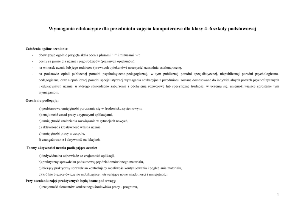 Wymagania edukacyjne dla przedmiotu zajęcia komputerowe dla klasy 4–6 szkoły podstawowej Założenia ogólne oceniania: - obowiązuje ogólnie przyjęta skala ocen z plusami ”+” i minusami ”-”: - oceny są jawne dla ucznia i jego rodziców (prawnych opiekunów), - na wniosek ucznia lub jego rodziców (prawnych opiekunów) nauczyciel uzasadnia ustaloną ocenę, - na podstawie opinii publicznej poradni psychologiczno-pedagogicznej, w tym publicznej poradni specjalistycznej, niepublicznej poradni psychologicznopedagogicznej oraz niepublicznej poradni specjalistycznej wymagania edukacyjne z przedmiotu zostaną dostosowane do indywidualnych potrzeb psychofizycznych i edukacyjnych ucznia, u którego stwierdzono zaburzenia i odchylenia rozwojowe lub specyficzne trudności w uczeniu się, uniemożliwiające sprostanie tym wymaganiom. Ocenianiu podlegają: a) podstawowa umiejętność poruszania się w środowisku systemowym, b) znajomość zasad pracy z typowymi aplikacjami, c) umiejętność znalezienia rozwiązania w sytuacjach nowych, d) aktywność i kreatywność własna ucznia, e) umiejętność pracy w zespole, f) zaangażowanie i aktywność na lekcjach. Formy aktywności ucznia podlegające ocenie: a) indywidualna odpowiedź ze znajomości aplikacji, b) praktyczny sprawdzian podsumowujący dział omówionego materiału, c) bieżący praktyczny sprawdzian kontrolujący możliwość kontynuowania i pogłębiania materiału, d) krótkie bieżące ćwiczenie mobilizujące i utrwalające nowe wiadomości i umiejętności. Przy ocenianiu zajęć praktycznych będą brane pod uwagę: a) znajomość elementów konkretnego środowiska pracy - programu, 1 b) umiejętność wyszukania i poprawienia błędów, c) sprawność w posługiwaniu się różnymi narzędziami, d) umiejętność połączenia elementów pracy różnych środowisk - programów, e) wykorzystanie wcześniej zdobytych umiejętności, f) samodzielność w pracy, g) zaangażowanie w pracę, h) postępy ucznia i jego indywidualne możliwości. Warunki i zasady poprawiania oceny bieżącej. - sprawdziany praktyczne są obowiązkowe - uczeń, który nie był obecny na sprawdzianie z przyczyn usprawiedliwionych pisze go w terminie ustalonym z nauczycielem, ale nie później, niż 2 tygodnie po powrocie do szkoły - niedostateczna ocena uzyskana ze sprawdzianu może być przez ucznia poprawiona w terminie i na zasadach ustalonych wcześniej z nauczycielem, jednak nie później, jak 2 tygodnie po oddanym sprawdzianie - poprawa sprawdzianów jest dobrowolna - uczeń ma prawo do jednokrotnej próby poprawienia każdej oceny bieżącej, - poprawa odbywa się poza lekcją – na dużej przerwie lub podczas zajęć kółka informatycznego, konsultacji - uczeń ma prawo poprawy ocen z odpowiedzi, prac pisemnych i innych na jego prośbę w porozumieniu z nauczycielem w terminie jednego tygodnia od jej uzyskania - uczeń ma obowiązek wykonanie i ocenienia każdej pracy wykonanej na lekcjach, podczas jego nieobecności, w terminie ustalonym z nauczycielem, ale nie później, niż 2 tygodnie po powrocie do szkoły i na zasadach ustalonych przez nauczyciela - w przypadku kłopotów ucznia z nauką nauczyciel wraz z uczniem opracowuje plan działań umożliwiający uczniowi uzupełnienie braków poprzez: • ustalenie indywidualnych konsultacji • zorganizowanie pomocy koleżeńskiej • ustalenie terminu zaliczenia poszczególnych działów materiału i prac. niedotrzymanie przez ucznia wyżej określonych warunków powoduje ustalenie oceny końcowej takiej, jak przewidywana. 2 OCENIANIE Zajęcia z informatyki są w ogromnej większości ćwiczeniami praktycznymi. Ćwiczenia te powinny się kończyć pewnym rezultatem. I ten rezultat pracy na lekcji jest oceniany. Oceniana jest zgodność osiągniętego rezultatu z postawionym zadaniem, przykładowo: czy procedura utworzona przez ucznia daje właściwy wynik. Mniejsze znaczenie ma sposób rozwiązania. Opis wymagań, które uczeń powinien spełnić, aby uzyskać ocenę: Celującą Uczeń samodzielnie wykonuje na komputerze wszystkie zadania przewidziane w ramach lekcji i zadania dodatkowe. Jego wiadomości i umiejętności wykraczają poza te, które są zawarte w podstawie programowej przedmiotu zajęcia komputerowe. Jest aktywny na lekcjach i pomaga innym uczniom. Bezbłędnie wykonuje ćwiczenia na lekcji, trzeba mu zadawać dodatkowe, trudniejsze zadania. Bierze udział w konkursach informatycznych, przechodząc w nich poza etap wstępny. Wykonuje dodatkowe prace informatyczne, takie jak przygotowanie pomocniczych materiałów na komputerze, pomoc innym nauczycielom w wykorzystaniu komputera na ich lekcjach. Bardzo dobrą Uczeń samodzielnie wykonuje na komputerze wszystkie zadania przewidziane w ramach lekcji. Opanował wiadomości i umiejętności zawarte w programie przedmiotu zajęcia komputerowe. Na lekcjach jest aktywny, pracuje systematycznie i potrafi pomagać innym w pracy. Zawsze kończy wykonywane na lekcji ćwiczenia i wykonuje je bezbłędnie. Dobrą Uczeń samodzielnie wykonuje na komputerze nie tylko proste zadania. Opanował większość wiadomości i umiejętności, zawartych w programie przedmiotu zajęcia komputerowe. Na lekcjach pracuje systematycznie i wykazuje postępy. Prawie zawsze kończy wykonywane na lekcji ćwiczenia i wykonuje je niemal bezbłędnie. W przypadku niższych stopni istotne jest to, czy uczeń osiągnął podstawowe umiejętności wymienione w podstawie programowej, czyli: • Bezpieczne posługiwanie się komputerem i jego oprogramowaniem; świadomość zagrożeń i ograniczeń związanych z korzystaniem z komputera i Internetu. • Komunikowanie się za pomocą komputera i technologii informacyjno-komunikacyjnych. 3 • Wyszukiwanie i wykorzystywanie informacji z różnych źródeł; opracowywanie za pomocą komputera rysunków, motywów, tekstów, animacji, prezentacji multimedialnych i danych liczbowych. • Rozwiązywanie problemów
