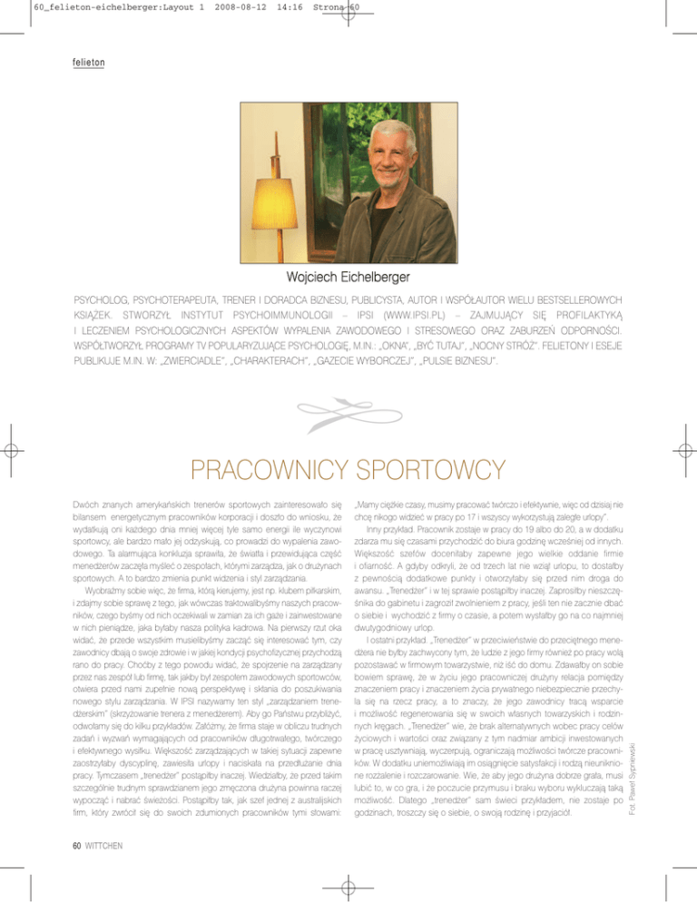 60_felieton-eichelberger:Layout 1 2008-08-12 14:16 Strona 60 felieton Wojciech Eichelberger PSYCHOLOG, PSYCHOTERAPEUTA, TRENER I DORADCA BIZNESU, PUBLICYSTA, AUTOR I WSPÓŁAUTOR WIELU BESTSELLEROWYCH KSIĄŻEK. STWORZYŁ INSTYTUT PSYCHOIMMUNOLOGII – IPSI (WWW.IPSI.PL) – ZAJMUJĄCY SIĘ PROFILAKTYKĄ I LECZENIEM PSYCHOLOGICZNYCH ASPEKTÓW WYPALENIA ZAWODOWEGO I STRESOWEGO ORAZ ZABURZEŃ ODPORNOŚCI. WSPÓŁTWORZYŁ PROGRAMY TV POPULARYZUJĄCE PSYCHOLOGIĘ, M.IN.: „OKNA”, „BYĆ TUTAJ”, „NOCNY STRÓŻ”. FELIETONY I ESEJE PUBLIKUJE M.IN. W: „ZWIERCIADLE”, „CHARAKTERACH”, „GAZECIE WYBORCZEJ”, „PULSIE BIZNESU”. Dwóch znanych amerykańskich trenerów sportowych zainteresowało się bilansem energetycznym pracowników korporacji i doszło do wniosku, że wydatkują oni każdego dnia mniej więcej tyle samo energii ile wyczynowi sportowcy, ale bardzo mało jej odzyskują, co prowadzi do wypalenia zawodowego. Ta alarmująca konkluzja sprawiła, że światła i przewidująca część menedżerów zaczęła myśleć o zespołach, którymi zarządza, jak o drużynach sportowych. A to bardzo zmienia punkt widzenia i styl zarządzania. Wyobraźmy sobie więc, że firma, którą kierujemy, jest np. klubem piłkarskim, i zdajmy sobie sprawę z tego, jak wówczas traktowalibyśmy naszych pracowników, czego byśmy od nich oczekiwali w zamian za ich gaże i zainwestowane w nich pieniądze, jaka byłaby nasza polityka kadrowa. Na pierwszy rzut oka widać, że przede wszystkim musielibyśmy zacząć się interesować tym, czy zawodnicy dbają o swoje zdrowie i w jakiej kondycji psychofizycznej przychodzą rano do pracy. Choćby z tego powodu widać, że spojrzenie na zarządzany przez nas zespół lub firmę, tak jakby był zespołem zawodowych sportowców, otwiera przed nami zupełnie nową perspektywę i skłania do poszukiwania nowego stylu zarządzania. W IPSI nazywamy ten styl „zarządzaniem trenedżerskim” (skrzyżowanie trenera z menedżerem). Aby go Państwu przybliżyć, odwołamy się do kilku przykładów. Załóżmy, że firma staje w obliczu trudnych zadań i wyzwań wymagających od pracowników długotrwałego, twórczego i efektywnego wysiłku. Większość zarządzających w takiej sytuacji zapewne zaostrzyłaby dyscyplinę, zawiesiła urlopy i naciskała na przedłużanie dnia pracy. Tymczasem „trenedżer” postąpiłby inaczej. Wiedziałby, że przed takim szczególnie trudnym sprawdzianem jego zmęczona drużyna powinna raczej wypocząć i nabrać świeżości. Postąpiłby tak, jak szef jednej z australijskich firm, który zwrócił się do swoich zdumionych pracowników tymi słowami: 60 WITTCHEN „Mamy ciężkie czasy, musimy pracować twórczo i efektywnie, więc od dzisiaj nie chcę nikogo widzieć w pracy po 17 i wszyscy wykorzystują zaległe urlopy”. Inny przykład. Pracownik zostaje w pracy do 19 albo do 20, a w dodatku zdarza mu się czasami przychodzić do biura godzinę wcześniej od innych. Większość szefów doceniłaby zapewne jego wielkie oddanie firmie i ofiarność. A gdyby odkryli, że od trzech lat nie wziął urlopu, to dostałby z pewnością dodatkowe punkty i otworzyłaby się przed nim droga do awansu. „Trenedżer” i w tej sprawie postąpiłby inaczej. Zaprosiłby nieszczęśnika do gabinetu i zagroził zwolnieniem z pracy, jeśli ten nie zacznie dbać o siebie i wychodzić z firmy o czasie, a potem wysłałby go na co najmniej dwutygodniowy urlop. I ostatni przykład. „Trenedżer” w przeciwieństwie do przeciętnego menedżera nie byłby zachwycony tym, że ludzie z jego firmy również po pracy wolą pozostawać w firmowym towarzystwie, niż iść do domu. Zdawałby on sobie bowiem sprawę, że w życiu jego pracowniczej drużyny relacja pomiędzy znaczeniem pracy i znaczeniem życia prywatnego niebezpiecznie przechyla się na rzecz pracy, a to znaczy, że jego zawodnicy tracą wsparcie i możliwość regenerowania się w swoich własnych towarzyskich i rodzinnych kręgach. „Trenedżer” wie, że brak alternatywnych wobec pracy celów życiowych i wartości oraz związany z tym nadmiar ambicji inwestowanych w pracę usztywniają, wyczerpują, ograniczają możliwości twórcze pracowników. W dodatku uniemożliwiają im osiągnięcie satysfakcji i rodzą nieuniknione rozżalenie i rozczarowanie. Wie, że aby jego drużyna dobrze grała, musi lubić to, w co gra, i że poczucie przymusu i braku wyboru wykluczają taką możliwość. Dlatego „trenedżer” sam świeci przykładem, nie zostaje po godzinach, troszczy się o siebie, o swoją rodzinę i przyjaciół. Fot. Paweł Sypniewski PRACOWNICY SPORTOWCY