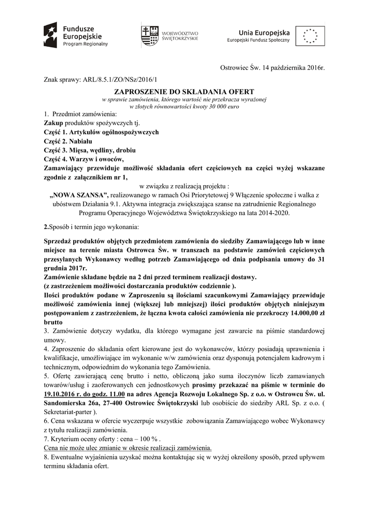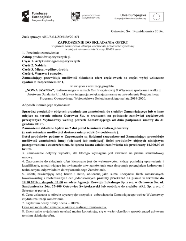 Ostrowiec Św. 14 października 2016r. Znak sprawy: ARL/8.5.1/ZO/NSz/2016/1 ZAPROSZENIE DO SKŁADANIA OFERT w sprawie zamówienia, którego wartość nie przekracza wyrażonej w złotych równowartości kwoty 30 000 euro 1. Przedmiot zamówienia: Zakup produktów spożywczych tj. Część 1. Artykułów ogólnospożywczych Część 2. Nabiału Część 3. Mięsa, wędliny, drobiu Część 4. Warzyw i owoców, Zamawiający przewiduje możliwość składania ofert częściowych na części wyżej wskazane zgodnie z załącznikiem nr 1, w związku z realizacją projektu : „NOWA SZANSA”, realizowanego w ramach Osi Priorytetowej 9 Włączenie społeczne i walka z ubóstwem Działania 9.1. Aktywna integracja zwiększająca szanse na zatrudnienie Regionalnego Programu Operacyjnego Województwa Świętokrzyskiego na lata 2014-2020. 2.Sposób i termin jego wykonania: Sprzedaż produktów objętych przedmiotem zamówienia do siedziby Zamawiającego lub w inne miejsce na terenie miasta Ostrowca Św. w transzach na podstawie zamówień częściowych przesyłanych Wykonawcy według potrzeb Zamawiającego od dnia podpisania umowy do 31 grudnia 2017r. Zamówienie składane będzie na 2 dni przed terminem realizacji dostawy. (z zastrzeżeniem możliwości dostarczania produktów codziennie ). Ilości produktów podane w Zaproszeniu są ilościami szacunkowymi Zamawiający przewiduje możliwość zamówienia innej (większej lub mniejszej) ilości produktów objętych niniejszym postępowaniem z zastrzeżeniem, że łączna kwota całości zamówienia nie przekroczy 14.000,00 zł brutto 3. Zamówienie dotyczy wydatku, dla którego wymagane jest zawarcie na piśmie standardowej umowy. 4. Zaproszenie do składania ofert kierowane jest do wykonawców, którzy posiadają uprawnienia i kwalifikacje, umożliwiające im wykonanie w/w zamówienia oraz dysponują potencjałem kadrowym i technicznym, odpowiednim do wykonania tego Zamówienia. 5. Ofertę zawierającą cenę brutto i netto, obliczoną jako suma iloczynów liczb zamawianych towarów/usług i zaoferowanych cen jednostkowych prosimy przekazać na piśmie w terminie do 19.10.2016 r. do godz. 11.00 na adres Agencja Rozwoju Lokalnego Sp. z o.o. w Ostrowcu Św. ul. Sandomierska 26a, 27-400 Ostrowiec Świętokrzyski lub osobiście do siedziby ARL Sp. z o.o. ( Sekretariat-parter ). 6. Cena wskazana w ofercie wyczerpuje wszystkie zobowiązania Zamawiającego wobec Wykonawcy z tytułu realizacji zamówienia. 7. Kryterium oceny oferty : cena – 100 % . Cena nie może ulec zmianie w okresie realizacji zamówienia. 8. Ewentualne wyjaśnienia uzyskać można kontaktując się w wyżej określony sposób, przed upływem terminu składania ofert. 9. Zamawiający zastrzega sobie możliwość prowadzenia negocjacji w celu ustalenia najkorzystniejszych warunków realizacji Zamówienia, z wybranymi Wykonawcami, którzy złożyli oferty zawierające cenę oraz spełniają wymagania w zakresie właściwości podmiotowej przedmiotu Zamówienia, 10. Realizacja zamówienia zostanie zlecona Wykonawcy, który zaoferował ostatecznie najkorzystniejsze warunki realizacji Zamówienia i przyjął wymagania określone w zaproszeniu do składania ofert oraz zgodził się na zawarcie pisemnej umowy. 11. Zamawiający zastrzega możliwość udzielenia kolejnego zamówienia do wysokości 50% wartości zamówienia określonego w umowie z Wykonawcą w tym samym roku kalendarzowym, jeżeli zachodzi konieczność udzielenia zamówienia tożsamego z uprzednio udzielonym zamówieniem, a udzielenie zamówienia w ten sposób jest z korzyścią dla Zamawiającego. Prezes Zarządu ARL Sp. z o.o. Agnieszka Rogalińska Załącznik nr 1. Nazwa towaru Część 1. Artykuły ogólnospożywcze Nr PKWiU Jednostka miary Bułka tarta 10.72.19.0 kg Cebulka marynowana Op. 290 g Chrzan tarty 200 ml Cukier buraczany 10.81.12.0 KG rafinowany Cukier puder 400 g Cukier waniliowy 10.81.13.0 Opak. 30 g Dżem 10.39.22.0 słoik 280 g Groszek konserwowy 10.39.16.0 Opak. 400 g Grzyby suszone ( Op. 200 g podgrzybek ) Jaja kurze L* Dezynfekowane 01.47.21.0 szt. promieniami UVC Kasza gryczana 10.61.32.0 kg Ketchup opakowanie łagodny/pikantny 480 g (kotlin) Kiełki buraka opak. 40 g Kiełki rzodkiewki opak. 50 g Koncentrat 10.39.17.0 l pomidorowy 30% Kukurydza 10.39.17.0 opak. 340 g konserwowa Kwasek cytrynowy 20.14.34.0 Opak. 20 g Lubczyk ex10.39.13.0 opak. 10 g Maggi w płynie 10.84.12.0 1l Majeranek 10.39.13.0 Opak. 10 g opak. 700 Majonez kielecki ml Makaron Lubella typu 10.73.11.0 Opak. 400 g fale lub równoważny Makaron Lubella typu kokardka lub 10.73.11.0 Opak. 400 g równoważny Makaron Lubella typu łazanki lub 10.73.11.0 Opak. 500 g równoważny Makaron Lubella typu 10.73.11.0 Opak. 500 g nitka cięta lub ilość 30 10 10 20 10 10 10 10 10 100 20 10 10 10 10 10 10 10 10 20 10 20 20 20 20 Cena jednostkowa netto Cena Łączna Łączna jednostkowa cena cena brutto netto brutto równoważny Makaron Lubella typu wstążka cięta lub równoważny Makaron typu świderki Lubella lub równoważny Mąka pszenna typ 500 Mąka ziemniaczana Ogórek konserwowy Olej rzepakowy 10.73.11.0 20 10.73.11.0 10.61.21.0 kg 10.62.11.0 kg opak. 860 g l opak. 140 ml opak. 140 ml 10.41.56.0 Oliwki zielone 10.84.22.0 Opak. 20 g 10.84.22.0 20 g 10.89.13.0 Przyprawa do flaków Przyprawa do gołabków Przyprawa do gulaszu Przyprawa do kurczaka Przyprawa do mięsa mielonego Przyprawa do mięsa wieprzowego Przyprawa do ryb Op. 15 g. Op. 240 g Opak. 30 g 20 g 20 g Opakowanie 20 g opak. 20 g opak. 20 g opak. 20 g opak. 20 g opak. 20 g Op. 20 g Opakowanie 30 g Przyprawa gyros Przyprawa typu Kucharek Ryż Tymbark napój - mix smaków Żurek butelka Opak. 500 g 20 Oliwki czarne Papryka mielona słodka Papryka ostra przyprawa Pieprz ziołowy Powidła śliwkowe Proszek do pieczenia Przyprawa do bigosu Przyprawa do fasoli Opak. 500 g kg 10.61.11.0 10.89.11.0 kg opak. 500 ml l 50 20 10 30 10 10 10 10 10 10 10 10 10 10 10 10 10 10 10 10 20 10 10 1000