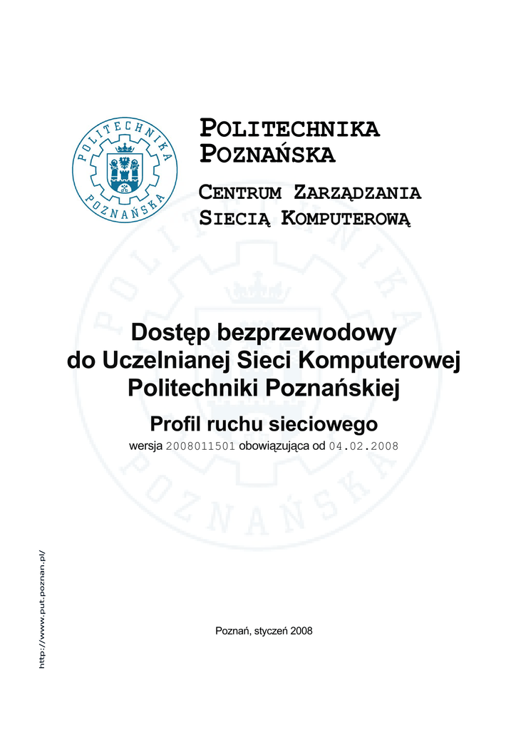 POLITECHNIKA POZNAŃSKA CENTRUM ZARZĄDZANIA SIECIĄ KOMPUTEROWĄ Dostęp bezprzewodowy do Uczelnianej Sieci Komputerowej Politechniki Poznańskiej Profil ruchu sieciowego wersja 2008011501 obowiązująca od 04.02.2008 Poznań, styczeń 2008 Politechnika Poznańska Centrum Zarządzania Siecią Komputerową Dostęp bezprzewodowy do Uczelnianej Sieci Komputerowej Politechniki Poznańskiej Profil ruchu sieciowego wersja 2008011501 obowiązująca od 04.02.2008 Politechnika Poznańska Pl. Marii Skłodowskiej-Curie 5 60-965 Poznań http://www.put.poznan.pl/ Centrum Zarządzania Siecią Komputerową Politechniki Poznańskiej http://www.put.poznan.pl/uczelnia/R3/R3C Dokumentacja w całości ani we fragmentach nie może być powielana, kopiowana, fotokopiowana lub publikowana w celu rozpowszechniania w żadnej formie bez zgody Politechniki Poznańskiej. Opracowano do użytku wewnętrznego. Copyright © 2007-2008 Politechnika Poznańska, Wszelkie prawa zastrzeżone Publikacja w formacie Adobe Portable Document Format (PDF). Publikacja elektroniczna Politechniki Poznańskiej Pl. Marii Skłodowskiej-Curie 5, 60-965 Poznań. Przygotowanie i redakcja tekstu dokumentacji: Centrum Zarządzania Siecią Komputerową Politechniki Poznańskiej. Przygotowanie i redakcja techniczna publikacji elektronicznej dokumentacji: Centrum Zarządzania Siecią Komputerową Politechniki Poznańskiej. Politechnika Poznańska Regulaminy Centrum Zarządzania Siecią Komputerową Dostęp bezprzewodowy do Uczelnianej Sieci Komputerowej Politechniki Poznańskiej. Profil ruchu sieciowego wersja 2008011501 obowiązuje od 04.02.2008 Ruch akceptowany Protokół komunikacyjny TCP UDP Port Protokół usługi sieciowej 22 ssh 25 smtp 53 dns 80 http 110 pop3 119 nntp 143 imap 443 https 465 ssmtp (smtp/ssl) 500 ike 993 simap (imap/ssl) 995 spop3 (pop3/ssl) 5222 jabber 5223 sjabber (jabber/ssl) 6667 irc 53 dns 500 ike Zmiany w profilu możliwość rozszerzenia zakresu ruchu akceptowanego dla usług klasy VPN (Virtual Private Network); pisemny wniosek z uzasadnieniem; zgodność z regulaminem dostępu bezprzewodowego do Uczelnianej Sieci Komputerowej Politechniki Poznańskiej. Centrum Zarządzania Siecią Komputerową Politechniki Poznańskiej - 1 -