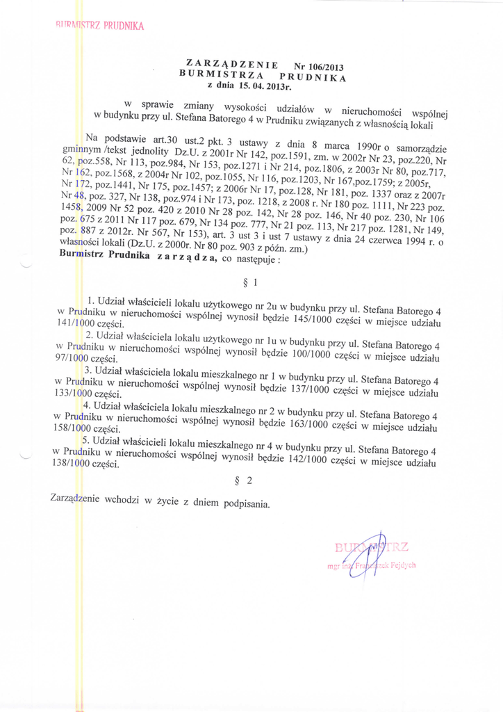 RITPMISTRZ PRUDNIKA ZARZ4DZENIE Nr 106/2013 BURMISTRZA PRUDNIKA z dnia 15. 04. 2013r. w sprawie zmiany wysokosci udzialow w nieruchomosci wspolnej w budynku przy ul. Stefana Batorego 4 w Prudniku zwi^zanych z wlasnoscia^ lokali Na podstawie art.30 ust.2 pkt. 3 ustawy z dnia 8 marca 1990r o samorza^dzie gminnym /tekst jednolity Dz.U. z 200Ir Nr 142, poz. 1591, zm. w 2002r Nr 23, poz.220, Nr 62, poz.558, Nr 113, poz.984, Nr 153, poz. 1271 i Nr 214, poz. 1806, z 2003r Nr 80, poz.717, Nr 162, poz. 1568, z 2004r Nr 102, poz. 1055, Nr 116, poz. 1203, Nr 167,poz. 1759; z 2005r, Nr 172, poz. 1441, Nr 175, poz.1457; z 2006r Nr 17, poz.128, Nr 181, poz. 1337 oraz z 2007r Nr 48, poz. 327, Nr 138, poz.974 i Nr 173, poz. 1218, z 2008 r. Nr 180 poz. 1111, Nr 223 poz. 1458, 2009 Nr 52 poz. 420 z 2010 Nr 28 poz. 142, Nr 28 poz. 146, Nr 40 poz. 230, Nr 106 poz. 675 z 2011 Nr 117 poz. 679, Nr 134 poz. 777,Nr21 poz. 113, Nr 217 poz. 1281, Nr 149, poz. 887 z 2012r. Nr 567, Nr 153), art. 3 ust 3 i ust 7 ustawy z dnia 24 czerwca 1994 r. o wlasnosci lokali (Dz.U. z 2000r. Nr 80 poz. 903 z pozn. zm.) Burmistrz Prudnika z a r z ^ d z a , co naste_puje : § 1. Udzial wlascicieli lokalu uzytkowego nr 2u w budynku przy ul. Stefana Batorego 4 w Prudniku w nieruchomosci wspolnej wynosii b^dzie 145/1000 cz?sci w miejsce udzialu 141/1000cz?sci. 2. Udzial wlasciciela lokalu uzytkowego nr lu w budynku przy ul. Stefana Batorego 4 w Prudniku w nieruchomosci wspolnej wynosii b^dzie 100/1000 cz?sci w miejsce udzialu 97/1000 cz?sci. 3. Udzial wlasciciela lokalu mieszkalnego nr 1 w budynku przy ul. Stefana Batorego 4 w Prudniku w nieruchomosci wspolnej wynosii bejizie 137/1000 cz?sci w miejsce udzialu 133/1000 cz^sci. 4. Udzial wlasciciela lokalu mieszkalnego nr 2 w budynku przy ul. Stefana Batorego 4 w Prudniku w nieruchomosci wspolnej wynosii bedzie 163/1000 cze_sci w miejsce udzialu 158/1000 cz^sci. 5. Udzial wiascicieli lokalu mieszkalnego nr 4 w budynku przy ul. Stefana Batorego 4 w Prudniku w nieruchomosci wspolnej wynosii bgdzie 142/1000 cz?sci w miejsce udzialu 138/lOOOczesci. § 2 Zarza^dzenie wchodzi w zycie z dniem podpisania.