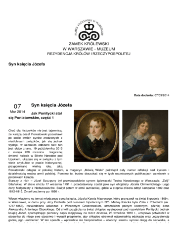 ZAMEK KRÓLEWSKI W WARSZAWIE - MUZEUM REZYDENCJA KRÓLÓW I RZECZYPOSPOLITEJ Syn księcia Józefa Data dodania: 07/03/2014 07 Syn księcia Józefa Mar 2014 Jak Ponitycki stał się Poniatowskim, część 1 Choć dla historyków nie jest tajemnicą, że książę Józef Poniatowski pozostawił po sobie dwóch synów zrodzonych z nieślubnych związków, jak się jednak wydaje, w szerokim odbiorze fakt ten jest słabo znany. 19 października 2013 r. minęła 200 rocznica tragicznej śmierci księcia w Bitwie Narodów pod Lipskiem, ukazało się w związku z tym wiele artykułów w prasie historycznej, przypomniano wielką rolę, jaką Poniatowski odegrał w polskiej historii, a magazyn „Mówią Wieki” poświęcił cały numer refleksji nad życiem i działalnością wodza armii polskiej. Pomimo to, trudno doszukać się w tych rocznicowych publikacjach wzmianek o potomkach księcia. Starszy z nich – Józef Szczęsny był prawdopodobnie synem śpiewaczki Teatru Narodowego w Warszawie, „Zelji” Sitańskiej. W akcie chrztu 17 września 1791 r. przedstawiony został jako syn oficjalisty Józefa Chmielnickiego i jego żony Małgorzaty z Narbutowiczów. Służył potem w armii autriackiej, gdzie w stopniu oficera odbył kampanie 1809 oraz 1812-1815. Zmarł bezżenny po 1860 r. Więcej wiadomo na temat młodszego syna księcia, Józefa Karola Maurycego, który przyszedł na świat 8 grudnia 1809 r. w Warszawie, w domu przy ulicy Podwale pod numerem hipotecznym 525. Matką dziecka była Zofia z Potockich (ok. 1787-1857), rozwiedziona wówczas z Wincentym Czosnowskim, strażnikiem polnym koronnym, póżniej żona Aleksandra Antoniego Oborskiego. Od chwili przyjścia na świat chłopiec występował pod nazwiskiem Ponitycki, jednak książę Józef, sporządzając pierwszy zapis majątkowy na rzecz dziecka, 26 września 1810 r., urzędowo potwierdził w stosunku do niego swe ojcostwo i wyraził pragnienie, aby chłopiec otrzymał odpowiednią edukację oraz „egzystencję godną jego urodzenia”. W ten sposób – wprawdzie nie bezpośrednio – otworzył swemu synowi drogę do nazwiska, a może również i tytułu książęcego Poniatowskich. Przyczyną tego szczególnego wyróżnienia mogła być więź może również i tytułu książęcego Poniatowskich. Przyczyną tego szczególnego wyróżnienia mogła być więź emocjonalna, silniejsza od tej, która łączyła księcia Józefa ze starszym synem, Chmielnickim. Jak się jednak wydaje, głównym tego powodem było arystokratyczne pochodzenie matki, Zofii Potockiej. Resztę formalności dopełniła po śmierci księcia jego siostra i główna spadkobierczyni Maria Teresa Tyszkiewiczowa, która pozbawiła Potocką prawa do opieki nad dzieckiem, przejąwszy ją w 1821 r., a siedem lat później usynowiła Ponityckiego, przekazując mu oficjalnie nazwisko Poniatowski oraz imiona Karol Maurycy. Od 1827 r. Poniatowski (Ponitycki) służył w wojsku francuskim. Jako dymisjonowany podporucznik tychże wojsk wziął udział w powstaniu listopadowym, dosłużywszy się odznaczenia Złotym Krzyżem Orderu Virtuti Militari i awansu do rangi kapitana. Po upadku powstania powrócił do Francji i do końca swych dni służył we francuskiej Armii Afrykańskiej w Algierii. Więcej faktów na temat jego życia, a także jego potomstwa znajdą Państwo w artykule Władysława Stanilewicza „Józef Karol Maurycy Ponitycki – nieślubny syn księcia Józefa Poniatowskiego”, opublikowanym na stronie Stowarzyszenia Regimentów i Pułków Polskich „Arsenał”: http://arsenal.org.pl/index.php/historia/varia/item/748-jozef-karol-maurycy-ponitycki-nieslubny-syn-ksiecia-jozefaponiatowskiego Bardzo gorąco polecam tę lekturę! Natomiast w dzisiejszym poście oraz następnych publikuję treść dokumentów prawnych związanych z Józefem Ponityckim oraz korespondencję Zofii z Potockich Oborskiej 1 voto Czosnowskiej z Marią Teresą Tyszkiewiczową. Treść owych listów przekonuje, że za niewątpliwie słuszną i ze wszech miar korzystną dla przyszłości dziecka decyzją o odebraniu go matce i przekazaniu w opiekę stryjence zamieszkałej w Paryżu krył się bardzo poważny dramat. Wszystkie materiały pochodzą z zasobów krakowskiej Biblioteki Polskiej Akademii Umiejętności, przekazane tam jako legat Franciszka Paszkowskiego, syna generała Dominika Paszkowskiego. Zapis majątkowy księcia Józefa Poniatowskiego na rzecz syna Józefa Ponityckiego oraz urzędowe potwierdzenie ojcostwa (kopia) Biblioteki Polskiej Akademii Umiejętności w Krakowie, sygn. 2651, k. 86 Moi, Joseph prince Poniatowski, je reconnais et m’engage a remettre a la disposition de madame la comtesse Czosnowska née Potocka la somme de 600 ducats, je dis: six cents ducats en or, que je m’engage a payer en deux termes d’année en année jusqu’a ce qu’il soit pris par moi d’autres engagements pour l’entretien et l’éducation du jeune enfant qui se nomme Joseph et dont elle veut bien prendre soin; je m’engage en outre si je venais a mourir de rappeler dans mon testament cet enfant, comme un etre a qui je veux servir de protection et de pere, en lui donnant une existence digne de sa naissance. Fait a Varsovie le 26 septembre 1810. Joseph prince Poniatowski [ręką Zofii z Potockich Czosnowskiej] Zarządzam, że zgodnie z oryginałem Zofia z Potockich Czosnowska Tłumaczenie: Ja, Józef książę Poniatowski, uznaję i zobowiązuję się przekazać do dyspozycji pani hrabiny Czosnowskiej urodzonej Potockiej sumę 600 dukatów, słownie: sześćset dukatów w złocie, którą przyrzekam płacić w dwóch ratach z roku na rok do czasu, gdy nie podejmę innych zobowiązań mających na celu utrzymanie i edukację dziecka o imieniu Józef, którym będzie ona tak uprzejma opiekować się; poza tym na wypadek mojej śmierci zobowiązuję się pamiętać w testamencie o tym dziecku, jako o istocie, której chcę zapewnić opiekę i, jako ojciec, egzystencję godną je