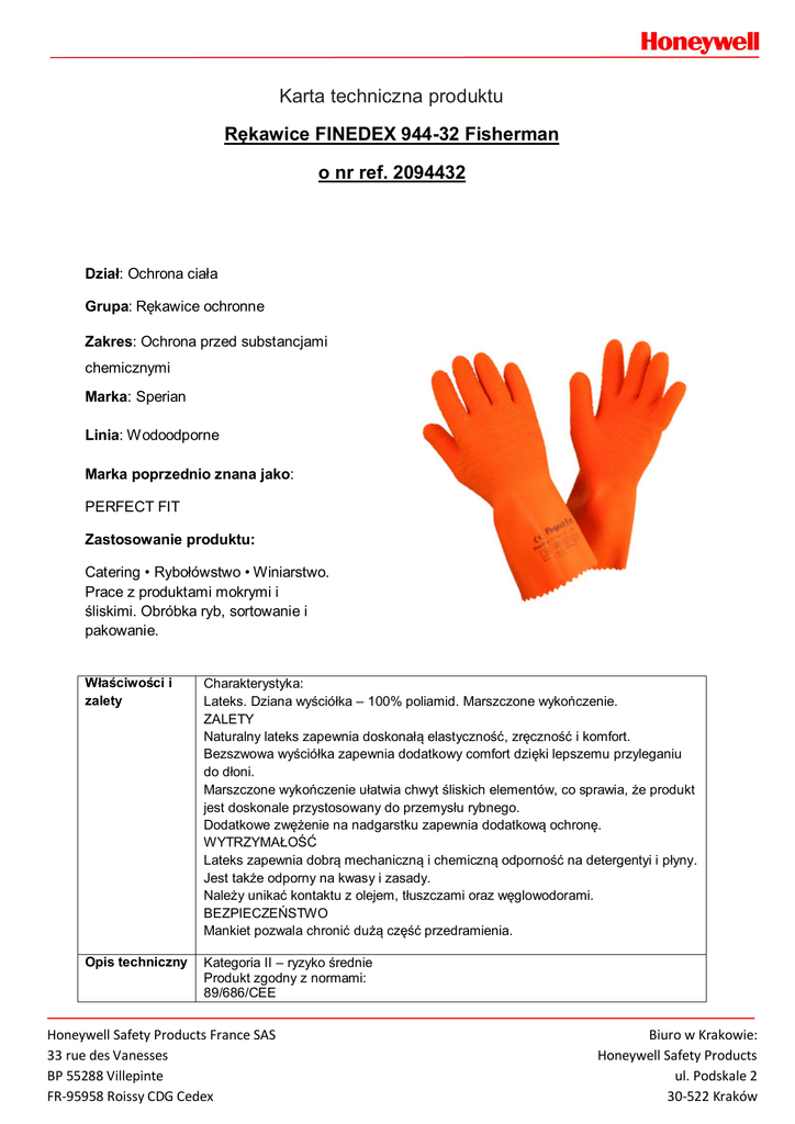 Karta techniczna produktu Rękawice FINEDEX 944-32 Fisherman o nr ref. 2094432 Dział: Ochrona ciała Grupa: Rękawice ochronne Zakres: Ochrona przed substancjami chemicznymi Marka: Sperian Linia: Wodoodporne Marka poprzednio znana jako: PERFECT FIT Zastosowanie produktu: Catering • Rybołówstwo • Winiarstwo. Prace z produktami mokrymi i śliskimi. Obróbka ryb, sortowanie i pakowanie. Właściwości i zalety Charakterystyka: Lateks. Dziana wyściółka – 100% poliamid. Marszczone wykończenie. ZALETY Naturalny lateks zapewnia doskonałą elastyczność, zręczność i komfort. Bezszwowa wyściółka zapewnia dodatkowy comfort dzięki lepszemu przyleganiu do dłoni. Marszczone wykończenie ułatwia chwyt śliskich elementów, co sprawia, że produkt jest doskonale przystosowany do przemysłu rybnego. Dodatkowe zwężenie na nadgarstku zapewnia dodatkową ochronę. WYTRZYMAŁOŚĆ Lateks zapewnia dobrą mechaniczną i chemiczną odporność na detergentyi i płyny. Jest także odporny na kwasy i zasady. Należy unikać kontaktu z olejem, tłuszczami oraz węglowodorami. BEZPIECZEŃSTWO Mankiet pozwala chronić dużą część przedramienia. Opis techniczny Kategoria II – ryzyko średnie Produkt zgodny z normami: 89/686/CEE Honeywell Safety Products France SAS 33 rue des Vanesses BP 55288 Villepinte FR-95958 Roissy CDG Cedex Biuro w Krakowie: Honeywell Safety Products ul. Podskale 2 30-522 Kraków EN 420 – 2003 – Wymagania ogólne EN 388 – 2003 – Zagrożenia mechaniczne EN 407 – 2003 – Zagrożenia termiczne EN 374 – 2008 – Zagrożenia chemiczne Regulacje CE nr 1935/2004 - Dopuszczone do kontaktu z żywnością EN 407 - Ciepło i/lub ogień Zachowanie i/lub ogień : X Odporność na kontakt ze żródłem ciepła : 2 Odporność na ciepło konwekcyjne : X Odporność na ciepło promiennikowe : X Odporność na niewielkie rozpryski metali : X Odporność na rozpryski stopionych metali : X EN 388 - Mechaniczne czynniki ryzyka Odporność na ścieranie : 4 Odporność na przecięcie : 2 Odporność na rozerwanie : 3 Odporność na perforację : 1 Technologia produktu Rękawice ochronne zanurzeniowe Materiał Lateks, poliamid Kolor Pomarańczowy Długośc 30 cm Grubość 1,3 mm Zręczność Klasa 5 Rozmiar 7-11 Certifikaty i zgodność Kategoria UE Środki ochrony osobistej : Klasa 2 Zapewnienie jakości ISO 9001/2000 Numer certyfikacji europejskiej 0075/797/162/11/08/0460 Informacje dodatkowe Pakowanie Minimalne pakowanie po 10 par. Karton 50 par. Czyszczenie W celu zachowania właściwości produktu, rękawic nie należy czyścić. Oznaczenia na rękawicy CE SPERIAN 2094432 XX EN 420 EN 374-2 EN 388 : 4231 EN 407 : X2XXXX Numer instrukcji użytkownika 102 Honeywell Safety Europe SAS Zl Paris Nord II 33 rue des Vanesses BP 50288 95958 Roissy CDG France Biuro w Krakowie: Honeywell Safety Products ul. Podskale 2 30-522 Kraków Deklaracja zgodności WE Producent: SPERIAN PROTECTION EUROPE Immeuble Edison-ZI Paris Nord II 33, Rue des Vanesses 95 958 ROISSY CDG France oświadcza, że środek ochrony indywidualnej: Rękawice FINEDEX 944-32 Fisherman o nr ref. 2094432 Odpowiada wymogom Dyrektywy Rady 89/686/CEE, postanowieniom rozporządzenia Ministra Gospodarki z dnia 21/12/2005 w sprawie zasadniczych wymagań dla środków ochrony indywidualnej (Dz. U. Nr 259, poz. 2172) i jest zgodny z normami zharmonizowanymi o nr EN 374-2, EN 388, EN 407, EN 420 oraz identyczny ze środkiem ochrony indywidualnej będącym przedmiotem certyfikatu zgodności o nr 0075/797/162/11/08/0460 wydanego przez Jednostkę Notyfikowaną o nr 0075: CENTRE TECHNIQUE DU CUIR, 4 rue Hermann Frenkel, 69367 Lyon Cedex 07, France Kraków, 2012-11-30 Dokument wykonany przez: Urszula Jamioska Honeywell Safety Europe SAS Zl Paris Nord II 33 rue des Vanesses BP 50288 95958 Roissy CDG France Biuro w Krakowie: Honeywell Safety Products ul. Podskale 2 30-522 Kraków
