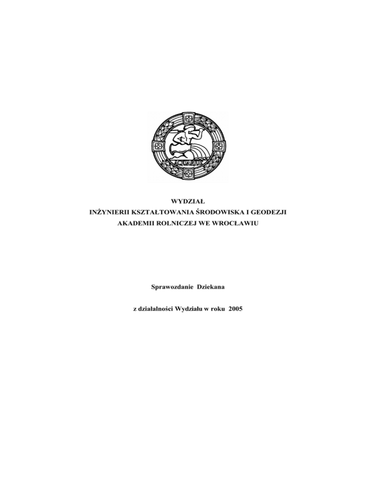 WYDZIAŁ INŻYNIERII KSZTAŁTOWANIA ŚRODOWISKA I GEODEZJI AKADEMII ROLNICZEJ WE WROCŁAWIU Sprawozdanie Dziekana z działalności Wydziału w roku 2005 Spis treści 1. Organizacja Wydziału ...................................................................... 1.1. Rada Wydziału .......................................................................... 1.2. Kolegium Dziekańskie .............................................................. 1.3. Komisje Rady Wydziału ........................................................... 1.4. Komisje Dziekańskie ................................................................. 1.5. Jednostki organizacyjne Wydziału ............................................ 5 5 9 10 13 19 2. Pracownicy Wydziału ....................................................................... 2.1. Stan zatrudnienia ....................................................................... 2.2. Kadra naukowo-dydaktyczna .................................................... 2.3. Rozwój kadr .............................................................................. 2.3.1. Uprawnienia Wydziału do nadawania stopni i tytułu naukowego .................................................................... 2.3.2. Habilitacje ..................................................................... 2.3.3. Doktoraty ...................................................................... 2.4. Udział we władzach i komisjach Uczelni................................... 2.5. Członkostwo w komitetach naukowych PAN ........................... 2.6. Odznaczenia i nagrody .............................................................. 2.6.1. Odznaczenia państwowe nadane przez Prezydenta RP 2.6.2. Odznaczenia Uczelniane ............................................... 2.6.3. Medal „Za zasługi dla Wydziału Inżynierii Kształtowania Środowiska i Geodezji Akademii Rolniczej we Wrocławiu” ................................................................... 2.6.4. Nagrody J. M. Rektora AR we Wrocławiu ................... 27 27 27 31 31 3. Działalność dydaktyczna .................................................................. 3.1. Kształcenie studentów ............................................................... 3.1.1. Oferta dydaktyczna Wydziału ....................................... 3.1.2. Charakterystyka liczbowa procesu dydaktycznego ...... 3.1.3. Działalność Rady Wydziału w zakresie dydaktyki ....... 3.1.4. Sprawność nauczania .................................................... 3.1.5. Studencki ruch naukowy ............................................... 3.1.6. Wyjazdy zagraniczne .................................................... 3.2. Studia doktoranckie w dyscyplinie kształtowanie środowiska ...... 3.2.1. Uczestnicy studiów ....................................................... 3.2.2. Plan studiów .................................................................. 3.2.3. Przebieg studiów ........................................................... 3.3. Studia podyplomowe ................................................................. 31 32 35 38 40 40 40 40 42 44 44 44 45 47 47 54 70 73 73 74 75 76 4. Działalność naukowo-badawcza ...................................................... 4.1. Projekty badawcze finansowane przez KBN ............................ 4.2. Działalność statutowa i badania własne (habilitacje, doktoraty, granty wewnętrzne) ................................................................... 78 78 80 Najważniejsze osiągnięcia jednostek organizacyjnych (wg kierowników poszczególnych jednostek) ................................. 5.1. Instytut Budownictwa i Architektury Krajobrazu ..................... 5.2. Instytut Inżynierii Środowiska .................................................. 5.3. Instytut Kształtowania i Ochrony Środowiska .......................... 5.4. Katedra Geodezji i Fotogrametrii .............................................. 5.5. Katedra Matematyki .................................................................. 5.6. Katedra Planowania i Urządzania Terenów Wiejskich ............. 5.7. Katedra Rolniczych Podstaw Kształtowania Środowiska ......... 5.8. Wydziałowe Laboratorium Komputerowe ................................ 81 81 81 83 88 94 96 97 97 6. Konferencje, sympozja i seminaria naukowe ................................. 99 7. Współpraca z gospodarką ................................................................ 101 7.1. Wykaz podpisanych umów ........................................................ 101 8. Współpraca z zagranicą ................................................................... 105 8.1. Wykaz realizowanych umów i tematów badawczych ............... 105 9. Budżet ................................................................................................ 122 5. 10. Remonty i obsługa ............................................................................. 127 10.1. Remonty ................................................................................... 127 10.2. Obsługa ..................................................................................... 127 11. Podsumowanie ................................................................................... 128 5 1. Organizacja Wydziału W okresie sprawozdawczym, od 1 stycznia do 31 grudnia 2005 r.*), działalność Wydziału Inżynierii Kształtowania Środowiska i Geodezji Akademii Rolniczej we Wrocławiu (Wydział) i władz dziekańskich określały następujące akty prawne: • Ustawa o szkolnictwie wyższym z dnia 12.09.1990 r. (Dz. U. Nr 65, poz. 385 ze zmianami) oraz, od 1.09.2005 r., ustawa z dnia 27 lipca 2005 r. Prawo o szkolnictwie wyższym (Dz. U. Nr 164, poz. 1365), • Ustawa o stopniach i tytule naukowym oraz o stopniach i tytule w zakresie sztuki z dnia 14 marca 2003 r. (Dz. U. Nr 65, poz. 595), • Statut Akademii Rolniczej we Wrocławiu (Uczelnia) uchwalony przez Senat w dniu 24.05.1991 r.
