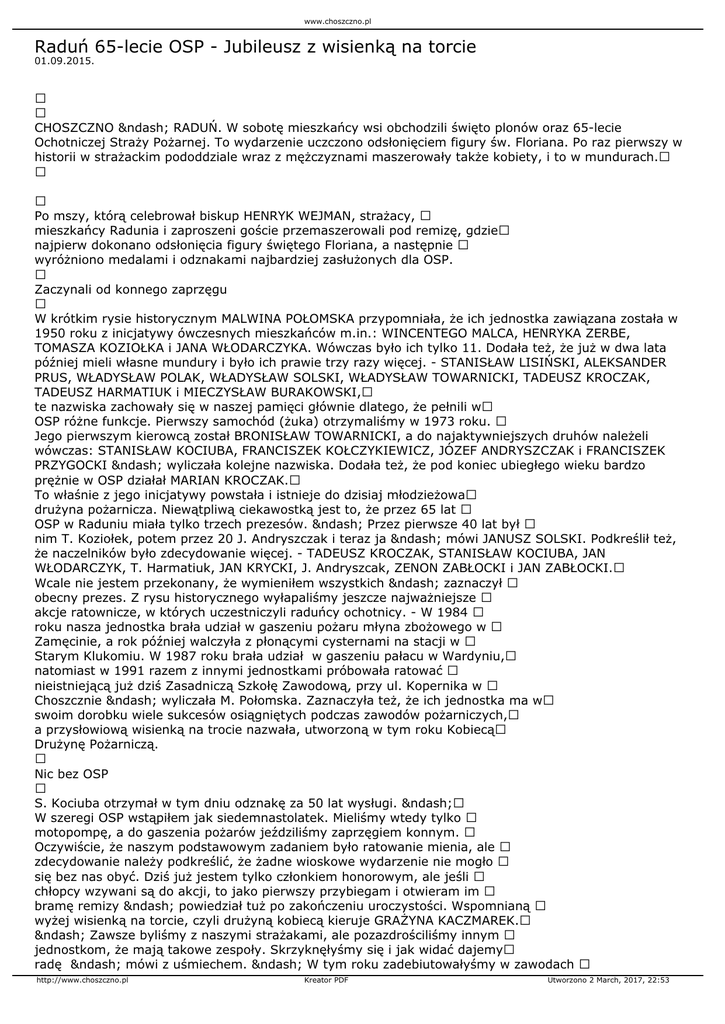 W szeregi OSP wstąpiłem jak siedemnastolatek. Mieliśmy wtedy tylko motopompę, a do gaszenia pożarów jeździliśmy zaprzęgiem konnym. Oczywiście, że naszym podstawowym zadaniem było ratowanie mienia, ale zdecydowanie należy podkreślić, że żadne wioskowe wydarzenie nie mogło się bez nas obyć. Dziś już jestem tylko członkiem honorowym, ale jeśli chłopcy wzywani są do akcji, to jako pierwszy przybiegam i otwieram im bramę remizy – powiedział tuż po zakończeniu uroczystości. Wspomnianą wyżej wisienką na torcie, czyli drużyną kobiecą kieruje GRAŻYNA KACZMAREK.