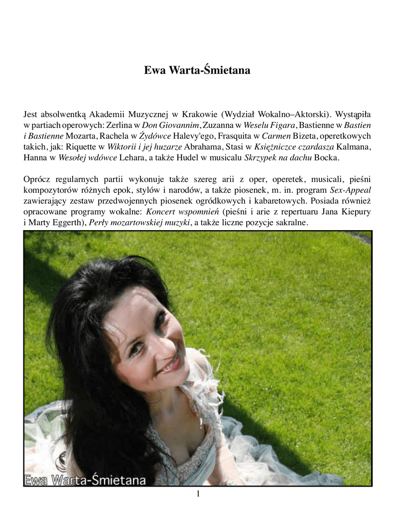 Ewa Warta-Śmietana Jest absolwentką Akademii Muzycznej w Krakowie (Wydział Wokalno–Aktorski). Wystąpiła w partiach operowych: Zerlina w Don Giovannim, Zuzanna w Weselu Figara, Bastienne w Bastien i Bastienne Mozarta, Rachela w Żydówce Halevy'ego, Frasquita w Carmen Bizeta, operetkowych takich, jak: Riquette w Wiktorii i jej huzarze Abrahama, Stasi w Księżniczce czardasza Kalmana, Hanna w Wesołej wdówce Lehara, a także Hudel w musicalu Skrzypek na dachu Bocka. Oprócz regularnych partii wykonuje także szereg arii z oper, operetek, musicali, pieśni kompozytorów różnych epok, stylów i narodów, a także piosenek, m. in. program Sex-Appeal zawierający zestaw przedwojennych piosenek ogródkowych i kabaretowych. Posiada również opracowane programy wokalne: Koncert wspomnień (pieśni i arie z repertuaru Jana Kiepury i Marty Eggerth), Perły mozartowskiej muzyki, a także liczne pozycje sakralne. 1 2 Z myślą o niej współczesny kompozytor Adama Walaciński napisał cykl pieśni, których prawykonanie miało miejsce w czerwcu 2001 podczas Festiwalu Muzyki Współczesnej w Krakowie. Powyższy repertuar wykonuje na licznych festiwalach, m. in. Europejskim Festiwalu im. Jana Kiepury w Krynicy, (na zaproszenie Bogusława Kaczyńskiego), Międzynarodowym Festiwalu Muzycznym im. Krystyny Jamroz w Busku Zdroju, Międzynarodowym Festiwalu Chopin w barwach jesieni w Antoninie, Letnich Festiwalach Muzycznych w Krynicy Zdroju (organizowanych przez Krynickie Towarzystwo Kulturalne im. Jana Kiepury). Festiwalu Muzycznego Dziedzictwa Narodów w Lądku Zdroju, Narodowym Polskim Festiwalu Pieśni Piosenki i Poezji Patriotycznej Bogu i Ojczyźnie w Lubaczowie, Festiwalach Muzyki Współczesnej i Muzyki Żydowskiej w Krakowie, Porankach Wiedeńskich w Krakowie, Festiwalach w Wisconsin Dells Parkway w USA, licznych prestiżowych koncertach w Polsce (Filharmonia Narodowa, Filharmonia Krakowska, Zamek Królewski w Warszawie, na Wawelu, w Collegium Maius, Pałacu Prymasowskim w Warszawie, na Kongresach Esperantystów, w placówkach dyplomatycznych) i poza jej granicami m.in. kilkakrotnie w Austrii (mi. in. Uniwersytecie A. Brucknera i Ratuszu w Linzu, Bazylice Św. Wawrzyńca w Enns-Lorch), wielokrotnie w Szwecji m.in. recitale w Norrlandsoperan w Umeå oraz Konsulacie Generalnym Rzeczypospolitej Polskiej w Sztokholmie, Malmö, a także Izraelu, krajach byłej Jugosławii, Węgrzech, Niemczech, Słowacji, Rosji. 3 4 W maju 2009 roku na zaproszenie Chińskiego Ministerstwa Kultury oraz Ambasady RP w Pekinie odbyła tournée po Chinach, występując w największych i najbardziej prestiżowych salach koncertowych: Pekin - Forbidden City Concert Hall (Zakazane Miasto), Meizhou - Miejskie Centrum Sztuki Liang Sheng Ludu Hakka, Qingdao - Qingdao Concert Hall. Posiada bogaty dorobek nagraniowy. Z początkiem lat dziewięćdziesiątych ubiegłego stulecia wystąpiła w filmie biograficznym o dyrygencie Leopoldzie Kozłowskim - The Last Klezmer, który w 1995 roku otrzymał nominację do Oscara w kategorii filmów dokumentalnych. Latem 1999 roku została zaproszona do nagrania wokaliz w fonograficznym zapisie Pana Tadeusza na płytach CD. Wiosną roku 2001 nagrała solową płytę Kto me usta całuje (OKO-ART, OACD 2001-00001) zawierającą znane arie operetkowe i musicalowe. Jesienią 2001, wraz z innymi krakowskimi wokalistami nagrała płytę kolęd i pastorałek A pokój na ziemi (OKO-ART, OACD 2001-00007). W październiku 2006 roku zarejestrowała recitalową płytę Yerushalayim z muzyką żydowską. W maju 2007 roku nagrała płytę Ave Maria zawierającą znane utwory muzyki sakralnej kompozytorów różnych epok (FC001), a w listopadzie dwie płyty: Ten drogi Lwów, z nagraniami dokonanymi wspólnie z laureatami Pierwszego Ogólnopolskiego Konkursu Piosenki Lwowskiej w Krakowie, oraz Kolędowy czas, zawierającą wybór kolęd, pastorałek oraz utworów instrumentalnych wprowadzających w nastrój Świąt Bożego Narodzenia.W 2009 roku nagrała 5 płytę Jan Paweł II - Santo Subito, oprawioną w muzykę takich kompozytorów, jak m. in.: Astor Piazzola, Ennio Morricone, Edward Pałłasz. Wśród utworów znalazły się między innymi takie, jak: Nella Fantasia, będąca wokalną adaptacją przewodniego motywu z filmu Misja, czy Spente Le Stelle, napisana po śmierci Jana Pawła II przez kompozytora Gastone de Murta (FC002), a w 2010 płytę CD i DVD pod wspólnym tytułem Nie wszystek umrę w 200 rocznicę urodzin - twórczość Chopina i dla Chopina (FC003, FC004)) .Współwykonawcą tych ostatnich płyt są m.in.: pianistka Krystyna Man Li Szczepańska, aktor Jerzy Trela. Jej głos został utrwalony również na nagraniach CD i DVD Zespołu Pieśni i Tańca Uniwersytetu Jagiellońskiego Słowianki, (którego solistką była w czasach studenckich), na płytach: The Christmas Carols z towarzyszeniem Orkiestry Dętej SOLVAY (OKO-ART, 0ACD 2002-00010), płycie jubileuszowej Nasza Pani Makowska w 30. lecie koronacji obrazu Matki Bożej Makowskiej (1979-2009), a także na potrzeby radia RAK, cykl pieśni w języku starojapońskim. Kilka w/w płyt doczekało się już wznowień, m.in.: Ave Maria, oraz Yerushalayim) pod nowym tytułem Miasteczko Bełz). Oprócz działalności artystycznej Ewa Warta-Śmietana pełni funkcję Prezesa Fundacji Pomocy Artystom Polskim CZARDASZ, dyrektora konkursu operetkowo-musicalowego im. Iwony Borowickiej (jedynego w Polsce pod względem merytorycznym), a także dyrektora Majowego Festiwalu Muzycznego w Kazimierzu Dolnym. 6