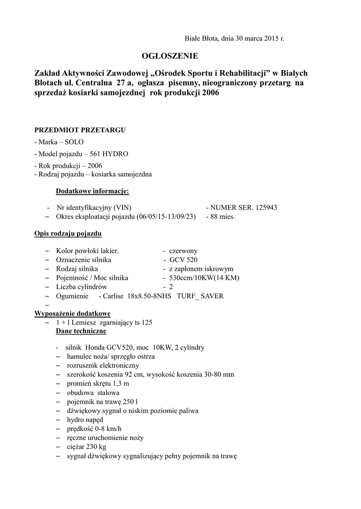 Białe Błota, dnia 30 marca 2015 r. OGŁOSZENIE Zakład Aktywności Zawodowej „Ośrodek Sportu i Rehabilitacji” w Białych Błotach ul. Centralna 27 a, ogłasza pisemny, nieograniczony przetarg na sprzedaż kosiarki samojezdnej rok produkcji 2006 PRZEDMIOT PRZETARGU - Marka – SOLO - Model pojazdu – 561 HYDRO - Rok produkcji – 2006 - Rodzaj pojazdu – kosiarka samojezdna Dodatkowe informacje: - Nr identyfikacyjny (VIN) – Okres eksploatacji pojazdu (06/05/15-13/09/23) - NUMER SER. 125943 - 88 mies. Opis rodzaju pojazdu – Kolor powłoki lakier. - czerwony – Oznaczenie silnika - GCV 520 – Rodzaj silnika - z zapłonem iskrowym – Pojemność / Moc silnika - 530ccm/10KW(14 KM) – Liczba cylindrów - 2 – Ogumienie - Carlise 18x8.50-8NHS TURF_ SAVER – Wyposażenie dodatkowe – 1 + l Lemiesz zgarniający ts 125 Dane techniczne – – – – – – – – – – – – silnik Honda GCV520, moc 10KW, 2 cylindry hamulec noża/ sprzęgło ostrza rozrusznik elektroniczny szerokość koszenia 92 cm, wysokość koszenia 30-80 mm promień skrętu 1,3 m obudowa stalowa pojemnik na trawę 250 l dźwiękowy sygnał o niskim poziomie paliwa hydro napęd prędkość 0-8 km/h ręczne uruchomienie noży ciężar 230 kg sygnał dźwiękowy sygnalizujący pełny pojemnik na trawę Cena wywoławcza wynosi: brutto 2500,00 PLN (słownie: polskich złotych: dwa tysiące pięćset 00/100) Wystawioną do sprzedaży kosiarę samojezdną można oglądać w dni pracy w Zakładzie Aktywności Zawodowej „Ośrodku Sportu i Rehabilitacji” w Białych Błotach, ul. Centralna 27 a, tj. od poniedziałku do piątku w godz. 800 – 1500 od dnia publikacji ogłoszenia do dnia poprzedzającego składanie ofert. Przetarg odbędzie się w dniu 15 kwietnia 2015 r. o godz. 9:30 w siedzibie Zakładu Aktywności Zawodowej „Ośrodka Sportu i Rehabilitacji” w Białych Błotach, ul. Centralna 27 a. Osoba, która wygra przetarg zobowiązana będzie do odbioru pojazdu na włany koszt i ryzyko. Warunkiem udziału w przetargu jest: - wpłacenie wadium w wysokości 10% ceny wywoławczej na rachunek bankowy nr 76 8142 1020 0406 3399 2000 0001 prowadzony przez Bank Spółdzielczy w Bydgoszczy odział w Białych Błotach, do dnia 15 kwietnia 2015 r do godziny 9.00 (liczy się data i godzina uznania środków na koncie sprzedającego) - złożenie pisemnej oferty ( załącznik nr 1) w Sekretariacie Zakładu Aktywności Zawodowej „Ośrodka Sportu i Rehabilitacji” w Białych Błotach ul. Centralna 27 a, do dnia 15 kwietnia 2015 r do godziny 900. Każdy oferent może złożyć tylko jedną ofertę. Sprzedający nie dopuszcza składania ofert wariantowych. Oferta powinna być złożona w zamkniętej kopercie z opisem „Przetarg nieograniczony ofertowy – na kosiarkę samojezdną SOLO„ i zawierać: - ofertę cenową brutto w PLN , - dane osobowe Oferenta lub dane firmy, - potwierdzenie wpłaty wadium, - oświadczenie, że oferent zapoznał się z warunkami udziału w postępowaniu i przedmiotem sprzedaży oraz nie wnosi do nich zastrzeżeń. Kryterium wyboru oferty jest: najwyższa cena. Oferty zawierające cenę poniżej ceny wywoławczej zostaną odrzucone. Jeżeli w postępowaniu nie można dokonać wyboru oferty najkorzystniejszej ze względu na to, że zostały złożone oferty o takiej samej cenie, Sprzedający wezwie Oferentów, którzy złożyli te oferty, do złożenia ofert dodatkowych, nie niższych niż ceny zaoferowane pierwotnie, w terminie określonym przez Sprzedającego. Wadium złożone przez oferentów, których oferty nie zostaną przyjęte, zostanie zwrócone na wskazane w ofercie konto w ciągu 7 dni od daty zamknięcia przetargu lub jego odwołania, a oferentowi, którego oferta została przyjęta zostanie zaliczone na poczet należności. Wadium oferenta, którego oferta została wybrana przepada jeżeli uchyla się on od kupna. Termin rozpatrzenia i wyboru najkorzystniejszej oferty w ciągu 7 dni od otwarcia ofert. Umowa na sprzedaż samochodu musi być podpisana przez oferenta w terminie trzech dni od otrzymania pisemnej wiadomości o wyborze złożonej oferty wraz z dokonaniem zapłaty zaoferowanej ceny zakupu. Wydanie pojazdu nastąpi niezwłocznie po podpisaniu umowy kupna-sprzedaży. Zakład Aktywności Zawodowej „Ośrodek Sportu i Rehabilitacji” w Białych Błotach, nie bierze odpowiedzialności za wady ukryte w oferowanej do sprzedaży kosiarce samojezdnej SOLO. Załącznik nr 1 FORMULARZ OFERTOWY Dane Wnioskodawcy Nazwisko i imię / Firma : ………………………………………………………………….. ………………………………………………………………………………....................... Adres / Siedziba : …………………………………………………………………………... ………………………………………………………………………………....................... PESEL / NIP : ………………………………………………………………………………. Numer telefonu………..…………………………….……………………………………….. Numer konta bankowego ( zwrot wadium) ………..…………………………….………………………………………........................... W nawiązaniu do ogłoszenia o drugim nieograniczonym przetargu na sprzedaż kosiarki samojezdnej SOLO z Zakładu Aktywności Zawodowej „Ośrodka Sportu i Rehabilitacji” w Białych Błotach, oferuję cenę zakupu ……………………. zł brutto (słownie złotych polskich:.......................................... ………………………………………………………….) 1. Zgadzam się na przetwarzanie moich danych osobowych do celów niniejszego przetargu. 2. Oświadczam, że zapoznałem/am się ze stanem przedmiotu przetargu i nie wnoszę do niego zastrzeżeń. ........................................ dnia .......................... (miejscowoś