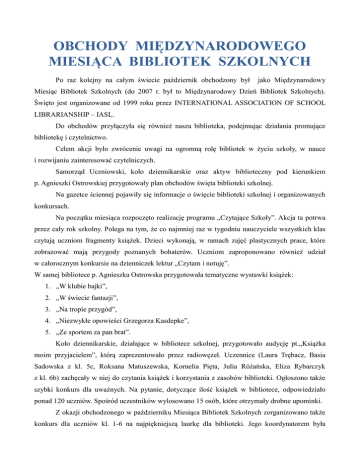 OBCHODY MIĘDZYNARODOWEGO MIESIĄCA BIBLIOTEK SZKOLNYCH Po raz kolejny na całym świecie październik obchodzony był jako Międzynarodowy Miesiąc Bibliotek Szkolnych (do 2007 r. był to Międzynarodowy Dzień Bibliotek Szkolnych). Święto jest organizowane od 1999 roku przez INTERNATIONAL ASSOCIATION OF SCHOOL LIBRARIANSHIP – IASL. Do obchodów przyłączyła się również nasza biblioteka, podejmując działania promujące bibliotekę i czytelnictwo. Celem akcji było zwrócenie uwagi na ogromną rolę bibliotek w życiu szkoły, w nauce i rozwijaniu zainteresować czytelniczych. Samorząd Uczniowski, koło dziennikarskie oraz aktyw biblioteczny pod kierunkiem p. Agnieszki Ostrowskiej przygotowały plan obchodów święta biblioteki szkolnej. Na gazetce ściennej pojawiły się informacje o święcie biblioteki szkolnej i organizowanych konkursach. Na początku miesiąca rozpoczęto realizację programu „Czytające Szkoły”. Akcja ta potrwa przez cały rok szkolny. Polega na tym, że co najmniej raz w tygodniu nauczyciele wszystkich klas czytają uczniom fragmenty książek. Dzieci wykonają, w ramach zajęć plastycznych prace, które zobrazować mają przygody poznanych bohaterów. Uczniom zaproponowano również udział w całorocznym konkursie na dzienniczek lektur „Czytam i notuję”. W samej bibliotece p. Agnieszka Ostrowska przygotowała tematyczne wystawki książek: 1. „W klubie bajki”, 2. „W świecie fantazji”, 3. „Na tropie przygód”, 4. „Niezwykłe opowieści Grzegorza Kasdepke”, 5. „Ze sportem za pan brat”. Koło dziennikarskie, działające w bibliotece szkolnej, przygotowało audycję pt.„Książka moim przyjacielem”, którą zaprezentowało przez radiowęzeł. Uczennice (Laura Trębacz, Basia Sadowska z kl. 5c, Roksana Matuszewska, Kornelia Pięta, Julia Różańska, Eliza Rybarczyk z kl. 6b) zachęcały w niej do czytania książek i korzystania z zasobów biblioteki. Ogłoszono także szybki konkurs dla uważnych. Na pytanie, dotyczące ilość książek w bibliotece, odpowiedziało ponad 120 uczniów. Spośród uczestników wylosowano 15 osób, które otrzymały drobne upominki. Z okazji obchodzonego w październiku Miesiąca Bibliotek Szkolnych zorganizowano także konkurs dla uczniów kl. 1-6 na najpiękniejszą laurkę dla biblioteki. Jego koordynatorem była p. Agnieszka Ostrowska. Do konkursu zgłoszono 40 prac. Kartki były bardzo kolorowe i pomysłowe. W związku z licznym udziałem dzieci, jury w składzie: p.Marta Pohl, p.Beata Wolna i p.Agnieszka Ostrowska, postanowiło przyznać, oprócz trzech pierwszych miejsc, także kilka wyróżnień. Oto lista nagrodzonych uczniów: Miejsce 1- Aleksander Maziec 1f, Miejsce 2 - Maksym Stadnik 3a i Jakub Katner 3b, Miejsce 3 - Zofia Marcinkowska 1f. Wyróżnienia otrzymali: Agata Obrębowska 2c, Julia Fabian 4c, Maria Kolanko 3b, Tomasz Wieczorek 1d. Wszystkie prace zostały zaprezentowane w Galerii Talentów przy sali 24. Drugim konkursem, organizowanym z okazji święta biblioteki był „Chochlik książkowy”. Uczestnicy klas 3-6 przez cały miesiąc rozwiązywali zadania konkursowe, które publikowane były na gazetkach ściennych oraz dostarczane za pośrednictwem e- dziennika. W konkursie uczestniczyło 13 osób: Maria Kolanko (3b), Oskar Kapustka (3c), Jędrzej Rakowicz (3c), Wiktoria Kroma (4b), Oliwia Cembrowska (4c), Aleksandra Dolińska (4c), Julia Fabian (4c), Marek Kamiński (4c), Jakub Pakuła (4c), Julia Wakulewicz (5a), Klaudia Wamberska (5c), Roksana Matuszewska (6b), Julia Różańska (6b). Wszyscy uczestnicy zdobyli taką samą ilość punktów i dlatego, decyzją organizatora konkursu, wymienieni uczniowie otrzymali pamiątkowe dyplomy za udział w zabawie. Niespodzianki dla dzieci, biorących udział w przygotowanych atrakcjach, przygotowały: p. Beata Wolna i p. Agnieszka Ostrowska. Dzięki obchodom tego międzynarodowego święta uczniowie mieli okazję lepiej poznać bibliotekę szkolną, a nauczyciele bibliotekarze swoich czytelników. Agnieszka Ostrowska