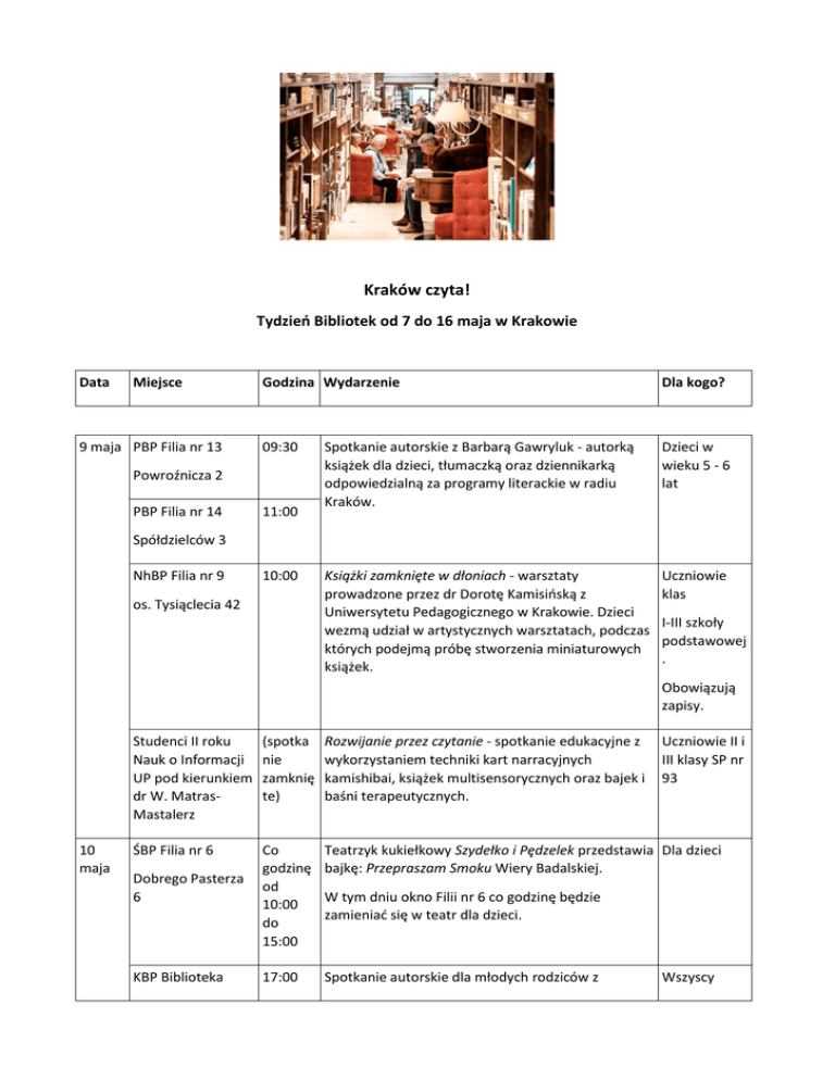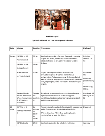 Kraków czyta! Tydzień Bibliotek od 7 do 16 maja w Krakowie Data Miejsce 9 maja PBP Filia nr 13 Godzina Wydarzenie Dla kogo? 09:30 Spotkanie autorskie z Barbarą Gawryluk - autorką książek dla dzieci, tłumaczką oraz dziennikarką odpowiedzialną za programy literackie w radiu Kraków. Dzieci w wieku 5 - 6 lat Książki zamknięte w dłoniach - warsztaty prowadzone przez dr Dorotę Kamisińską z Uniwersytetu Pedagogicznego w Krakowie. Dzieci wezmą udział w artystycznych warsztatach, podczas których podejmą próbę stworzenia miniaturowych książek. Uczniowie klas Powroźnicza 2 PBP Filia nr 14 11:00 Spółdzielców 3 NhBP Filia nr 9 10:00 os. Tysiąclecia 42 I-III szkoły podstawowej . Obowiązują zapisy. 10 maja Studenci II roku Nauk o Informacji UP pod kierunkiem dr W. MatrasMastalerz (spotka nie zamknię te) Rozwijanie przez czytanie - spotkanie edukacyjne z wykorzystaniem techniki kart narracyjnych kamishibai, książek multisensorycznych oraz bajek i baśni terapeutycznych. ŚBP Filia nr 6 Co godzinę od 10:00 do 15:00 Teatrzyk kukiełkowy Szydełko i Pędzelek przedstawia Dla dzieci bajkę: Przepraszam Smoku Wiery Badalskiej. 17:00 Spotkanie autorskie dla młodych rodziców z Dobrego Pasterza 6 KBP Biblioteka Uczniowie II i III klasy SP nr 93 W tym dniu okno Filii nr 6 co godzinę będzie zamieniać się w teatr dla dzieci. Wszyscy Główna Magdaleną Fabritius, autorką książki: Masaż Niemowląt krok po kroku, czyli jak się cieszyć rodzicielstwem dzień po dniu. chętni Jak powstaje komiks? - interaktywne warsztaty dla młodzieży poprowadzą Michał Jankowski i Jędrzej Chojnacki. Młodzież gimnazjalna. 19:00 Spotkanie z Michałem Koziołem, autorem książki Wokół Biprostalu, które zainauguruje cykl - objęty patronatem Rady Dzielnicy V - Porozmawiajmy o Krowodrzy. Wszyscy chętni 11:00 Malowanie muralu literackiego wg projektu wyłonionego w ramach konkursu plastycznego Biblioteka, mama, tata i ja. Uczniowie Szkoły Podstawowej nr 43 17:00 Moja książka z wyobraźnią - warsztaty tworzenia pełnych niespodzianek i kolorów książek z origami. Zajęcia poprowadzą Krystyna i Wojciech Burczyk instruktorzy Polskiego Centrum Origami. Dla dzieci 9 12 lat 18:00 Autostopem do Pekinu - slajdowisko poprowadzi Jakub Rydkodym, podróżnik i autor bloga plecakwspomnien.pl. Wszyscy chętni 12:00 Mitologia wg Agaty Christie - spotkanie literackie dla fanów kryminałów i prozy sensacyjnej. Na zakończenie odbędzie się recital pt. Kryminalna ballada w wykonaniu Łukasza Kozuba - artysty kabaretu Loch Camelot. Wszyscy chętni Królewska 59 11 maja PBP Filia nr 17 16:00 Łużycka 55 KBP Biblioteka Główna Królewska 59 12 maja PBP Filia nr 5 Chałubińskiego 47 NhBP Filia nr 4 os. Zgody 7 KBP Filia nr 5 Radzikowskiego 29 13 ŚBP Filia nr 16 maja Aleja Pokoju 33 2016 r. (piątek ) Obowiązują zapisy. Obowiązują zapisy. Dla uczestników biblioteka przygotowała quiz z nagrodami. UP Czytaj, dowiedz się więcej - akcja organizowana Słuchacze przez studentów Uniwersytetu Pedagogicznego pod Uniwersytetu kierunkiem dr Wandy Matras-Mastalerz. III Wieku przy UP w Krakowie Ingardena 4 14 maja KBP Biblioteka Główna Królewska 59 Od 09:00 do 18:00 Pomóż napełnić głodne psie brzuszki, w zamian dostaniesz książkę do poduszki! Biblioteka organizuje zbiórkę karmy dla schroniska: Fundacja Opieki Nad Zwierzętami Bezdomnymi Przytulisko, Busko-Zdrój oraz dla Stowarzyszenia Dog Rescue. Wszyscy chętni PBP Biblioteka Główna Powroźnicza 2 Od 10:00 do 14:00 Byłem królem - ponad 750 lat istnienia Bractwa Kurkowego w Krakowie przybliży król kurkowy AD 2007/08 prof. Czesław Dźwigaj. Wszyscy chętni W stroju z epoki, z insygniami władzy monarszej, które są równocześnie symbolem bractwa, czyli srebrnym kurem, podzieli się tajnikami tradycji i zwyczajów Towarzystwa Strzeleckiego Bractwo Kurkowe w Krakowie. Bezpiecznie i już. Nasze bezpieczeństwo przede wszystkim zależy od nas. Porad udzielą policjanci z V Komisariatu Policji w Krakowie. Zapraszamy wszystkich chętnych w dowolnym wieku, mówimy o różnych sytuacjach, odpowiadamy na wszystkie pytania. Ciekawscy mogą zajrzeć do prawdziwego radiowozu. Krynoliny i nie tylko – porozmawiamy i przyglądniemy się modzie z dawnych lat. Spotkanie poprowadzą członkowie Stowarzyszenia Krynolina, które zrzesza pasjonatów historii ubioru i życia codziennego w szczególności z lat 1700-1930. Będzie także okazja do zobaczenia rekonstrukcji ubiorów historycznych z rozmaitych epok. Więcej na www.miastoliteratury.pl Krakowskie Biuro Festiwalowe to wiodąca polska instytucja realizująca najważniejsze wydarzenia kulturalne w skali kraju i Europy. Organizuje prestiżowe festiwale: Misteria Paschalia i Sacrum Profanum, jest także promotorem takich projektów kulturalnych jak: Festiwal Muzyki Filmowej, Międzynarodowy Festiwal Kina Niezależnego Netia Off Camera, cykl Opera Rara, czy literacki Festiwal Conrada. KBF jest także wydawcą magazynu „Karnet”, operatorem Centrum Kongresowego ICE Kraków oraz Krakow Film Commission, operatorem wydarzeń kulturalnych w Kraków Arenie. Dodatkowo administruje punktami sieci informacji miejskiej InfoKraków, a także prowadzi portale Krakow.travel i Kids In Kraków. Krakowskie Biuro Festiwalowe jest również operatorem programu Miasta Literatury UNESCO. Więcej na: www.biurofestiwalowe.pl