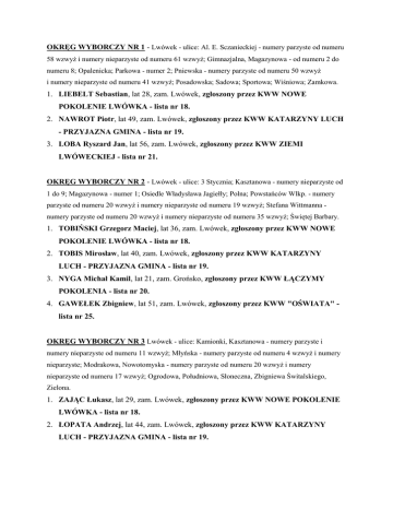 OKRĘG WYBORCZY NR 1 - Lwówek - ulice: Al. E. Sczanieckiej - numery parzyste od numeru 58 wzwyż i numery nieparzyste od numeru 61 wzwyż; Gimnazjalna, Magazynowa - od numeru 2 do numeru 8; Opalenicka; Parkowa - numer 2; Pniewska - numery parzyste od numeru 50 wzwyż i numery nieparzyste od numeru 41 wzwyż; Posadowska; Sadowa; Sportowa; Wiśniowa; Zamkowa. 1. LIEBELT Sebastian, lat 28, zam. Lwówek, zgłoszony przez KWW NOWE POKOLENIE LWÓWKA - lista nr 18. 2. NAWROT Piotr, lat 49, zam. Lwówek, zgłoszony przez KWW KATARZYNY LUCH - PRZYJAZNA GMINA - lista nr 19. 3. LOBA Ryszard Jan, lat 56, zam. Lwówek, zgłoszony przez KWW ZIEMI LWÓWECKIEJ - lista nr 21. OKRĘG WYBORCZY NR 2 - Lwówek - ulice: 3 Stycznia; Kasztanowa - numery nieparzyste od 1 do 9; Magazynowa - numer 1; Osiedle Władysława Jagiełły; Polna; Powstańców Wlkp. - numery parzyste od numeru 20 wzwyż i numery nieparzyste od numeru 19 wzwyż; Stefana Wittmanna numery parzyste od numeru 20 wzwyż i numery nieparzyste od numeru 35 wzwyż; Świętej Barbary. 1. TOBIŃSKI Grzegorz Maciej, lat 36, zam. Lwówek, zgłoszony przez KWW NOWE POKOLENIE LWÓWKA - lista nr 18. 2. TOBIS Mirosław, lat 40, zam. Lwówek, zgłoszony przez KWW KATARZYNY LUCH - PRZYJAZNA GMINA - lista nr 19. 3. NYGA Michał Kamil, lat 21, zam. Grońsko, zgłoszony przez KWW ŁĄCZYMY POKOLENIA - lista nr 20. 4. GAWEŁEK Zbigniew, lat 51, zam. Lwówek, zgłoszony przez KWW "OŚWIATA" lista nr 25. OKRĘG WYBORCZY NR 3 Lwówek - ulice: Kamionki, Kasztanowa - numery parzyste i numery nieparzyste od numeru 11 wzwyż; Młyńska - numery parzyste od numeru 4 wzwyż i numery nieparzyste; Modrakowa, Nowotomyska - numery parzyste od numeru 20 wzwyż i numery nieparzyste od numeru 17 wzwyż; Ogrodowa, Południowa, Słoneczna, Zbigniewa Świtalskiego, Zielona. 1. ZAJĄC Łukasz, lat 29, zam. Lwówek, zgłoszony przez KWW NOWE POKOLENIE LWÓWKA - lista nr 18. 2. ŁOPATA Andrzej, lat 44, zam. Lwówek, zgłoszony przez KWW KATARZYNY LUCH - PRZYJAZNA GMINA - lista nr 19. 3. KASZTELAN Agnieszka Katarzyna, lat 33, zam. Lwówek, zgłoszona przez KWW ŁĄCZYMY POKOLENIA - lista nr 20. 4. KASPERCZAK Andrzej Jan, lat 62, zam. Lwówek, zgłoszony przez KWW ZIEMI LWÓWECKIEJ - lista nr 21. OKRĘG WYBORCZY NR 4 - Lwówek - ulice: 3 Maja; Al. E. Sczanieckiej - numery parzyste od 2 do 56 i numery nieparzyste od 1 do 59; Długa; Młyńska - numer 2; Nowotomyska - numery parzyste od 2 do 18 i numery nieparzyste od 1 do 15; Parkowa - numer 1 i 3; Ratuszowa; Stefana Wittmanna numery parzyste od numeru 2 do 18 i numery nieparzyste od numeru 1 do 33; Źródlana. 1. BĄBELEK Paweł Maciej, lat 36, zam. Lwówek, zgłoszony przez KWW NOWE POKOLENIE LWÓWKA - lista nr 18. 2. RAMICKI Marcin, lat 34, zam. Lwówek, zgłoszony przez KWW KATARZYNY LUCH - PRZYJAZNA GMINA - lista nr 19. 3. BOROWIAK Janusz Jan, lat 57, zam. Lwówek, zgłoszony przez KWW ŁĄCZYMY POKOLENIA - lista nr 20. 4. PRZEWOŹNY Piotr Michał, lat 55, zam. Lwówek, zgłoszony przez KWW ZIEMI LWÓWECKIEJ - lista nr 21. OKRĘG WYBORCZY NR 5 - Lwówek - ulice: Grobla; Kościelna; Pniewska - numery parzyste od numeru 2 do 48 i numery nieparzyste od numeru 1 do 39; Powstańców Wlkp. - numery parzyste od numeru 2 do 18 i numery nieparzyste od numeru 1 do 17; Rynek; Szkolna; Średnia; Świętojańska. 1. BOROWIAK Aleksandra Katarzyna, lat 27, zam. Lwówek, zgłoszona przez KWW NOWE POKOLENIE LWÓWKA - lista nr 18. 2. OWCZARCZAK Małgorzata Regina, lat 45, zam. Lwówek, zgłoszona przez KWW KATARZYNY LUCH - PRZYJAZNA GMINA - lista nr 19. 3. KACZMAREK Bożena Maria, lat 55, zam. Lwówek, zgłoszona przez KWW ŁĄCZYMY POKOLENIA - lista nr 20. 4. KACHEL Tadeusz, lat 62, zam. Lwówek, zgłoszony przez KWW ZIEMI LWÓWECKIEJ - lista nr 21. 5. JAWOREK-WESOŁA Magdalena Karolina, lat 26, zam. Lwówek, zgłoszona przez KWW MAGDALENY JAWOREK-WESOŁEJ - lista nr 23. 6. ŻUCHOWSKI Henryk, lat 56, zam. Lwówek, zgłoszony przez KWW HENRYKA ŻUCHOWSKIEGO - lista nr 24. OKRĘG WYBORCZY NR 6 - Sołectwo Chmielinko, Sołectwo Lipka Wielka i Sołectwo Władysławowo. 1. STĘPINSKI Robert Sławomir, lat 44, zam. Chmielinko, zgłoszony przez KWW KATARZYNY LUCH - PRZYJAZNA GMINA - lista nr 19. 2. KAŹMIERCZAK Arkadiusz Stanisław, lat 56, zam. Władysławowo, zgłoszony przez KWW ŁĄCZYMY POKOLENIA - lista nr 20. 3. WŁODARCZYK Anna Izabela, lat 41, zam. Lipka Wielka, zgłoszona przez KWW ZIEMI LWÓWECKIEJ - lista nr 21. OKRĘG WYBORCZY NR 7 - Sołectwo Grońsko, Sołectwo Krzywy Las oraz Sołectwo Józefowo z miejscowościami Józefowo i Mokre Ogrody. 1. JANISZEWSKI Waldemar, lat 51, zam. Józefowo, zgłoszony przez KWW KATARZYNY LUCH - PRZYJAZNA GMINA - lista nr 19. 2. KUBIAK Patrycja Katarzyna, lat 32, zam. Grońsko, zgłoszona przez KWW ŁĄCZYMY POKOLENIA - lista nr 20. 3. HELIASZ Stanisław, lat 56, zam. Grońsko, zgłoszony przez KWW ZIEMI LWÓWECKIEJ - lista nr 21. OKRĘG WYBORCZY NR 8 - Sołectwo Konin i Sołectwo Pawłówek. 1. PIGLA Marzena Elżbieta, lat 40, zam. Konin, zgłoszona przez KWW ŁĄCZYMY POKOLENIA - lista nr 20. 2. STELMASZYK Łukasz Piotr, lat 25, zam. Konin, zgłoszony przez KWW ZIEMI LWÓWECKIEJ - lista nr 21. OKRĘG WYBORCZY NR 9 - Sołectwo Posadowo z miejscowościami Posadowo i Posadówek oraz Sołectwo Zgierzynka z miejscowościami Zgierzynka i Podlesie. 1. CHOJNACKI Radosław, lat 26, zam. Zgierzynka, zgłoszony przez KWW ŁĄCZYMY POKOLENIA - lista nr 20. 2. JĘDRZEJCZAK Andrzej, lat 41, zam. Zgierzynka, zgłoszony przez KWW ZIEMI LWÓWECKIEJ - lista nr 21. OKRĘG WYBORCZY NR 10 - Sołectwo Pakosław - numery domów: 1 - 9, 12, 15 - 19, 21a, 23a, 24 - 58, 141 - 157. 1. SZARATA Jan Stanisław, lat 39, zam. Pakosław, zgłoszony przez KWW KATARZYNY LUCH - PRZYJAZNA GMINA - lista nr 19 2. NYKIEL Sławomir, lat 29, zam. Pakosław, zgłoszony przez KWW ŁĄCZYMY POKOLENIA - lista nr 20. 3. STARKOWSKI Ryszard, lat 65, zam. Pakosław, zgłoszony przez KWW ZIEMI LWÓWECKIEJ - lista nr 21. OKRĘG WYBORCZY NR 11 - Sołectwo Pak