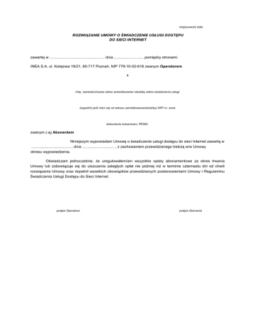 miejscowość data ROZWIĄZANIE UMOWY O ŚWIADCZENIE USŁUGI DOSTĘPU DO SIECI INTERNET zawartej w ................................................... dnia ............................ pomiędzy stronami: INEA S.A. ul. Kolejowa 19/21, 60-717 Poznań, NIP 779-10-02-618 zwanym Operatorem a imię, nazwisko/nazwa adres zameldowania/ siedziby adres świadczenia usługi (wypełnić jeśli różni się od adresu zameldowania/siedziby) NIP/ nr, seria dokumentu tożsamości, PESEL zwanym (-ą) Abonentem Niniejszym wypowiadam Umowę o świadczenie usługi dostępu do sieci Internet zawartą w ....................................... dnia .............................. , z zachowaniem przewidzianego treścią w/w Umowy okresu wypowiedzenia. Oświadczam jednocześnie, że uregulowałem/am wszystkie opłaty abonamentowe za okres trwania Umowy lub zobowiązuje się do uiszczenia zaległych opłat nie później niż w terminie czternastu dni od chwili rozwiązania Umowy oraz dopełnił wszelkich obowiązków przewidzianych postanowieniami Umowy i Regulaminu Świadczenia Usługi Dostępu do Sieci Internet. podpis Operatora podpis Abonenta