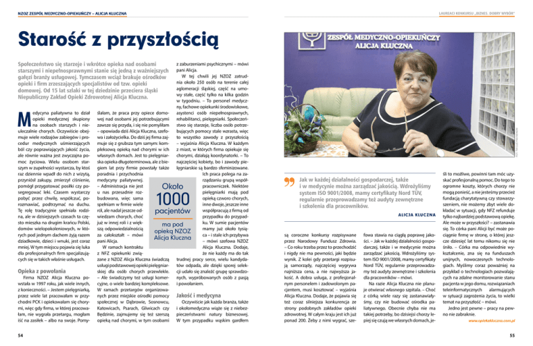 Laureaci konkursu „Biznes. Dobry wybór” nzoz zespół medyczno-opiekuńczy – Alicja Kluczna Starość z przyszłością M edycyna paliatywna to dział opieki medycznej skupiony na osobach starszych i nieuleczalnie chorych. Oczywiście obejmuje wiele rodzajów zabiegów i procedur medycznych uśmierzających ból czy poprawiających jakość życia, ale równie ważna jest zwyczajna pomoc życiowa. Wielu osobom starszym w zupełności wystarcza, by ktoś raz dziennie wpadł do nich z wizytą, przyniósł zakupy, zmierzył ciśnienie, pomógł przygotować posiłki czy posegregować leki. Czasem wystarczy pobyć przez chwilę, współczuć, porozmawiać, podtrzymać na duchu. Tę rolę tradycyjnie spełniała rodzina, ale w dzisiejszych czasach ta często mieszka na drugim krańcu Polski, domów wielopokoleniowych, w których pod jednym dachem żyją razem dziadkowie, dzieci i wnuki, jest coraz mniej. W tym miejscu pojawia się luka dla profesjonalnych firm specjalizujących się w takich właśnie usługach. Opieka z powołania Firma NZOZ Alicja Kluczna powstała w 1997 roku, jak wiele innych, z konieczności. – Jestem pielęgniarką, przez wiele lat pracowałam w przychodni PCK i opiekowałam się chorymi, więc gdy firma, w której pracowałam, nie wygrała przetargu, mogłam iść na zasiłek – albo na swoje. Pomy- 54 z zaburzeniami psychicznymi – mówi pani Alicja. W tej chwili jej NZOZ zatrudnia około 250 osób na terenie całej aglomeracji śląskiej, część na umowy stałe, część tylko na kilka godzin w tygodniu. – To personel medyczny, fachowe opiekunki środowiskowe, asystenci osób niepełnosprawnych, ślałam, że praca przy opiece domorehabilitanci, pielęgniarki. Społeczeńwej nad osobami jej potrzebującymi stwo się starzeje, liczba osób potrzezawsze się przyda, i się nie pomyliłam bujących pomocy stale wzrasta, więc – opowiada dziś Alicja Kluczna, szefoto wszystko zawody z przyszłością wa i założycielka. Do dziś jej firma zaj– wyjaśnia Alicja Kluczna. W każdym muje się z grubsza tym samym: komz miast, w których firma opiekuje się pleksową opieką nad chorymi w ich chorymi, działają koordynatorki. – To własnych domach. Jest to pielęgniarnajczęściej kobiety, bo i zawody pieska opieka długoterminowa, ale z bielęgniarskie są bardzo sfeminizowane. giem lat przy firmie powstały także Ich praca polega na zaporadnia i przychodnia rządzaniu grupą współmedycyny paliatywnej. pracowniczek. Niektóre – Administracja nie jest pielęgniarki mają pod u nas przesadnie rozopieką czworo chorych, budowana, więc sama inne dwoje, jeszcze inne spełniam w firmie wiele współpracują z firmą od ról, ale nadal jeszcze odpacjentów przypadku do przypadwiedzam chorych, choć ku. W sumie pacjentów już w innej roli i z więkma pod mamy już około tysiąszą odpowiedzialnością opieką NZOZ ca – i stale ich przybywa za całokształt – mówi Alicja Kluczna – mówi szefowa NZOZ pani Alicja. Alicja Kluczna. Dodaje, W ramach kontraktu że nie każdy ma do tak z NFZ opiekunki zwiątrudnej pracy serce, wielu kandydazane z NZOZ Alicja Kluczna świadczą tów odpada, ale dzięki sporej selekusługi podstawowej opieki pielęgniarcji udało się znaleźć grupę sprawdzoskiej dla osób chorych przewlekle. – Ale świadczymy też usługi komernych, wypróbowanych osób z pasją i powołaniem. cyjne, o wiele bardziej kompleksowe. W ramach przetargów organizowanych przez miejskie ośrodki pomocy Jakość i medycyna społecznej w Dąbrowie, Sosnowcu, Oczywiście jak każda branża, także Katowicach, Psarach, Gliwicach czy i okołomedyczna wiąże się z niebezBędzinie, zajmujemy się też szerszą pieczeństwami natury biznesowej. opieką nad chorymi, w tym osobami W tym przypadku wąskim gardłem Około 1000 FOT. TW/lucyna nenow Społeczeństwo się starzeje i wkrótce opieka nad osobami starszymi i niepełnosprawnymi stanie się jedną z ważniejszych gałęzi branży usługowej. Tymczasem wciąż brakuje ośrodków opieki i firm zrzeszających specjalistów od tzw. opieki domowej. Od 15 lat szlaki w tej dziedzinie przeciera śląski Niepubliczny Zakład Opieki Zdrowotnej Alicja Kluczna. Jak w każdej działalności gospodarczej, także i w medycynie można zarządzać jakością. Wdrożyliśmy system ISO 9001/2008, mamy certyfikaty Nord TÜV, regularnie przeprowadzamy też audyty zewnętrzne i szkolenia dla pracowników. Alicja Kluczna są coroczne konkursy rozpisywane przez Narodowy Fundusz Zdrowia. – Co roku trzeba przez to przechodzić i nigdy nie ma pewności, jaki będzie wynik. Z kolei gdy przetargi rozpisują samorządy, najczęściej wygrywa najniższa cena, a nie najwyższa jakość. A dobra usługa, z profesjonalnym personelem i zadowolonym pacjentem, musi kosztować – wyjaśnia Alicja Kluczna. Dodaje, że pojawia się też coraz silniejsza konkurencja ze strony podobnych zakładów opieki zdrowotnej. W całym kraju jest ich już ponad 200. Żeby z nimi wygrać, sze- fowa stawia na ciągłą poprawę jakości. – Jak w każdej działalności gospodarczej, także i w medycynie można zarządzać jakością. Wdrożyliśmy system ISO 9001/2008, mamy certyfikaty Nord TÜV, regularnie przeprowadzamy też audyty zewnętrzne i szkolenia dla pracowników – mówi. Na razie Alicja Kluczna nie planuje otwierać własnego szpitala. – Choć z córką wiele razy się zastanawiałyśmy, czy nie budować ośrodka paliatywnego. Obecnie chyba nie ma takiej potrzeby, bo dzisiejsi chorzy lepiej się czują we własnych domach, je- śli to możliwe, powinni tam móc uzyskać profesjonalną pomoc. Do tego to ogromne koszty, których chorzy nie mogą ponieść, a nie jesteśmy przecież fundacją charytatywną czy stowarzyszeniem, nie możemy zbyt wiele dokładać w sytuacji, gdy NFZ refunduje tylko najbardziej podstawową opiekę. Ale może w przyszłości? – zastanawia się. To córka pani Alicji być może pociągnie firmę w str