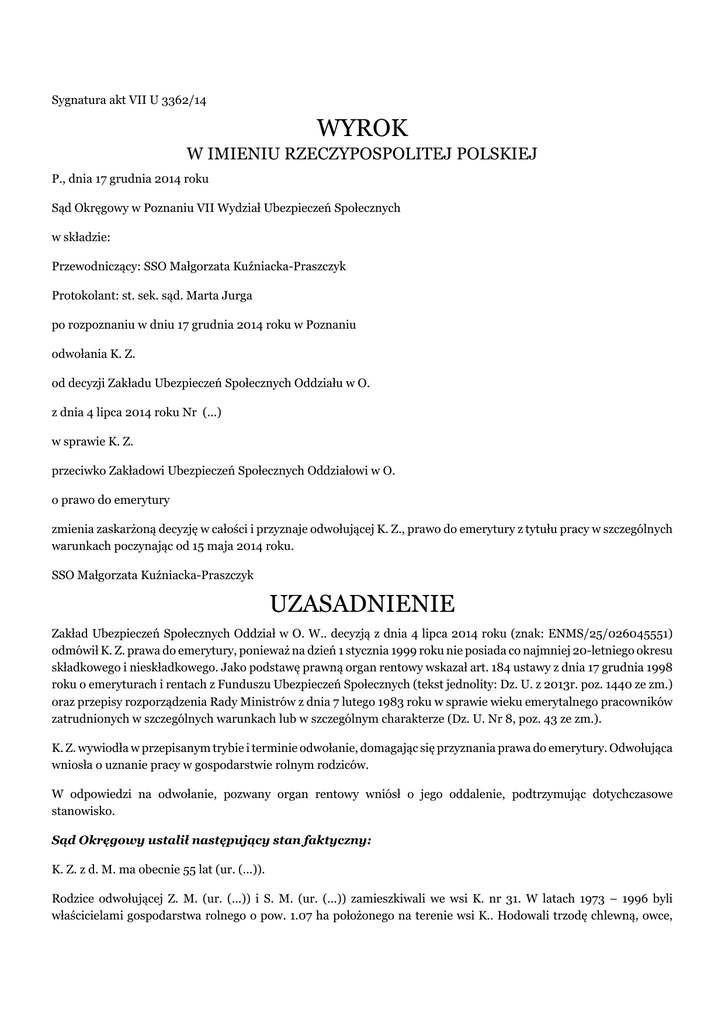 Sygnatura akt VII U 3362/14 WYROK W IMIENIU RZECZYPOSPOLITEJ POLSKIEJ P., dnia 17 grudnia 2014 roku Sąd Okręgowy w Poznaniu VII Wydział Ubezpieczeń Społecznych w składzie: Przewodniczący: SSO Małgorzata Kuźniacka-Praszczyk Protokolant: st. sek. sąd. Marta Jurga po rozpoznaniu w dniu 17 grudnia 2014 roku w Poznaniu odwołania K. Z. od decyzji Zakładu Ubezpieczeń Społecznych Oddziału w O. z dnia 4 lipca 2014 roku Nr (...) w sprawie K. Z. przeciwko Zakładowi Ubezpieczeń Społecznych Oddziałowi w O. o prawo do emerytury zmienia zaskarżoną decyzję w całości i przyznaje odwołującej K. Z., prawo do emerytury z tytułu pracy w szczególnych warunkach poczynając od 15 maja 2014 roku. SSO Małgorzata Kuźniacka-Praszczyk UZASADNIENIE Zakład Ubezpieczeń Społecznych Oddział w O. W.. decyzją z dnia 4 lipca 2014 roku (znak: ENMS/25/026045551) odmówił K. Z. prawa do emerytury, ponieważ na dzień 1 stycznia 1999 roku nie posiada co najmniej 20-letniego okresu składkowego i nieskładkowego. Jako podstawę prawną organ rentowy wskazał art. 184 ustawy z dnia 17 grudnia 1998 roku o emeryturach i rentach z Funduszu Ubezpieczeń Społecznych (tekst jednolity: Dz. U. z 2013r. poz. 1440 ze zm.) oraz przepisy rozporządzenia Rady Ministrów z dnia 7 lutego 1983 roku w sprawie wieku emerytalnego pracowników zatrudnionych w szczególnych warunkach lub w szczególnym charakterze (Dz. U. Nr 8, poz. 43 ze zm.). K. Z. wywiodła w przepisanym trybie i terminie odwołanie, domagając się przyznania prawa do emerytury. Odwołująca wniosła o uznanie pracy w gospodarstwie rolnym rodziców. W odpowiedzi na odwołanie, pozwany organ rentowy wniósł o jego oddalenie, podtrzymując dotychczasowe stanowisko. Sąd Okręgowy ustalił następujący stan faktyczny: K. Z. z d. M. ma obecnie 55 lat (ur. (...)). Rodzice odwołującej Z. M. (ur. (...)) i S. M. (ur. (...)) zamieszkiwali we wsi K. nr 31. W latach 1973 – 1996 byli właścicielami gospodarstwa rolnego o pow. 1.07 ha położonego na terenie wsi K.. Hodowali trzodę chlewną, owce, nutrie, króliki, kury, kaczki, indyki, gęsi. Uprawiali warzywa takie jak fasolka szparagowa, kalarepa, kalafiory, brukselka, a także zboża, ziemniaki, buraki pastewne i truskawki. S. M. wykonywał prace w polu takie jak: bronowanie, orka, koszenie. Zajmował się śrutowaniem zboża na paszę. Wykonywał prace związane z odstawianiem zboża czy zwierząt do punktu skupu. Uczestniczył również w pracach przy warzywach, jednak w mniejszym rozmiarze. Z. M. wykonywała także prace w polu, głównie jednak przy hakaniu i zbiorze warzyw. Zajmowała się obrządkiem inwentarza. Rodzice odwołującej przy zbiorze warzyw korzystali z pomocy sąsiedzkiej, bowiem prace te należało wykonać w odpowiednim terminie. Odwołująca była zameldowana na pobyt stały we wsi K. nr 31 w okresie od 2 grudnia 1963 roku do 18 stycznia 1989 roku. Odwołująca zamieszkiwała wspólnie z rodzicami oraz młodszymi siostrami: I. M. (ur. (...)) i R. M. (ur. (...)). Ojciec odwołującej pracował zawodowo poza rolnictwem – w (...) na podstawie umowy o pracę w pełnym wymiarze czasu pracy. Natomiast matka odwołującej nie pracowała poza rolnictwem. Z. M. opłacała składkę na ubezpieczenie społeczne rolników od 1 lipca 1977 roku do 31 grudnia 1991 roku. Odwołująca ukończyła 16 rok życia w dniu 15 maja 1973 roku. W dniu 2 czerwca 1978 roku odwołująca ukończyła Liceum Ogólnokształcące w L.. Od 1 lipca 1978 roku do 1 października 1978 roku odwołująca pracowała w gospodarstwie rolnym rodziców w wymiarze co najmniej 4 godzin dziennie, przeważnie 8 godzin dziennie. Wykonywała prace przy inwentarzu i w polu. Zajmowała się odpasaniem zwierząt rano i wieczorem. Wieczorem wraz z matką przygotowywała karmę dla zwierząt na następny dzień. Na początku lipca pracowała przy zbiorze truskawek. Uczestniczyła w zbiorze fasolki dwa razy dziennie w lipcu. Odwoziła fasolkę do przetwórni. Podlewała kalafiory i kalarepę, wycinała je, segregowała i odwoziła do przetwórni. Wykonywała prace przy brukselce, którą należało obhakać, nawadniać i obrywać liście. W lipcu i sierpniu odwołująca pracowała również przy żniwach, wiążąc wraz z matką zboże w snopki. W kolejnym miesiącu pracowała przy wykopkach ziemniaków i buraków. Warzywa te były wykopywane ręcznie. Wcześniej odwołująca uczestniczyła w ich ręcznym odchwaszczaniu. W okresie od 2 października 1978 roku do 25 stycznia 1979 roku odwołująca studiowała dziennie na Wydziale Rolniczym Akademii Rolniczej w P. (obecnie (...) Przyrodniczy) na kierunku Rolnictwo. Nadal mieszkała z rodzicami, bowiem nie przyznano jej miejsca w akademiku. Dojeżdżała codziennie do szkoły. Z domu wyjeżdżała rano o godzinie 5.00 bądź 7.00. Do domu wracała około godziny 16.30. Odwołująca dalej pomagała rodzicom w pracach w gospodarstwie rolnym. Gdy wyjeżdżała z domu do szkoły o godzinie 5.00, to wówczas nie zajmowała się rannym obrządkiem zwierząt. Obrządkiem zwierząt zajmowała się, gdy wyjeżdżała z domu o godzinie 7.00. Natomiast po powrocie ze szkoły uczestniczyła w wieczornym obrządku zwierząt. W czasie gdy odwołująca studiowała, to pomagała rodzicom w pracach w gospodarstwie rolnym przez około 3 godziny dziennie. Po przerwaniu nauki odwołująca także pomagała rodzicom w pracach w gospodarstwie. Zajmowała się obrządkiem zwierząt, wyrzucała obornik. Prace te wykonywała przez 3 godziny, choć zdarzały się takie dni, że dłużej, przez 5 godzin. W dniu 1 marca 1979 roku odwołująca podjęła pracę w pełnym wymiarze czasu pracy na kolei – w (...) Zakładzie Spółki. Na dzień 1 stycznia 1999 roku odwołująca posiada ponad 15-letni okres zatrudnienia stale i pełnym wymiarze czasu pracy w szczególnych warunkach, tj. 19 lat 4 miesiące i 4 dni. Na dzień 1 stycznia 1999 roku ZUS uznał za udowodniony okres składkowy i nieskładkowy w wymiarze