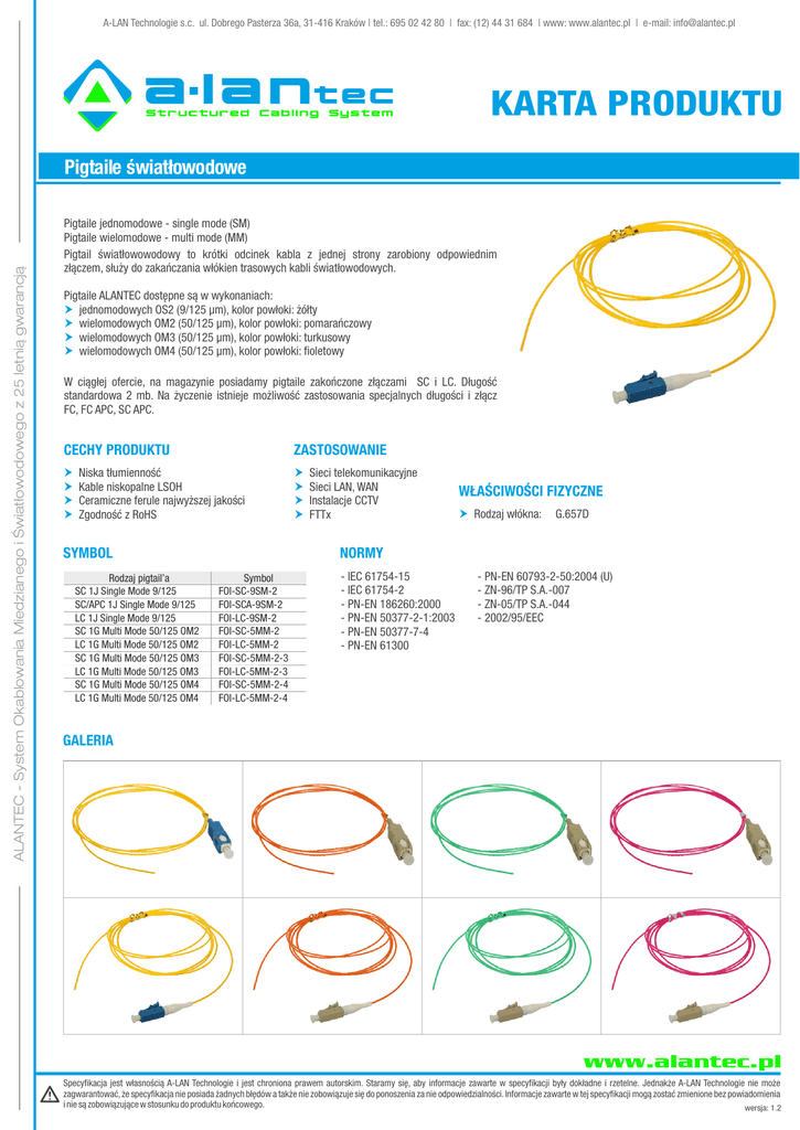 A-LAN Technologie s.c. ul. Dobrego Pasterza 36a, 31-416 Kraków | tel.: 695 02 42 80 | fax: (12) 44 31 684 | www: www.alantec.pl | e-mail: [email protected] KARTA PRODUKTU ALANTEC - System Okablowania Miedzianego i Światłowodowego z 25 letnią gwarancją Pigtaile światłowodowe Pigtaile jednomodowe - single mode (SM) Pigtaile wielomodowe - multi mode (MM) Pigtail światłowowodowy to krótki odcinek kabla z jednej strony zarobiony odpowiednim złączem, służy do zakańczania włókien trasowych kabli światłowodowych. Pigtaile ALANTEC dostępne są w wykonaniach: † jednomodowych OS2 (9/125 µm), kolor powłoki: żółty † wielomodowych OM2 (50/125 µm), kolor powłoki: pomarańczowy † wielomodowych OM3 (50/125 µm), kolor powłoki: turkusowy † wielomodowych OM4 (50/125 µm), kolor powłoki: fioletowy W ciągłej ofercie, na magazynie posiadamy pigtaile zakończone złączami SC i LC. Długość standardowa 2 mb. Na życzenie istnieje możliwość zastosowania specjalnych długości i złącz FC, FC APC, SC APC. CECHY PRODUKTU ZASTOSOWANIE † † † † † † † † Niska tłumienność Kable niskopalne LSOH Ceramiczne ferule najwyższej jakości Zgodność z RoHS SYMBOL Rodzaj pigtail’a SC 1J Single Mode 9/125 SC/APC 1J Single Mode 9/125 LC 1J Single Mode 9/125 SC 1G Multi Mode 50/125 OM2 LC 1G Multi Mode 50/125 OM2 SC 1G Multi Mode 50/125 OM3 LC 1G Multi Mode 50/125 OM3 SC 1G Multi Mode 50/125 OM4 LC 1G Multi Mode 50/125 OM4 Sieci telekomunikacyjne Sieci LAN, WAN Instalacje CCTV FTTx WŁAŚCIWOŚCI FIZYCZNE † Rodzaj włókna: G.657D NORMY Symbol FOI-SC-9SM-2 FOI-SCA-9SM-2 FOI-LC-9SM-2 FOI-SC-5MM-2 FOI-LC-5MM-2 FOI-SC-5MM-2-3 FOI-LC-5MM-2-3 FOI-SC-5MM-2-4 FOI-LC-5MM-2-4 - IEC 61754-15 - IEC 61754-2 - PN-EN 186260:2000 - PN-EN 50377-2-1:2003 - PN-EN 50377-7-4 - PN-EN 61300 - PN-EN 60793-2-50:2004 (U) - ZN-96/TP S.A.-007 - ZN-05/TP S.A.-044 - 2002/95/EEC GALERIA www.alantec.pl Specyfikacja jest własnością A-LAN Technologie i jest chroniona prawem autorskim. Staramy się, aby informacje zawarte w specyfikacji były dokładne i rzetelne. Jednakże A-LAN Technologie nie może zagwarantować, że specyfikacja nie posiada żadnych błędów a także nie zobowiązuje się do ponoszenia za nie odpowiedzialności. Informacje zawarte w tej specyfikacji mogą zostać zmienione bez powiadomienia i nie są zobowiązujące w stosunku do produktu końcowego. wersja: 1.2