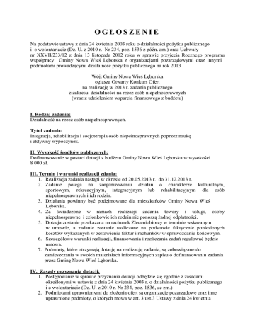 OGŁOSZENIE Na podstawie ustawy z dnia 24 kwietnia 2003 roku o działalności pożytku publicznego i o wolontariacie (Dz. U. z 2010 r. Nr 234, poz. 1536 z późn. zm.) oraz Uchwały nr XXVII/233/12 z dnia 13 listopada 2012 roku w sprawie przyjęcia Rocznego programu współpracy Gminy Nowa Wieś Lęborska z organizacjami pozarządowymi oraz innymi podmiotami prowadzącymi działalność pożytku publicznego na rok 2013 Wójt Gminy Nowa Wieś Lęborska ogłasza Otwarty Konkurs Ofert na realizację w 2013 r. zadania publicznego z zakresu działalności na rzecz osób niepełnosprawnych (wraz z udzieleniem wsparcia finansowego z budżetu) I. Rodzaj zadania: Działalność na rzecz osób niepełnosprawnych. Tytuł zadania: Integracja, rehabilitacja i socjoterapia osób niepełnosprawnych poprzez naukę i aktywny wypoczynek. II. Wysokość środków publicznych: Dofinansowanie w postaci dotacji z budżetu Gminy Nowa Wieś Lęborska w wysokości 8 000 zł. III. Termin i warunki realizacji zdania: 1. Realizacja zadania nastąpi w okresie od 20.05.2013 r. do 31.12.2013 r. 2. Zadanie polega na zorganizowaniu działań o charakterze kulturalnym, sportowym, rekreacyjnym, integracyjnym lub rehabilitacyjnym dla osób niepełnosprawnych i ich rodzin. 3. Działania powinny być podejmowane dla mieszkańców Gminy Nowa Wieś Lęborska. 4. Za świadczone w ramach realizacji zadania towary i usługi, osoby niepełnosprawne i członkowie ich rodzin nie ponoszą żadnej odpłatności. 5. Dotacja zostanie przekazana na rachunek Zleceniobiorcy w terminie wskazanym w umowie, a zadanie zostanie rozliczone na podstawie faktycznie poniesionych kosztów wykazanych w zestawieniu faktur i rachunków w sprawozdaniu końcowym. 6. Szczegółowe warunki realizacji, finansowania i rozliczania zadań regulować będzie umowa. 7. Podmioty, które otrzymają dotację na realizację zadania, są zobowiązane do zamieszczania w swoich materiałach informacyjnych zapisu o dofinansowaniu zadania przez Gminę Nowa Wieś Lęborska. IV. Zasady przyznania dotacji: 1. Postępowanie w sprawie przyznania dotacji odbędzie się zgodnie z zasadami określonymi w ustawie z dnia 24 kwietnia 2003 r. o działalności pożytku publicznego i o wolontariacie (Dz. U. z 2010 r. Nr 234, poz. 1536, ze zm.) 2. Podmiotami uprawnionymi do złożenia ofert są organizacje pozarządowe oraz inne uprawnione podmioty, o których mowa w art. 3 ust.3 Ustawy z dnia 24 kwietnia 2003 r. o działalności pożytku publicznego i o wolontariacie. 3. Dofinansowanie nie może przekroczyć 85% całkowitych kosztów realizacji zadania. 4. Warunkiem uzyskania dotacji jest pokrycie co najmniej 15 % kosztów realizacji zadania ze środków pochodzących spoza budżetu Gminy Nowa Wieś Lęborska. Za środki pochodzące spoza budżetu gminy można przyjąć wkład finansowy (środki finansowe) oraz wkład pozafinansowy osobowy (polega na wniesieniu do realizacji zadania świadczeń wykonywanych przez wolontariuszy lub/i pracy społecznej przedstawicieli oferenta). 5. Jeżeli dany koszt finansowany z dotacji wykazany w sprawozdaniu z realizacji zadania publicznego nie jest równy z kosztem określonym w odpowiedniej pozycji kosztorysu, to uznaje się go za zgodny z kosztorysem wtedy, gdy nie nastąpiło jego zwiększenie o więcej niż 10%. Przy czym wysokość dotacji nie może ulec zwiększeniu. 6. Kosztorys w ofercie musi być czytelny i logiczny. W kosztorysie należy szczegółowo wykazać koszty rodzajowe wraz z kosztami jednostkowymi planowanego zadania. Wydatki przedstawione w kosztorysie muszą znajdować pełne uzasadnienie w opisie zadania. 7. Podpisy pod ofertą, dołączonymi załącznikami i oświadczeniami składają osoby upoważnione do składania oświadczeń woli, zgodnie z danymi z Krajowego Rejestru Sądowego/ innej ewidencji. Wszystkie złożone własnoręcznie podpisy oraz pieczątki muszą być czytelne. 8. Środki pochodzące z dotacji nie mogą być wykorzystane na: a) dotowanie przedsięwzięć, które są dofinansowywane z budżetu gminy lub jego funduszy celowych na podstawie przepisów szczególnych, b) pokrycie deficytu zrealizowanych wcześniej przedsięwzięć oraz refundację kosztów, c) budowę, zakup budynków lub lokali, zakup gruntów, d) działalność gospodarczą podmiotów prowadzących działalność pożytku publicznego, e) udzielania pomocy finansowej osobom fizycznym, f) działalność polityczną i religijną, g) obsługę księgową w ramach realizowanego zadania. 9. Organizator konkursu zastrzega sobie prawo do wskazania przeznaczenia dotacji na pokrycie kosztów innych niż zaproponowane przez wnioskodawcę w kosztorysie, a także prawo do przyznania mniejszej kwoty dotacji niż wnioskowana. V. Termin i warunki składania ofert: 1. Oferty należy składać na druku stanowiącym załącznik nr 1 do Rozporządzenia Ministra Pracy i Polityki Społecznej z dnia 15 grudnia 2010 r. (Dz. U. z 2011 r. Nr 6 , poz. 25) w terminie do 6.05.2013 r. w Kancelarii Urzędu Gminy w Nowej Wsi Lęborskiej, ulica Grunwaldzka 24, do godziny 15.30 lub przesłać pocztą na adres: Urząd Gminy w Nowej Wsi Lęborskiej, 84-351 Nowa Wieś Lęborska, ul. Grunwaldzka 24 (liczy się data i godz. wpływu do Urzędu Gminy w Nowej Wsi Lęborskiej). Oferty powinny być złożone z dopiskiem ,,Otwarty Konkurs Ofert” i z podaniem rodzaju zadania. Oferty złożone po terminie, lub na nieodpowiednim druku nie będą rozpatrywane. 2. Oferta musi być kompletna, zgodnie ze wzorem określonym w Rozporządzeniu Ministra Pracy i Polityki Społecznej z dnia 15 grudnia 2010 r. w sprawie wzoru oferty i ramowego wzoru umowy dotyczącej realizacji zadania publicznego oraz wzoru sprawozdania z tego zadania (Dz. U. z 2011r., Nr 6 poz. 25). Formularz oferty musi być podpisany czytelnie przez osoby upoważnione do składania oświadczeń woli wraz z pieczęciami, zgodnie z danymi z Krajowego Rejestru Sądowego lub zgodnie z innym dokumentem potwierdzającym status prawny