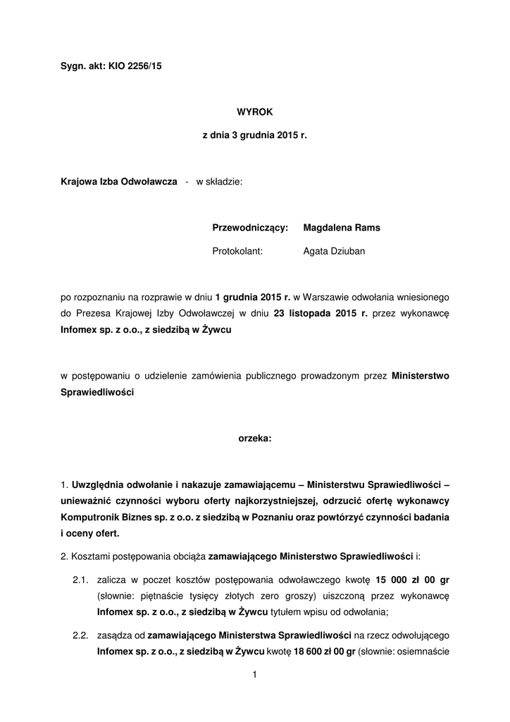 Sygn. akt: KIO 2256/15 WYROK z dnia 3 grudnia 2015 r. Krajowa Izba Odwoławcza - w składzie: Przewodniczący: Magdalena Rams Protokolant: Agata Dziuban po rozpoznaniu na rozprawie w dniu 1 grudnia 2015 r. w Warszawie odwołania wniesionego do Prezesa Krajowej Izby Odwoławczej w dniu 23 listopada 2015 r. przez wykonawcę Infomex sp. z o.o., z siedzibą w Żywcu w postępowaniu o udzielenie zamówienia publicznego prowadzonym przez Ministerstwo Sprawiedliwości orzeka: 1. Uwzględnia odwołanie i nakazuje zamawiającemu – Ministerstwu Sprawiedliwości – unieważnić czynności wyboru oferty najkorzystniejszej, odrzucić ofertę wykonawcy Komputronik Biznes sp. z o.o. z siedzibą w Poznaniu oraz powtórzyć czynności badania i oceny ofert. 2. Kosztami postępowania obciąża zamawiającego Ministerstwo Sprawiedliwości i: 2.1. zalicza w poczet kosztów postępowania odwoławczego kwotę 15 000 zł 00 gr (słownie: piętnaście tysięcy złotych zero groszy) uiszczoną przez wykonawcę Infomex sp. z o.o., z siedzibą w Żywcu tytułem wpisu od odwołania; 2.2. zasądza od zamawiającego Ministerstwa Sprawiedliwości na rzecz odwołującego Infomex sp. z o.o., z siedzibą w Żywcu kwotę 18 600 zł 00 gr (słownie: osiemnaście 1 tysięcy sześćset złotych zero groszy) stanowiącą koszty postępowania odwoławczego poniesione z tytułu wpisu od odwołania oraz z tytułu wynagrodzenia pełnomocnika. Stosownie do art. 198a i 198b ustawy z dnia 29 stycznia 2004 r. – Prawo zamówień publicznych (t.j. Dz. U. z 2013 r. poz. 907) na niniejszy wyrok – w terminie 7 dni od dnia jego doręczenia – przysługuje skarga za pośrednictwem Prezesa Krajowej Izby Odwoławczej do Sądu Okręgowego w Warszawie. Przewodniczący: 2 ……………………………………… Sygn. akt: KIO 2556/15 UZASADNIENIE W dniu 23 listopada 2015 r. do Prezesa Krajowej Izby Odwoławczej wpłynęło odwołanie wykonawcy Infomex sp. z o.o., z siedzibą w Żywcu (dalej „Odwołujący”) zarzucając zamawiającemu Ministerstwu Sprawiedliwości (dalej „Zamawiający”): (i) zaniechanie odrzucenia oferty Komputronik Biznes Sp. z o.o. jako niezgodnej z treścią SIWZ; (ii) wyboru oferty Komputronik Biznes Sp. z o.o. jako najkorzystniejszej; (iii) zaniechanie wyboru oferty Odwołującego jako najkorzystniejszej i naruszenie w ten sposób: 1) art. 7 ust. 1 i 3 ustawy Pzp poprzez przeprowadzenie postępowania o udzielenie zamówienia w sposób naruszający uczciwą konkurencję oraz nierówne traktowanie wykonawców, oraz poprzez wybór oferty - udzielenie zamówienia - Komputronik Biznes Sp. z o.o. wybranej w sposób niezgodny z przepisami ustawy Pzp; 2) art. 26 ust. 4 ustawy Pzp poprzez niedozwoloną modyfikację treści oferty Komputronik Biznes Sp. z o.o. względnie: 3) art. 87 ust. 1 ustawy Pzp poprzez niedozwoloną modyfikację treści oferty Komputronik Biznes Sp. z o.o.; 4) art. 89 ust. 1 pkt 2) ustawy Pzp poprzez zaniechanie odrzucenia oferty Komputronik Biznes Sp. z o.o.; 5) art. 91 ust. 1 Ustawy poprzez wybór oferty Komputronik Biznes sp. z o.o. oraz zaniechanie wyboru oferty Odwołującego jako najkorzystniejszej. W związku z powyższymi naruszeniami Odwołujący wniósł o: (i) uwzględnienie odwołania w całości; (ii) unieważnienie czynności wyboru oferty Komputronik Biznes Sp. z o.o. jako najkorzystniejszej; (iii) ponowne przeprowadzenie badania i oceny ofert; (iv) odrzucenie oferty Komputronik Biznes Sp. z o.o. jako niezgodnej z treścią SIWZ; (v) wybór oferty Odwołującego jako najkorzystniejszej; (vi) obciążenie Zamawiającego kosztami postępowania odwoławczego wg norm przepisanych. W uzasadnieniu podniesionych zarzutów Odwołujący wskazał, że zgodnie z brzmieniem pkt III ust. 3 - Komputer przenośny typ 15, ppkt 12 OPZ - w zakresie dotyczącym minimalnych parametrów baterii Zamawiający wymagał aby oferowany akumulator litowy, 3 ogniwowy Komputera przenośnego typ 15 charakteryzował się m.in. nieprzerwanym czasem pracy 3 wynoszącym minimum 6 godzin. Odwołujący wskazał, że z dokumentacji ofertowej Komputronik wynika, iż zaoferował on komputer przenośny typu Asus Advanced B551LA, którego akumulator litowy charakteryzuje się nieprzerwanym czasem pracy wynoszącym nie więcej niż 5 godzin. Taka okoliczność wynika wprost z powszechnie dostępnych informacji producenta tegoż notebooka, jak również z informacji uzyskanych od firmy ASUS Polska, która stanowi załącznik do niniejszego pisma. Dalej Odwołujący wskazał, że zgodnie z brzmieniem pkt III ust. 3 - Komputer przenośny typ 15, ppkt 9 OPZ - w zakresie dotyczącym multimediów Zamawiający wymagał aby oferowany notebook posiadał 2 x głośniki do odtwarzania plików multimedialnych. Tymczasem z informacji uzyskanych od firmy ASUS Polska, która stanowi załącznik do niniejszego pisma wynika, że oferowany przez firmę Komputronik notebook posiada tylko jeden wbudowany głośnik do multimediów. Odwołujący wskazał również, że zgodnie z brzmieniem Rozdziału III ust. 4 - Monitor LCD 23", ppkt 12 OPZ Zamawiający wymagał regulacji wysokości (pion) w zakresie 120 mm (+/-10%). Tymczasem dokumentacja ofertowa Komputronik obejmuje monitor LCD marki Asus PB248Q, który charakteryzuje się możliwością regulacji wysokości w pionie wyłącznie w zakresie 0-100 mm. Taka okoliczność wynika wprost z powszechnie dostępnych informacji producenta tegoż monitora, które można zweryfikować pod adresem: https://www.asus.com/pl/Monitors/PB248Q/overview/. Odwołujący wskazał, że powyższe, rzeczywiste parametry monitora (tj. regulacji wysokości monitora w pionie w zakresie 0-100 mm) można też bardzo łatwo zweryfikować na fizycznym monitorze demo. W ocenie Odwołującego nie znajduje też potwierdzenia stanowisko Komputronik jakoby w ramach dostępnych opcji tegoż monitora możliwe było zaoferowanie monitora z inną, dedykowaną podstawką (stopką) producenta ASUS, której zastosowanie pozwoliło