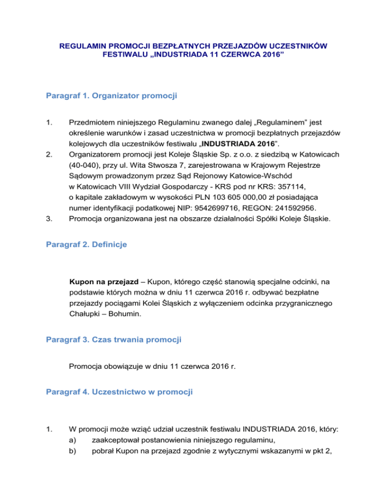 REGULAMIN PROMOCJI BEZPŁATNYCH PRZEJAZDÓW UCZESTNIKÓW FESTIWALU „INDUSTRIADA 11 CZERWCA 2016” Paragraf 1. Organizator promocji 1. Przedmiotem niniejszego Regulaminu zwanego dalej „Regulaminem” jest określenie warunków i zasad uczestnictwa w promocji bezpłatnych przejazdów kolejowych dla uczestników festiwalu „INDUSTRIADA 2016”. 2. Organizatorem promocji jest Koleje Śląskie Sp. z o.o. z siedzibą w Katowicach (40-040), przy ul. Wita Stwosza 7, zarejestrowana w Krajowym Rejestrze Sądowym prowadzonym przez Sąd Rejonowy Katowice-Wschód w Katowicach VIII Wydział Gospodarczy - KRS pod nr KRS: 357114, o kapitale zakładowym w wysokości PLN 103 605 000,00 zł posiadająca numer identyfikacji podatkowej NIP: 9542699716, REGON: 241592956. Promocja organizowana jest na obszarze działalności Spółki Koleje Śląskie. 3. Paragraf 2. Definicje Kupon na przejazd – Kupon, którego część stanowią specjalne odcinki, na podstawie których można w dniu 11 czerwca 2016 r. odbywać bezpłatne przejazdy pociągami Kolei Śląskich z wyłączeniem odcinka przygranicznego Chałupki – Bohumin. Paragraf 3. Czas trwania promocji Promocja obowiązuje w dniu 11 czerwca 2016 r. Paragraf 4. Uczestnictwo w promocji 1. W promocji może wziąć udział uczestnik festiwalu INDUSTRIADA 2016, który: a) zaakceptował postanowienia niniejszego regulaminu, b) pobrał Kupon na przejazd zgodnie z wytycznymi wskazanymi w pkt 2, c) 2. posiada podczas przejazdu pociągiem Kolei Śląskich właściwie wypełniony Kupon na przejazd, tj. zgodnie z instrukcjami podanymi na Kuponie i w niniejszym regulaminie w § 5. Kupon na przejazd można pobrać w następujących miejscach i terminach: a) Po 1 czerwca 2016 r. - w obiektach biorących udział w festiwalu INDUSTRIADA 2016 oraz innych wybranych lokalizacjach (ich lista na stronie industriada.pl zostanie zamieszczona do 1 czerwca 2016 r.). Kupony na przejazd są dostępne do wyczerpania zapasów. b) W dniach 3 i 4 czerwca 2016 r. w kasie Centrum Obsługi Pasażera c) Kolei Śląskich – Dworzec PKP Katowice, plac Wilhelma Szewczyka 1, w godzinach 8.00–19.30. Kupony na przejazd są dostępne do wyczerpana zapasów. W dniu 11 czerwca 2016 r. w punktach informacyjnych o festiwalu – punktach Induinfo: a. Górnośląskie Koleje Wąskotorowe – Parowozownia przy ul. Reja w Bytomiu, b. Szyb Prezydent w Chorzowie przy ul. Piotra Skargi 34 a-d w Chorzowie, c. Oddział Odlewnictwa Artystycznego Muzeum w Gliwicach przy ul. Bojkowskiej 37, d. Muzeum Śląskie w Katowicach przy ul. Dobrowolskiego 1, e. Osiedle Nikiszowiec w Katowicach, f. Muzeum Energetyki przy ul. Wyzwolenia 30 w Łaziskach Górnych, g. Zabytkowa Kopalnia Ignacy w Rybniku przy ul. Mościckiego 3, h. Park Tradycji przy ul. Orzeszkowej 12 w Siemianowicach Śląskich, i. Kopalnia Srebra w Tarnowskich Górach przy ul. Szczęść Boże 81, j. Sztolnia Królowa Luiza – Park 12c przy ul. Sienkiewicza 43 w Zabrzu, Kupony na przejazd są dostępne do wyczerpania zapasów. d) 11 czerwca 2016 r.: a. u stewardów na przystankach bezpłatnej komunikacji autobusowej w 20 lokalizacjach: dworzec PKP Gliwice, Oddział Odlewnictwa Artystycznego – Gliwice, Radiostacja Gliwice – Gliwice, dworzec PKP Zabrze, Szyb Maciej – Zabrze, Sztolnia Królowa Luiza – Zabrze, Kopalnia Guido – Zabrze, dworzec PKP Chorzów Batory, Szyb Prezydent – Chorzów, Park Tradycji – Siemianowice Śląskie, Wieże KWK Polska – Świętochłowice, dworzec PKP Katowice, Muzeum Śląskie – Katowice, Walcownia Cynku – Katowice, Osiedle Nikiszowiec z Galerią Szyb Wilson – Katowice, Osiedle Giszowiec – Katowice, Fabryka Porcelany – Katowice, dworzec PKP Sosnowiec Główny, Pałac Schoena – Sosnowiec, Kopalnia Ćwiczebna Sztygarka – Dąbrowa Górnicza. Kupony na przejazd są dostępne do wyczerpania zapasów. b. u przewodników turystycznych w autobusach bezpłatnej komunikacji Metropolii Silesia. Kupony na przejazd są dostępne do wyczerpania zapasów. 3. Uczestnik poprzez skorzystanie z promocji wyraża zgodę na nieodpłatne wykorzystanie swojego wizerunku utrwalonego w czasie promocyjnego przejazdu w dniu 11 czerwca 2016 r. do celów marketingowych. Paragraf 5. Przedmiot promocji 1. Przedmiotem promocji są bezpłatne przejazdy dla uczestników festiwalu INDUSTRIADA 2016 w dniu 11 czerwca 2016 r. na podstawie Kuponu na przejazd na dowolnej trasie w pociągach, kursujących wg obowiązującego rozkładu jazdy, uruchamianych przez Koleje Śląskie Spółka z o.o., z wyłączeniem odcinka przygranicznego Chałupki – Bohumin. 2. Kupon na przejazd jest ważny po wypełnieniu przez pasażera dwóch odcinków kuponu (w części A i części B) w rubrykach relacji przejazdu (nazwy stacji początkowej i końcowej) i godziny rozpoczęcia podróży (godzina odjazdu). Kupon na przejazd z właściwie wypełnionymi dwoma odcinkami kuponu upoważnia do jednorazowego przejazdu w deklarowanej przez podróżnego relacji. 3. Jeden Kupon na przejazd uprawnia do dwóch przejazdów po wypełnieniu czterech odcinków kuponu (dwóch części A i dwóch części B). Dopuszczalne jest jednorazowe wykorzystanie kuponu maksymalnie przez dwie osoby odbywające przejazd tym samym pociągiem. 4. Podróżny, który zamierza odbyć przejazd z rowerem, wózkiem dziecięcym, psem lub rzeczami pod opieką podróżnego, za które pobiera się opłatę, jest zobowiązany zakupić bilet na przejazd i przewóz wg indywidualnych uprawnień zgodnie z Cennikiem Usług Przewozowych Kolei Śląskich (C-KŚ). 5. Personel pokładowy dokonuje odprawy podróżnych poprzez oderwanie od Kuponu na przejazd wypełnionej części perforowanej oraz zamieszczenie odcisku znakownika lub odręcznie wpisanego numeru pociągu na części kuponu pozostającego u podróżnego. 6. Kupon na przejazd który jest: uszkodzony, skopiowany, przecięty, itp. uznaje się za nieważny. 7. Jeżeli podróż została rozpoczęta w dniu ważności Kuponu na przejazd, tj. 11 cze