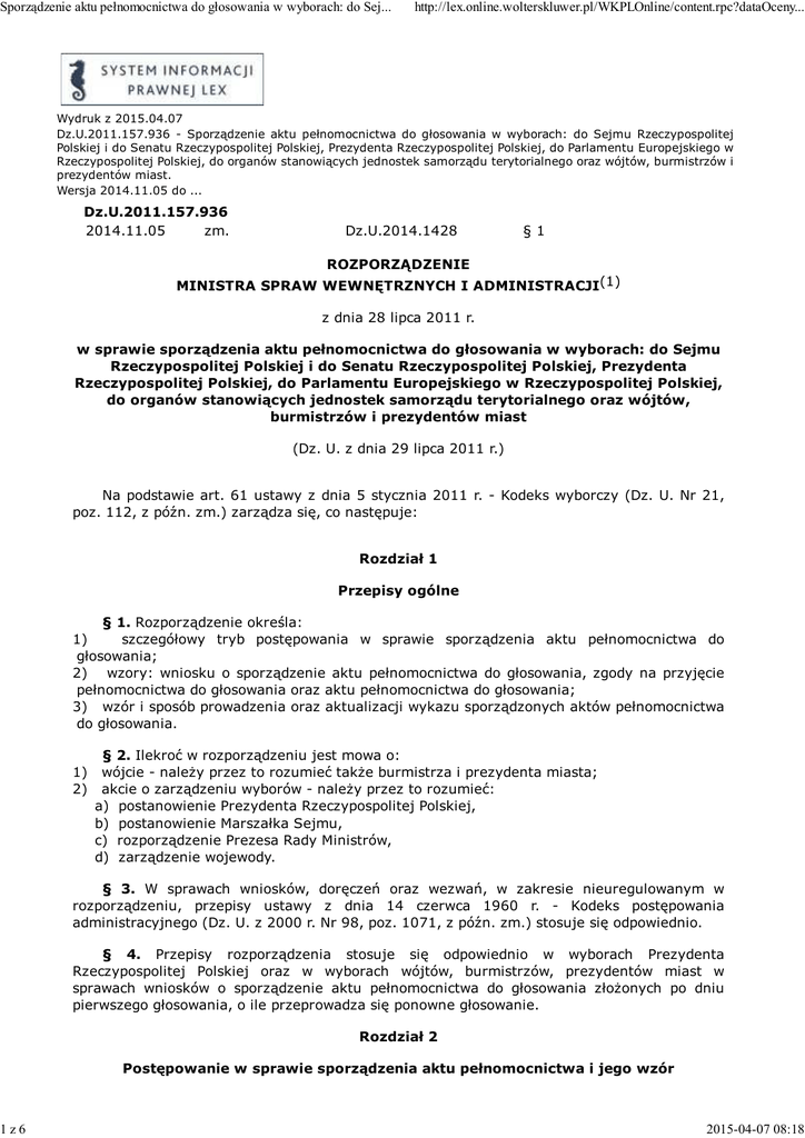 Sporządzenie aktu pełnomocnictwa do głosowania w wyborach: do Sej... 1z6 http://lex.online.wolterskluwer.pl/WKPLOnline/content.rpc?dataOceny... Wydruk z 2015.04.07 Dz.U.2011.157.936 - Sporządzenie aktu pełnomocnictwa do głosowania w wyborach: do Sejmu Rzeczypospolitej Polskiej i do Senatu Rzeczypospolitej Polskiej, Prezydenta Rzeczypospolitej Polskiej, do Parlamentu Europejskiego w Rzeczypospolitej Polskiej, do organów stanowiących jednostek samorządu terytorialnego oraz wójtów, burmistrzów i prezydentów miast. Wersja 2014.11.05 do ... Dz.U.2011.157.936 2014.11.05 zm. Dz.U.2014.1428 §1 ROZPORZĄDZENIE MINISTRA SPRAW WEWNĘTRZNYCH I ADMINISTRACJI(1) z dnia 28 lipca 2011 r. w sprawie sporządzenia aktu pełnomocnictwa do głosowania w wyborach: do Sejmu Rzeczypospolitej Polskiej i do Senatu Rzeczypospolitej Polskiej, Prezydenta Rzeczypospolitej Polskiej, do Parlamentu Europejskiego w Rzeczypospolitej Polskiej, do organów stanowiących jednostek samorządu terytorialnego oraz wójtów, burmistrzów i prezydentów miast (Dz. U. z dnia 29 lipca 2011 r.) Na podstawie art. 61 ustawy z dnia 5 stycznia 2011 r. - Kodeks wyborczy (Dz. U. Nr 21, poz. 112, z późn. zm.) zarządza się, co następuje: Rozdział 1 Przepisy ogólne § 1. Rozporządzenie określa: 1) szczegółowy tryb postępowania w sprawie sporządzenia aktu pełnomocnictwa do głosowania; 2) wzory: wniosku o sporządzenie aktu pełnomocnictwa do głosowania, zgody na przyjęcie pełnomocnictwa do głosowania oraz aktu pełnomocnictwa do głosowania; 3) wzór i sposób prowadzenia oraz aktualizacji wykazu sporządzonych aktów pełnomocnictwa do głosowania. 1) 2) § 2. Ilekroć w rozporządzeniu jest mowa o: wójcie - należy przez to rozumieć także burmistrza i prezydenta miasta; akcie o zarządzeniu wyborów - należy przez to rozumieć: a) postanowienie Prezydenta Rzeczypospolitej Polskiej, b) postanowienie Marszałka Sejmu, c) rozporządzenie Prezesa Rady Ministrów, d) zarządzenie wojewody. § 3. W sprawach wniosków, doręczeń oraz wezwań, w zakresie nieuregulowanym w rozporządzeniu, przepisy ustawy z dnia 14 czerwca 1960 r. - Kodeks postępowania administracyjnego (Dz. U. z 2000 r. Nr 98, poz. 1071, z późn. zm.) stosuje się odpowiednio. § 4. Przepisy rozporządzenia stosuje się odpowiednio w wyborach Prezydenta Rzeczypospolitej Polskiej oraz w wyborach wójtów, burmistrzów, prezydentów miast w sprawach wniosków o sporządzenie aktu pełnomocnictwa do głosowania złożonych po dniu pierwszego głosowania, o ile przeprowadza się ponowne głosowanie. Rozdział 2 Postępowanie w sprawie sporządzenia aktu pełnomocnictwa i jego wzór 2015-04-07 08:18 Sporządzenie aktu pełnomocnictwa do głosowania w wyborach: do Sej... 2z6 http://lex.online.wolterskluwer.pl/WKPLOnline/content.rpc?dataOceny... § 5. 1. (2) Wniosek o sporządzenie aktu pełnomocnictwa do głosowania, zwany dalej "wnioskiem", o którym mowa w art. 56 § 2 ustawy z dnia 5 stycznia 2011 r. - Kodeks wyborczy, zwanej dalej "ustawą", wnosi się, począwszy od dnia wejścia w życie aktu o zarządzeniu wyborów, nie później jednak niż do 9. dnia przed dniem wyborów. Za datę wniesienia wniosku przyjmuje się dzień jego wpływu do właściwego urzędu gminy. 2. Wniosek złożony przed dniem wejścia w życie aktu o zarządzeniu wyborów pozostawia się bez rozpoznania. § 6. 1. Wniosek składa się na formularzu, którego wzór stanowi, w wyborach: 1) do Sejmu Rzeczypospolitej Polskiej i do Senatu Rzeczypospolitej Polskiej, załącznik nr 1 do rozporządzenia; 2) Prezydenta Rzeczypospolitej Polskiej, załącznik nr 2 do rozporządzenia; 3) do Parlamentu Europejskiego w Rzeczypospolitej Polskiej, załącznik nr 3 do rozporządzenia; 4) do organów stanowiących jednostek samorządu terytorialnego oraz wójtów, burmistrzów i prezydentów miast, załącznik nr 4 do rozporządzenia. 2. Jeżeli wyborca nie może lub nie umie złożyć podpisu, wniosek podpisuje osoba, która wyraziła zgodę na przyjęcie pełnomocnictwa do głosowania. 3. O ile we wniosku nie zostanie zastrzeżone inaczej, w postępowaniu w sprawie sporządzenia aktu pełnomocnictwa do głosowania, zwanego dalej "aktem pełnomocnictwa", wyborcę reprezentuje osoba, która wyraziła zgodę na przyjęcie pełnomocnictwa do głosowania, zwanego dalej "pełnomocnictwem". 4. Wzór zgody na przyjęcie pełnomocnictwa stanowi, w wyborach: 1) do Sejmu Rzeczypospolitej Polskiej i do Senatu Rzeczypospolitej Polskiej, załącznik nr 5 do rozporządzenia; 2) Prezydenta Rzeczypospolitej Polskiej, załącznik nr 6 do rozporządzenia; 3) do Parlamentu Europejskiego w Rzeczypospolitej Polskiej, załącznik nr 7 do rozporządzenia; 4) do organów stanowiących jednostek samorządu terytorialnego oraz wójtów, burmistrzów i prezydentów miast, załącznik nr 8 do rozporządzenia. § 7. 1. Wezwanie do usunięcia wad wniosku, o którym mowa w art. 57 § 1 ustawy, obok wskazania wad wniosku, powinno zawierać pouczenie o tym, że ich nieusunięcie w terminie 3 dni od dnia otrzymania wezwania będzie skutkować odmową sporządzenia aktu pełnomocnictwa. 2. Odmowę sporządzenia aktu pełnomocnictwa, o której mowa w art. 57 § 2 ustawy, sporządza się na piśmie. § 8. 1. W przypadku gdy wniosek spełnia warunki, o których mowa w art. 54, art. 55 oraz art. 56 § 2 i 3 ustawy, wójt lub inny upoważniony pracownik urzędu gminy niezwłocznie uzgadnia z wyborcą lub osobą, która wyraziła zgodę na przyjęcie pełnomocnictwa, termin sporządzenia aktu pełnomocnictwa. W razie braku uzgodnienia terminu termin wyznacza wójt lub inny upoważniony pracownik urzędu gminy. 2. Przepis ust. 1 stosuje się odpowiednio do wniosku, który został uzupełniony po wezwaniu. 3. Przed uzgodnionym lub wyznaczonym terminem sporządzenia aktu pełnomocnictwa wójt lub inny upoważniony pracownik urzędu gminy sporządza w 3 egzemplarzach projekt aktu pełnomocnictwa, nadając mu kolejny niepowtarzalny