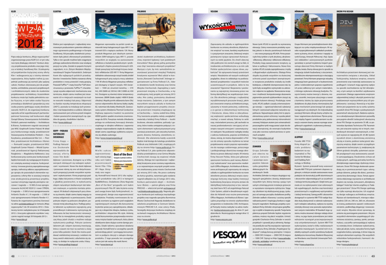 KLER ELEKTRA MEGAMAN Elektra jest największym i najbardziej renomowanym producentem systemów elektrycz- POLBRUK VESCOM ATLAS Hörmann DRZWI PIU DESIGN Megaman wprowadza na polski rynek za- Zapraszamy do udziału w ogólnopolskim Nowe tynki ATLAS to sposób na wymarzoną Grupa Hörmann jest przedsiębiorstwem dzia- mienniki lamp halogenowych typu AR111 na konkursie na zmianę określenia „Wykańcza- elewację. Cztery nowoczesne produkty wyso- łającym na rynku międzynarodowym. W wy- nego ogrzewania podłogowego w Europie trzonek G53 o napięciu zasilania 12V. Nowy nie wnętrza” na nowe, bardziej współczesne kiej jakości w dwustu pastelowych kolorach soko wyspecjalizowanych zakładach produko- Środkowej. Od początku działalności priory- produkt Megaman jest idealnym zamien- i o pozytywnym znaczeniu. Dekoracji wnętrz — oto nowa propozycja ATLASA. Firma posze- wane są bramy, drzwi, ościeżnice i napędy na Piąta edycja konkursu „Wizja wypoczynku” tetem była jakość oferowanych produktów. nikiem 50W halogenu typu AR111, przede Jesteś studentem architektury, budowni- poświęcono tysiące opracowań tłumaczo- rzyła linię tynków o tynk akrylowy, akrylowo- rynki Europy, Ameryki Północnej i Azji. Gęsta organizowanego przez KLER S.A. w tym roku Tylko w ten sposób możliwe było osiągnięcie wszystkim ze względu na zastosowanie ctwa, inżynierii lądowej i tym podobnych nych na wiele języków. Do chwili obecnej -silikonowy, silikonowy i silikonowo-silikatowy. sieć oddziałów i autoryzowanych punktów nosi tytuł „Brakujący element”. Konkurs doty- pełnego zadowolenia klientów oraz wiodącej reflektora o kształcie parabolicznym i profe- kierunków? Masz głowę pełną pomysłów nikt publicznie nie zwrócił uwagi na fakt, iż Produkty mają zaawansowane receptury, są sprzedaży w ponad trzydziestu krajach gwa- czy projektowania produktu oraz jego miej- pozycji na rynku. Zostało to poparte licznymi sjonalnych chipów powierzchniowych LED. oraz chęć tworzenia własnych projektów? środowisko architektoniczne a za nim całe łatwe w aplikacji i fakturowaniu. Nowa linia rantuje obecność firmy Hörmann w każdym sca w kolekcji handlowej Kler. Oczekujemy nagrodami, m.in. Złotym Medalem Między- Dzięki powyższej technologii krzywa świat- Marzysz o tym, by móc samodzielnie za- Polskie społeczeństwo używa słowa „wy- tynków ATLAS została zaprojektowana z myślą zakątku świata. Bramy elewacyjne to sposób na od projektantów krytycznej oceny oferty narodowych Targów Poznańskich, Srebrnym łości reflektorów LED AR111 firmy Megaman aranżować przestrzeń miejską? Podejmij kańczać” do opisywania kreacji przestrzeni o długotrwałym użytkowaniu. Dlatego firma integrację stolarki budowlanej z otoczeniem, Architektura przestrzeni domowej jest nie- Kler i wzbogacenia jej o istotny element Asem dla najlepszych polskich przedsię- dokładnie odwzorowuje rozsył światła źródeł kreatywne wyzwanie! Weź udział w kon- wnętrz. Niezależnie od naszych osobistych skupiła się przede wszystkim na skutecznej niewidoczne wkomponowanie jej w otaczającą rozerwalnie związana z akustyką. Układ wyposażenia, który będzie trafnie ją uzu- biorstw i inwestorów. Elektra rozszerza ofertę halogenowych przy zużyciu mocy zaledwie kursie „Kierunek Ciechocinek”, którego or- poglądów, słowo to oddziałuje na podświa- ochronie przed czynnikami zewnętrznymi: przestrzeń. Firma Hörmann proponuje wizualną funkcjonalny, kubatura wnętrza, otwarte pełniał, podnosząc jej wartość jako spójnej produktów o nowy przewód i matę grzejną. 11W. W ofercie Megaman powyższy reflektor ganizatorami są firma Polbruk S.A., lider domość projektantów i wszystkich twórców w recepturze produktów znalazły się środki integrację bram garażowych w budownictwie przestrzenie oraz materiały zastosowane na całości. Konkurs skierowany jest do projek- Przewód TuffTec™ i matę SnowTec®Tuff (skon- jest dostępny w kątach rozsyłu: 450 (świat- w dziedzinie kostki brukowej oraz Gmina uczestniczących w projekcie. Jakie to ma biobójcze, a składniki skomponowano tak, by jedno i wielorodzinnym poprzez wypełnienie podłogach i ścianach mają ogromny wpływ tantów, architektów, pracowni projektowych struowaną z przewodu TuffTec™) charakte- łość — 1400 cd, strumień świetlny — 570 Miejska Ciechocinek. Zaprojektuj z nami znaczenie? Ogromne! Skojarzenia i porów- tynki były szczególnie wytrzymałe na uderze- ich przez odbiorcę tym samym materiałem, na sposób rozchodzenia się fali dźwięko- i architektonicznych, także do studentów ryzuje wysoka odporność mechaniczna oraz lm), 240 (3600 cd, 530 lm) i 80 (12000 cd, 450 przestrzeń miejską w Ciechocinku, a my nania są najczęściej stosowaną przez nas nia i odporne na spękania. Nowoczesna recep- z którego wykonano elewację budynku. Po- wej, a tym samym na komfort użytkowania projektowania i architektury. Uczestnikiem termiczna, dzięki czemu możliwe jest stoso- lm). Dostępne są również różne temperatury zrealizujemy twój projekt już wiosną 2013 formą identyfikacji we współczesnym świe- tura i możliwość komputerowego dozowania szycie bramy można tworzyć z drewna, me- przestrzeni. Dlatego zapewnienie wnętrzom konkursu może być każda pełnoletnia oso- wanie ich w miejscach narażonych na trud- barwowe: 2800K (biała ciepła) i 4000 K (biała roku. Nie czekaj, pomożemy zbudować cie. Dla określenia jednego z najbardziej pigmentów pozwoli użytkownikom cieszyć się talu, ceramiki, tworzywa sztucznego a nawet odpowiedniej izolacji i akustyki powinno być ba fizyczna, w tym także osoba fizyczna ne warunki instalacji lub pracy. Odporność chłodna). Współczynnik oddawania barw [Ra] twoje marzenia. Zadaniem, a tym samym wysublimowanych procesów kreacji, jakim trwałym kolorem elewacji. Produkując nowe z kamienia. Istotne, by ciężar przymoc