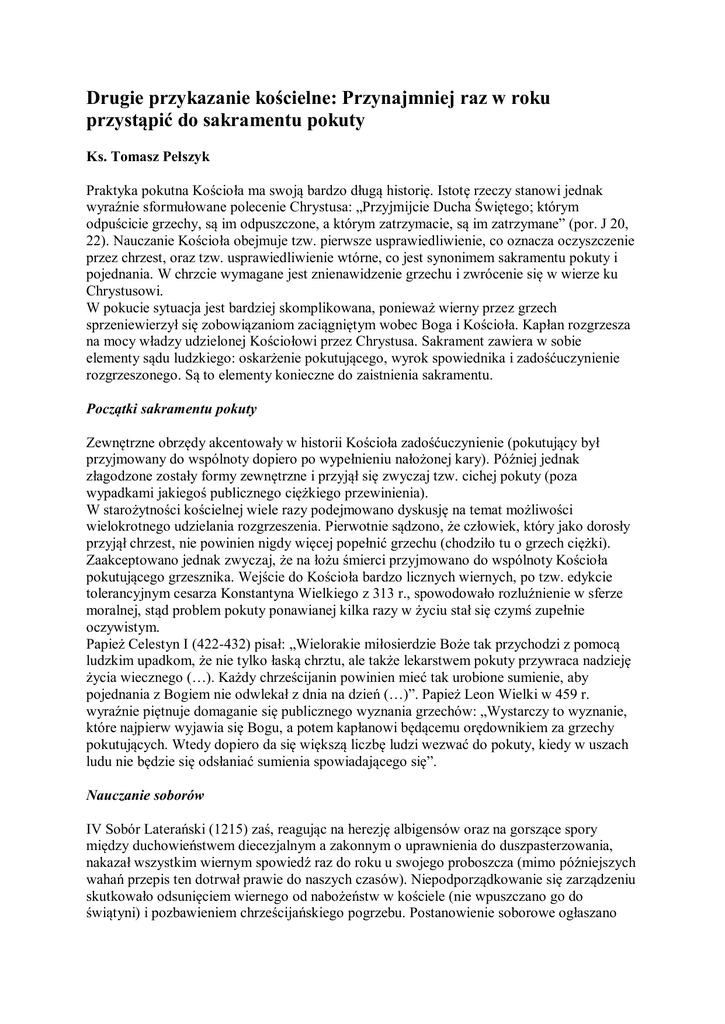 Drugie przykazanie kościelne: Przynajmniej raz w roku przystąpić do sakramentu pokuty Ks. Tomasz Pełszyk Praktyka pokutna Kościoła ma swoją bardzo długą historię. Istotę rzeczy stanowi jednak wyraźnie sformułowane polecenie Chrystusa: „Przyjmijcie Ducha Świętego; którym odpuścicie grzechy, są im odpuszczone, a którym zatrzymacie, są im zatrzymane” (por. J 20, 22). Nauczanie Kościoła obejmuje tzw. pierwsze usprawiedliwienie, co oznacza oczyszczenie przez chrzest, oraz tzw. usprawiedliwienie wtórne, co jest synonimem sakramentu pokuty i pojednania. W chrzcie wymagane jest znienawidzenie grzechu i zwrócenie się w wierze ku Chrystusowi. W pokucie sytuacja jest bardziej skomplikowana, ponieważ wierny przez grzech sprzeniewierzył się zobowiązaniom zaciągniętym wobec Boga i Kościoła. Kapłan rozgrzesza na mocy władzy udzielonej Kościołowi przez Chrystusa. Sakrament zawiera w sobie elementy sądu ludzkiego: oskarżenie pokutującego, wyrok spowiednika i zadośćuczynienie rozgrzeszonego. Są to elementy konieczne do zaistnienia sakramentu. Początki sakramentu pokuty Zewnętrzne obrzędy akcentowały w historii Kościoła zadośćuczynienie (pokutujący był przyjmowany do wspólnoty dopiero po wypełnieniu nałożonej kary). Później jednak złagodzone zostały formy zewnętrzne i przyjął się zwyczaj tzw. cichej pokuty (poza wypadkami jakiegoś publicznego ciężkiego przewinienia). W starożytności kościelnej wiele razy podejmowano dyskusję na temat możliwości wielokrotnego udzielania rozgrzeszenia. Pierwotnie sądzono, że człowiek, który jako dorosły przyjął chrzest, nie powinien nigdy więcej popełnić grzechu (chodziło tu o grzech ciężki). Zaakceptowano jednak zwyczaj, że na łożu śmierci przyjmowano do wspólnoty Kościoła pokutującego grzesznika. Wejście do Kościoła bardzo licznych wiernych, po tzw. edykcie tolerancyjnym cesarza Konstantyna Wielkiego z 313 r., spowodowało rozluźnienie w sferze moralnej, stąd problem pokuty ponawianej kilka razy w życiu stał się czymś zupełnie oczywistym. Papież Celestyn I (422-432) pisał: „Wielorakie miłosierdzie Boże tak przychodzi z pomocą ludzkim upadkom, że nie tylko łaską chrztu, ale także lekarstwem pokuty przywraca nadzieję życia wiecznego (…). Każdy chrześcijanin powinien mieć tak urobione sumienie, aby pojednania z Bogiem nie odwlekał z dnia na dzień (…)”. Papież Leon Wielki w 459 r. wyraźnie piętnuje domaganie się publicznego wyznania grzechów: „Wystarczy to wyznanie, które najpierw wyjawia się Bogu, a potem kapłanowi będącemu orędownikiem za grzechy pokutujących. Wtedy dopiero da się większą liczbę ludzi wezwać do pokuty, kiedy w uszach ludu nie będzie się odsłaniać sumienia spowiadającego się”. Nauczanie soborów IV Sobór Laterański (1215) zaś, reagując na herezję albigensów oraz na gorszące spory między duchowieństwem diecezjalnym a zakonnym o uprawnienia do duszpasterzowania, nakazał wszystkim wiernym spowiedź raz do roku u swojego proboszcza (mimo późniejszych wahań przepis ten dotrwał prawie do naszych czasów). Niepodporządkowanie się zarządzeniu skutkowało odsunięciem wiernego od nabożeństw w kościele (nie wpuszczano go do świątyni) i pozbawieniem chrześcijańskiego pogrzebu. Postanowienie soborowe ogłaszano wielokrotnie, by nikt nie mógł się tłumaczyć niewiedzą. Grzesznik mógł prosić swojego duszpasterza o pozwolenie na spowiedź u innego kapłana. Sobór przypominał jednocześnie o ścisłym obowiązku zachowania przez spowiednika tajemnicy (za jej zdradę miał być pozbawiony urzędu kapłańskiego i pokutować w odosobnieniu aż do śmierci). Wiele zamętu wprowadziła nauka Johna Wiclefa (1320-84), który głosił, że wystarczy sam żal za grzechy, a wyznawanie grzechów w spowiedzi jest już niepotrzebne. W odpowiedzi Sobór Florencki w roku 1439 przypomina o potrójnym zobowiązaniu pokutującego: skrucha serca (żal połączony z postanowieniem niegrzeszenia na przyszłość), ustna spowiedź (wyznanie wszystkich grzechów wobec kapłana) i zadośćuczynienie za grzechy (określone przez kapłana, szczególnie modlitwa, post i jałmużna). Kapłan sprawujący sakrament pokuty musi mieć władzę rozgrzeszania. Skutkiem tego sakramentu jest odpuszczenie grzechów. Swoistą kontynuacją błędów Wiclefa była nauka głoszona przez Marcina Lutra (1483-1546) na początku XVI wieku. Luter przeczył nauce katolickiej, twierdząc, że do usprawiedliwienia wystarczy sama wiara, nawet bez skruchy. Odmawiał również kapłanom (z papieżem włącznie) posiadania władzy do rozgrzeszania. Sobór Trydencki (1645-63) zareagował w sposób całościowy zarówno na błędy protestantów, jak i na wszelkie herezje i podał pozytywny wykład nauki Kościoła o sakramencie pokuty. Wskazano m.in. na formę, która zawiera się w słowach kapłana: „Ja ciebie rozgrzeszam…”, ponadto na akty penitenta, czyli żal (rozróżniono między żalem „doskonałym” i „mniej doskonałym”), wyznanie i zadośćuczynienie. Istotą i skutkiem sakramentu jest pojednanie z Bogiem. Tam, gdzie przystępowaniu do sakramentu towarzyszy pobożność, skutkiem dalszym są pokój i pogoda sumienia oraz pociecha duchowa. Szczególnie akcentowano żal jako „ból duszy i wstręt do popełnionego grzechu, z postanowieniem niegrzeszenia w przyszłości”. Doskonałość żalu zawiera się w miłości (żałuję, bo przez grzech obraziłem Boga miłującego mnie bez reszty). Żal „mniej doskonały” rodzi się z rozważania brzydoty grzechu bądź też z lęku przed karą i piekłem, ale również skłania wolę do zaprzestania grzeszenia. Z prawa Bożego wynika obowiązek wyznawania wszystkich grzechów ciężkich popełnionych po chrzcie, natomiast tzw. grzechy powszednie można wyznać z pobożności (oczyszczenie z nich można uzyskać także poza spowiedzią). Ważne jest również uczciwe u