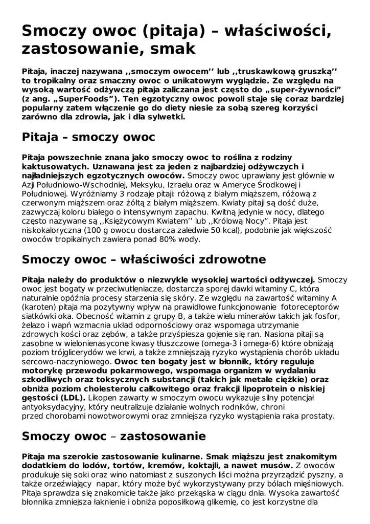Smoczy owoc (pitaja) – właściwości, zastosowanie, smak Pitaja, inaczej nazywana ,,smoczym owocem’’ lub ,,truskawkową gruszką’’ to tropikalny oraz smaczny owoc o unikatowym wyglądzie. Ze względu na wysoką wartość odżywczą pitaja zaliczana jest często do „super-żywności” (z ang. „SuperFoods”). Ten egzotyczny owoc powoli staje się coraz bardziej popularny zatem włączenie go do diety niesie za sobą szereg korzyści zarówno dla zdrowia, jak i dla sylwetki. Pitaja – smoczy owoc Pitaja powszechnie znana jako smoczy owoc to roślina z rodziny kaktusowatych. Uznawana jest za jeden z najbardziej odżywczych i najładniejszych egzotycznych owoców. Smoczy owoc uprawiany jest głównie w Azji Południowo-Wschodniej, Meksyku, Izraelu oraz w Ameryce Środkowej i Południowej. Wyróżniamy 3 rodzaje pitaji: różową z białym miąższem, różową z czerwonym miąższem oraz żółtą z białym miąższem. Kwiaty pitaji są dość duże, zazwyczaj koloru białego o intensywnym zapachu. Kwitną jedynie w nocy, dlatego często nazywane są ,,Księżycowym Kwiatem’’ lub ,,Królową Nocy”. Pitaja jest niskokaloryczna (100 g owocu dostarcza zaledwie 50 kcal), podobnie jak większość owoców tropikalnych zawiera ponad 80% wody. Smoczy owoc – właściwości zdrowotne Pitaja należy do produktów o niezwykle wysokiej wartości odżywczej. Smoczy owoc jest bogaty w przeciwutleniacze, dostarcza sporej dawki witaminy C, która naturalnie opóźnia procesy starzenia się skóry. Ze względu na zawartość witaminy A (karoten) pitaja ma pozytywny wpływ na prawidłowe funkcjonowanie fotoreceptorów siatkówki oka. Obecność witamin z grupy B, a także wielu minerałów takich jak fosfor, żelazo i wapń wzmacnia układ odpornościowy oraz wspomaga utrzymanie zdrowych kości oraz zębów, a także przyśpiesza gojenie się ran. Nasiona pitaji są zasobne w wielonienasycone kwasy tłuszczowe (omega-3 i omega-6) które obniżają poziom trójglicerydów we krwi, a także zmniejszają ryzyko wystąpienia chorób układu sercowo-naczyniowego. Owoc ten bogaty jest w błonnik, który reguluje motorykę przewodu pokarmowego, wspomaga organizm w wydalaniu szkodliwych oraz toksycznych substancji (takich jak metale ciężkie) oraz obniża poziom cholesterolu całkowitego oraz frakcji lipoprotein o niskiej gęstości (LDL). Likopen zawarty w smoczym owocu wykazuje silny potencjał antyoksydacyjny, który neutralizuje działanie wolnych rodników, chroni przed chorobami nowotworowymi oraz zmniejsza ryzyko wystąpienia raka prostaty. Smoczy owoc – zastosowanie Pitaja ma szerokie zastosowanie kulinarne. Smak miąższu jest znakomitym dodatkiem do lodów, tortów, kremów, koktajli, a nawet musów. Z owoców produkuje się soki oraz wino natomiast z suszonych liści można przyrządzić pyszny, a także orzeźwiający napar, który może być wykorzystywany przy bólach mięśniowych. Pitaja sprawdza się znakomicie także jako przekąska w ciągu dnia. Wysoka zawartość błonnika zmniejsza łaknienie i obniża poposiłkową glikemię, co jest korzystne dla błonnika zmniejsza łaknienie i obniża poposiłkową glikemię, co jest korzystne dla odchudzających się osób. Owoc ten również znalazł swoje zastosowanie w kosmetyce. Pitaja może być wykorzystywana jako dodatek do naturalnych peelingów oraz maseczek, które znakomicie nawilżają oraz odżywiają skórę twarzy. Mało tego udowodniono, iż wyciąg z pitaji zapobiega starzeniu się naszej skóry, redukując przy tym ryzyko pojawienia się wczesnych zmarszczek. Smoczy owoc – gdzie kupić i ile kosztuje? Pitaja dostępna jest w dużych sklepach spożywczych, jak i również w wielu marketach. Cena za kilogram wynosi około 10–12zł (w zależności od sklepu). Dojrzały smoczy owoc będzie miał gładką skórkę, a także będzie lekko uginał się pod naciskiem palca. Twarda skórka oznacza, że owoc nie jest gotowy do spożycia. Ze względu na atrakcyjny wygląd pitaja z pewnością przykuwa uwagę kupujących. Smoczy owoc – jak smakuje? Pitaja w smaku przypomina mieszankę kiwi oraz melona. Miąższ jest słodki i soczysty, a czasem nawet lekko kwaskowaty. Smoczy owoc smakuje wyjątkowo dobrze, gdy jest schłodzony przez co często wykorzystywany jest jako dodatek do deserów lodowych. Pitaja to owoc wyjątkowy, nie tylko ze względu na atrakcyjny wygląd i specyficzny smak, ale także wartości odżywcze, zatem idealnie nada się jako urozmaicenie codziennego menu. Author: Marcin Grzelak Link do artykułu: http://bonavita.pl/smoczy-owoc-pitaja-wlasciwosci-zastosowanie-smak