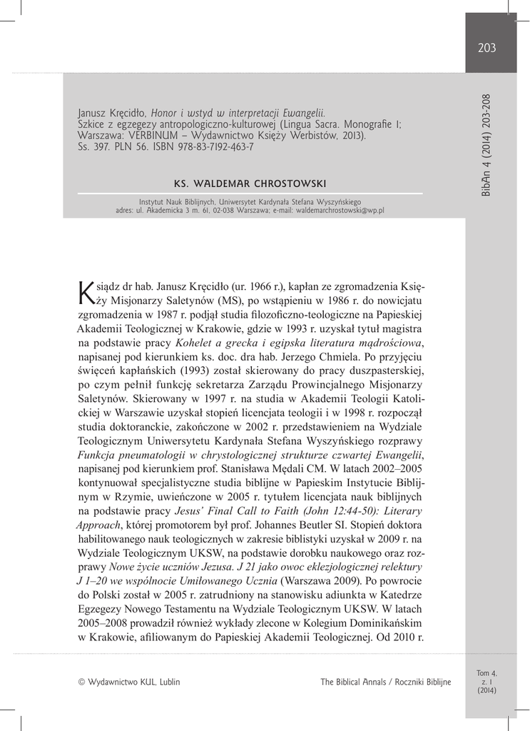 Janusz Kręcidło, Honor i wstyd w interpretacji Ewangelii. Szkice z egzegezy… antropologiczno-kulturowej (Lingua Sacra. Monografie 1; Warszawa: VERBINUM – Wydawnictwo Księży Werbistów, 2013). Ss. 397. PLN 56. ISBN 978-83-7192-463-7 KS. WALDEMAR CHROSTOWSKI BibAn 4 (2014) 203-208 203 Instytut Nauk Biblijnych, Uniwersytet Kardynała Stefana Wyszyńskiego adres: ul. Akademicka 3 m. 61, 02-038 Warszawa; e-mail: [email protected] K siądz dr hab. Janusz Kręcidło (ur. 1966 r.), kapłan ze zgromadzenia Księży Misjonarzy Saletynów (MS), po wstąpieniu w 1986 r. do nowicjatu zgromadzenia w 1987 r. podjął studia filozoficzno-teologiczne na Papieskiej Akademii Teologicznej w Krakowie, gdzie w 1993 r. uzyskał tytuł magistra na podstawie pracy Kohelet a grecka i egipska literatura mądrościowa, napisanej pod kierunkiem ks. doc. dra hab. Jerzego Chmiela. Po przyjęciu święceń kapłańskich (1993) został skierowany do pracy duszpasterskiej, po czym pełnił funkcję sekretarza Zarządu Prowincjalnego Misjonarzy Saletynów. Skierowany w 1997 r. na studia w Akademii Teologii Katolickiej w Warszawie uzyskał stopień licencjata teologii i w 1998 r. rozpoczął studia doktoranckie, zakończone w 2002 r. przedstawieniem na Wydziale Teologicznym Uniwersytetu Kardynała Stefana Wyszyńskiego rozprawy Funkcja pneumatologii w chrystologicznej strukturze czwartej Ewangelii, napisanej pod kierunkiem prof. Stanisława Mędali CM. W latach 2002–2005 kontynuował specjalistyczne studia biblijne w Papieskim Instytucie Biblijnym w Rzymie, uwieńczone w 2005 r. tytułem licencjata nauk biblijnych na podstawie pracy Jesus’ Final Call to Faith (John 12:44-50): Literary Approach, której promotorem był prof. Johannes Beutler SI. Stopień doktora habilitowanego nauk teologicznych w zakresie biblistyki uzyskał w 2009 r. na Wydziale Teologicznym UKSW, na podstawie dorobku naukowego oraz rozprawy Nowe życie uczniów Jezusa. J 21 jako owoc eklezjologicznej relektury J 1–20 we wspólnocie Umiłowanego Ucznia (Warszawa 2009). Po powrocie do Polski został w 2005 r. zatrudniony na stanowisku adiunkta w Katedrze Egzegezy Nowego Testamentu na Wydziale Teologicznym UKSW. W latach 2005–2008 prowadził również wykłady zlecone w Kolegium Dominikańskim w Krakowie, afiliowanym do Papieskiej Akademii Teologicznej. Od 2010 r. © Wydawnictwo KUL , Lublin The Biblical Annals / Roczniki Biblijne Tom 4, z. 1 (2014) 204 B ook R ev i ew s Ks. Waldemar Chrostowski Vol. 4, no. 1 (2014) jest zatrudniony na stanowisku profesora nadzwyczajnego i pełni funkcję kierownika Katedry Historii Biblijnej na Wydziale Teologicznym UKSW. Monografia przedstawiona w postępowaniu do tytułu naukowego profesora ukazała się w 2013 r. jako pierwszy tom nowej serii wydawniczej opatrzonej nazwą „Lingua Sacra. Monografie”. Podjęta w niej problematyka rozwija jeden z głównych nurtów zainteresowań i osiągnięć badawczych autora, od pewnego czasu coraz wyraźniejszy w jego publikacjach i wystąpieniach, a mianowicie socjologiczną i antropologiczno-kulturową egzegezę tekstów biblijnych. Autor czerpie i obficie korzysta z wiedzy i doświadczeń nabytych podczas licznych i owocnych kontaktów zagranicznych, wśród których na pierwszy plan wysuwają się znajomości i przyjaźnie z biblistami amerykańskimi. Ich potwierdzeniem jest słowo wstępne (s. 11-12), które napisał prof. John J. Pilch, wykładowca w The Johns Hopkins University w Baltimore. Monografię otwiera spis treści (s. 6-9) i wstęp do serii wydawniczej (s. 10), napisany przez jej założyciela i redaktora ks. Krzysztofa Siwka, wspomniane słowo wstępne prof. J.J. Pilcha oraz odautorski wstęp (s. 13-24). Zarówno J.J. Pilch, jak i J. Kręcidło mocno podkreślają nowość zastosowanej metodologii, charakterystycznej dla social science criticism, która na dobre zawitała do Polski w 2001 r. podczas wykładów w Papieskiej Akademii Teologicznej w Krakowie. Właśnie wtedy J. Kręcidło dostrzegł i docenił wagę poznawania kluczowych wartości kultury śródziemnomorskiej, z których wiele znajduje odzwierciedlenie w losach bohaterów i wydarzeniach przedstawionych na kartach Biblii. Słowo wstępne otwiera nawiązanie do dokumentu (nie jest to jednak „papieska instrukcja”, jak czytamy na s. 14) Papieskiej Komisji Biblijnej Interpretacja Biblii w Kościele (1993), który stał się inspiracją do wyjścia poza diachroniczne podejście do Biblii w kierunku synchronii wykorzystującej nowe metody i sposoby analizy literackiej, kulturowej i historycznej, wśród nich „podejścia przez nauki humanistyczne”. Autor zapowiada wybór i zastosowanie jednego z aspektów metodologii antropologiczno-kulturowej, mianowicie „honor i wstyd”, który w polskim przekładzie dokumentu PKB został, niezbyt fortunnie, przetłumaczony jako „cześć i niesława”. Wyszczególniając cztery poddyscypliny antropologii, z których jedną jest antropologia kulturowa, J. Kręcidło podaje zarys rozwoju nauk społecznych, zapoczątkowanych w połowie XVII w., oraz zasadnicze kierunki badawcze przyjmowane również w badaniach nad Biblią. Opowiada się za tymi badaczami, którzy „koncentrują się przede wszystkim na eksploracji społeczno-kulturowego milieu, w którym powstawały księgi Nowego Testamentu, przyjmując za punkt odniesienia elementy kulturowe determinujące społeczne interakcje” (s. 18). Dodajmy, że analiza wybranych tekstów Ewangelii kanonicznych The Biblical Annals / Roczniki Biblijne 205 w perspektywie metodologicznej honoru i wstydu została z dużym powodzeniem zastosowana w kilkunastu wcześniejszych publikacjach autora. Rozdział pierwszy (s. 25-80) nosi tytuł „Panoramiczne spojrzenie na zagadnienie honoru i wstydu oraz prezentacja zastosowanej metody badawczej”. Wychodząc od wstępnego określenia rzeczywistości honoru i wstydu jako koncepcji dynamicznych i relacyjnych, przedstawia się opracowaną pod tym kątem historię 