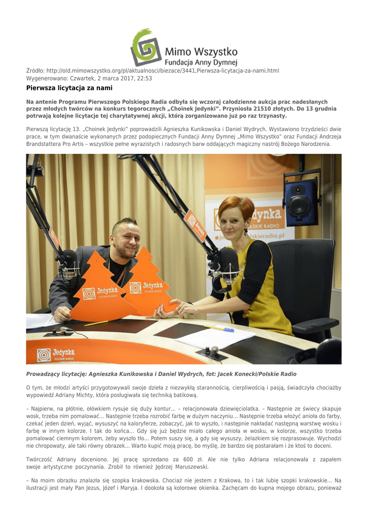 Źródło: http://old.mimowszystko.org/pl/aktualnosci/biezace/3441,Pierwsza-licytacja-za-nami.html Wygenerowano: Czwartek, 2 marca 2017, 22:53 Pierwsza licytacja za nami Na antenie Programu Pierwszego Polskiego Radia odbyła się wczoraj całodzienne aukcja prac nadesłanych przez młodych twórców na konkurs tegorocznych „Choinek Jedynki”. Przyniosła 21510 złotych. Do 13 grudnia potrwają kolejne licytacje tej charytatywnej akcji, którą zorganizowano już po raz trzynasty. Pierwszą licytację 13. „Choinek Jedynki” poprowadzili Agnieszka Kunikowska i Daniel Wydrych. Wystawiono trzydzieści dwie prace, w tym dwanaście wykonanych przez podopiecznych Fundacji Anny Dymnej „Mimo Wszystko” oraz Fundacji Andrzeja Brandstattera Pro Artis – wszystkie pełne wyrazistych i radosnych barw oddających magiczny nastrój Bożego Narodzenia. Prowadzący licytację: Agnieszka Kunikowska i Daniel Wydrych, fot: Jacek Konecki/Polskie Radio O tym, że młodzi artyści przygotowywali swoje dzieła z niezwykłą starannością, cierpliwością i pasją, świadczyła chociażby wypowiedź Adriany Michty, która posługiwała się techniką batikową. – Najpierw, na płótnie, ołówkiem rysuje się duży kontur… – relacjonowała dziewięciolatka. – Następnie ze świecy skapuje wosk, trzeba nim pomalować… Następnie trzeba rozrobić farbę w dużym naczyniu… Następnie trzeba włożyć anioła do farby, czekać jeden dzień, wyjąć, wysuszyć na kaloryferze, zobaczyć, jak to wyszło, i następnie nakładać następną warstwę wosku i farbę w innym kolorze. I tak do końca… Gdy się już będzie miało całego anioła w wosku, w kolorze, wszystko trzeba pomalować ciemnym kolorem, żeby wyszło tło… Potem suszy się, a gdy się wysuszy, żelazkiem się rozprasowuje. Wychodzi nie chropowaty, ale taki równy obrazek… Warto kupić moją pracę, bo myślę, że bardzo się postarałam i że ktoś to doceni. Twórczość Adriany doceniono. Jej pracę sprzedano za 600 zł. Ale nie tylko Adriana relacjonowała z zapałem swoje artystyczne poczynania. Zrobił to również Jędrzej Maruszewski. – Na moim obrazku znalazła się szopka krakowska. Chociaż nie jestem z Krakowa, to i tak lubię szopki krakowskie… Na ilustracji jest mały Pan Jezus, Józef i Maryja. I dookoła są kolorowe okienka. Zachęcam do kupna mojego obrazu, ponieważ bardzo dużo na niego pracowałem. Tam jest dużo dorodnych szczegółów. Szczegóły właśnie w takich obrazkach są bardzo trudne do namalowania. Gdyby państwo mieli namalować taki obrazek, wcale by nie było wam tak łatwo – podkreślił dziewięciolatek, którego dzieło sprzedano ostatecznie za 400 złotych. Wystawione w studiu „Jedynki” prace czekają na nowych właścicieli, fot.: Bartosz Wojciechowski/Polskie Radio Głos na antenie zabierali także jurorzy, którzy oceniali nadesłane na konkurs prace. W tym roku byli to: prof. Danuta Kołwzan-Nowicka – artystka malarz, grafik, pedagog, dr Katarzyna Kasia – filozof, estetyk, pedagog, i prof. Franciszek Maśluszczak – artysta malarz, pedagog. Wypowiadając się o dokonaniach najmłodszych przyjaciół radiowej „Jedynki”, eksperci nieraz używali – z pełna powagą – określeń: „artysta”, „artystka” albo „dzieło sztuki”. Co więcej – wspominali mimochodem, że zakup wystawionych na licytację prac może okazać się wkrótce niezłą inwestycją. Z godziny na godziny aukcyjny licznik coraz bardziej się piął – wprost proporcjonalnie do emocji gości w studiu „Jedynki” oraz prowadzących licytację. Tuż przed 14.00 najwyższą cenę osiągał obrazek 14-letniego Łukasza Ściślera, przedstawiający Święta Rodzinę pod choinką z… psem (osiągnął cenę 1800 zł). Ogólna suma licytacji trzydziestu dwóch prac wynosiła wtedy 9370 zł. O 14.13 licznik pokazywał już kwotę 10300 zł. O 15.00 w studiu powitano Annę Dymną. – Jak tu u was jest cudownie kolorowo! – zachwyciła się aktorka. – Jakie te dzieci są zdolne! I jak pięknie ich obrazki oprawiono! Osoba, która kupi pracę za najwyższą kwotę, otrzyma przygotowaną z masy solnej i pomalowaną przeze mnie choinko-szopeczkę. Jest w niej siedem serduszek, aniołek, dzięcioł, ptaszek rajski i ptaszek pomarańczowy, Maryja, Józef i Dzieciątko, i kaczuszka, krowa oraz kotek. I gwiazdki też są. W tej choinko-szopeczce znajduje się bardzo dużo mojego uśmiechu, dobrych myśli i radości. Na pewno przyniesie więc szczęście. W studiu uwadze nie umknie żaden telefon ani SMS, fot.: Jacek Konecki/Polskie Radio Anna Dymna przygotowała także kolorowe aniołki z masy solnej – dla słuchaczy, którzy kupili obrazki namalowane przez podopiecznych Fundacji „Mimo Wszystko”. Tuż przed 19.00, w ostatniej półgodzinie trwania licytacji, w studiu pojawiła się Małgorzata Kownacka, opiekunka wszystkich edycji konkursu plastycznego „Choinek Jedynki”, a także dr Katarzyna Kasia – filozof, estetyk i pedagog, która oceniała nadesłane obrazki. – Z ogromną przyjemnością i wzruszeniem oglądałam te prace – przyznała jurorka. – Są bardzo różne: niektóre minimalistyczne, ale przepięknie graficzne, inne zawierają superkolorowe wizje. Wszystkie zachwycają. Znakomity jest na przykład obrazek Fryderyka Otolskiego. Znajdujące się tam gwiazdki rozjaśnią zapewne każdy mrok. Dziwi mnie, że taka sztuka warta jest na razie tylko 400 złotych. Od lewej: jurorka konkursu plastycznego dr Katarzyna Kasia oraz dobry duch licytacji prac dzieci Małgorzata Kownacka, fot.: Jacek Konecki/Polskie Radio Po takiej fachowej rekomendacji, obrazek namalowany przez 9-letniego Fryderyka stał się jedną z najdroższych prac tegorocznej licytacji „Choinek Jedynki”. Ostatecznie osiągnął cenę 1800 zł. Najwyżej w tym rankingu uplasowała się praca 14-letniego Łukasza Ścislera – 3000 zł, drugie miejsce przypadło twórczości 16-letniej Magdaleny Łozińs