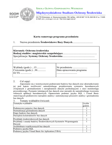 SZKOŁA GŁÓWNA GOSPODARSTWA WIEJSKIEGO Międzywydziałowe Studium Ochrony Środowiska SGGW tlx 816 238 sggw pl fax 847-24-53 02-776 Warszawa, ul. Nowoursynowska 159, tel/fax: +48 22 847 12 33, 843 90 41 w. 11245 e-mail: [email protected]; http://www.sggw.waw.pl/ Karta ramowego programu przedmiotu 1. Nazwa przedmiotu Środowiskowe Bazy Danych............................... Kierunek: Ochrona środowiska Rodzaj studiów: magisterskie uzupełniające.................................................... Specjalizacja: Systemy Ochrony Środowiska................................................. ............................................................................................................................... Wykłady (godz.) ...15.............. Ćwiczenia (godz.) ..30............. ECTS ................. 2. Nr przedmiotu ...................... Data opracowania programu ............................... Cel zajęć: Zapoznanie się z teoretycznymi podstawami budowy baz danych oraz ukierunkowanie jej pod kątem moŜliwości samodzielnego projektowania systemów bazodanowych związanych z gromadzeniem i zarządzaniem danymi pochodzącymi z sieci monitoringu przyrodniczego. Poznanie istniejących baz danych oraz narzędzi do samodzielnego tworzenia własnych aplikacji bazodanowych. Opanowanie podstaw języka SQL i Visual Basic stanowiących podstawowe narzędzie analizy i automatyzacji procesów analizy i gromadzenia baz danych. 3. Tematy wykładów/ćwiczeń: Tematyka wykładów Podstawowe pojęcia z baz danych Normalizacja gromadzenia danych Etapy budowy baz danych Narzędzia konstruktorów baz danych Przykłady środowiskowych baz danych Przykłady i zasady budowy Środowiskowych Systemów Wspomagania Decyzji Architektura współczesnych baz danych Podstawy języka SQL Podstawy języka Visual Basic for Aplication (VBA) Liczba godzin 1 1 1 1 1 1 1 1 1 Podstawy języka VBA cd Projektowanie geograficznych baz danych Automatyka procesu wprowadzania danych Budowa internetowych systemów dostępu do danych Serwery SQL Przykłady i narzędzia budowy aplikacji PHP i ASP – internetowych interfejsów wprowadzania danych SUMA Tematyka ćwiczeń Wykonanie przykładowej bazy danych wspólnie z prowadzącym obejmującej: projekt jej struktury, wykonanie tabel, formularzy, wprowadzenie danych, analizę danych w języku SQL, tworzenie aplikacji VBA celem zautomatyzowanie procesu wprowadzania danych, stworzenie formularzy internetowego dostępu do danych, podłączenia baz do programu ArcGIS Przykład budowy geograficznej bazy danych w systemie ArcInfo Workstation Wykonanie własnego (lub wydanego przez prowadzącego) projektu bazy w zakresie zgodnym z w/w przykładem Prezentacja i obrona projektów baz danych Kolokwium i zaliczenie ćwiczeń SUMA 4. 1 1 1 1 1 1 15 Liczba godzin 16 2 8 2 2 30 Warunki zaliczenia przedmiotu: Warunkiem zaliczenia wykładów jest egzamin pisemny. Natomiast podstawą zaliczenia ćwiczeń jest wykonanie aplikacji bazodanowej oraz zaliczenie kolokwium. 5. Efekty kształcenia – nabyte umiejętności i kompetencje: Projektanta i twórcy relacyjnych baz danych z zakresu środowiskowych systemów wspomagania decyzji 6. Autorzy programu ramowego: dr inŜ. Ignacy Kardel 7. 8. Wydział/Katedra: Wydział InŜynierii i Kształtowania Środowiska/ Katedra InŜynierii Wodnej i Rekultywacji Środowiska Wymagane pomoce dydaktyczne: Komputer i oprogramowanie Microsoft Office i ArcGis 9. Literatura: Date C.J., 2005: Relacyjne bazy danych dla praktyków. Helion. Warszawa. OPI, 1997: Bazy Danych. Ośrodek Przetwarzania Informacji. Warszawa. Wilton P., Colby J., 2005: SQL. Od podstaw. Warszawa. ESRI, 2002: Building geodatabase. Informacja o przedmiocie w języku angielskim: 1. Subject name ...Environmental Database 2. Lecture topics/practices topic ....................................................................... Lecture topics: Designing and building geodatabase. Examples of Environmental Decision Support Systems. Getting started with SQL and VBA language. Create data access web pages. Practices topic: The collateral execution of geodatabase at using ARCGIS and MSAccess software. The realization and defending of own applications. 3. Pass conditions A condition of pass lectures is the written examination. Instead a base of pass practices is the realization and defends of the application and the colloquium.