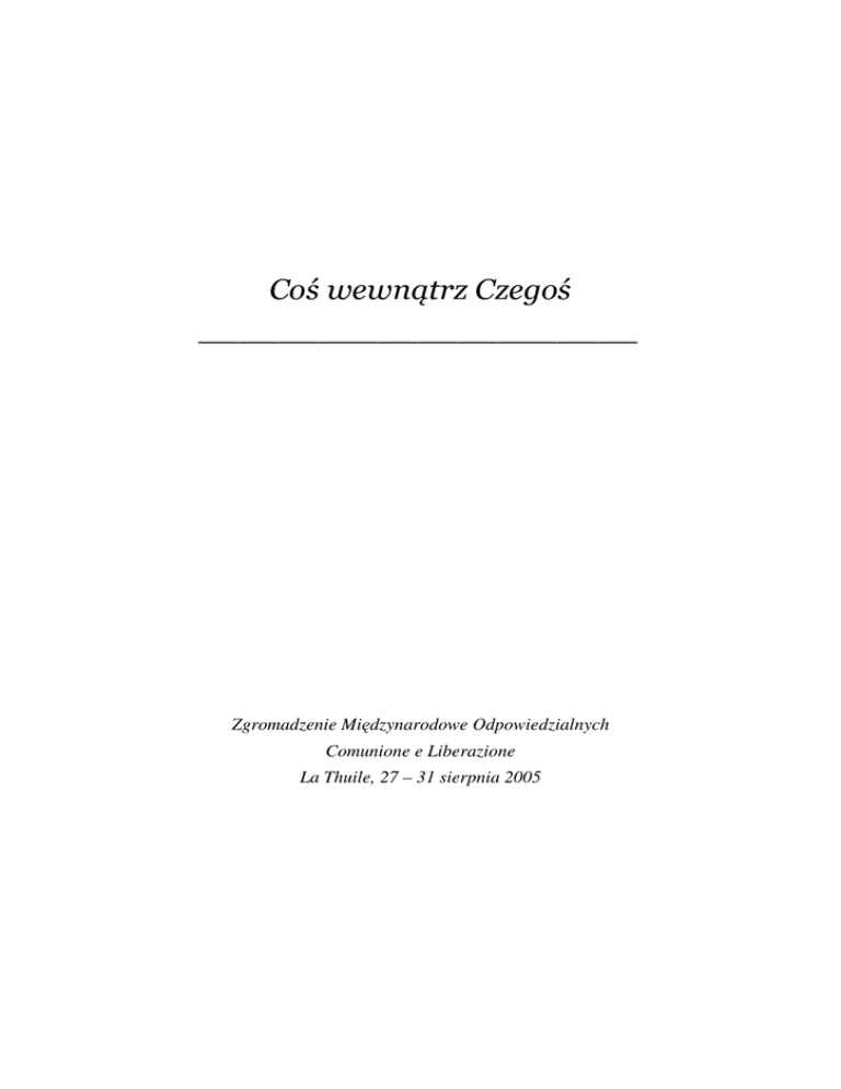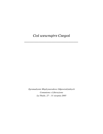 Coś wewnątrz Czegoś ______________________ Zgromadzenie Międzynarodowe Odpowiedzialnych Comunione e Liberazione La Thuile, 27 – 31 sierpnia 2005 Sobota wieczór, 27 sierpnia 2005 WPROWADZENIE ------------------------------------------------- Julián Carrón Każdy z nas przybył tu z jakimś oczekiwaniem w sercu, z pragnieniem spełnienia: im większa jest świadomość wielkości tego pragnienia, tym bardziej człowiek zdaje sobie sprawę, iż sam z siebie nie jest w stanie na nie odpowiedzieć. Stąd też tym, co każdy odczuwa jako najbardziej własne, najbardziej współbrzmiące z tą potrzebą, jest błaganie: albowiem to ktoś Inny jest tym, który odpowiada, który wypełnia, my bowiem jesteśmy biedakami, żebrakami czegoś, czego sami sobie nie możemy dać. Dlatego zaczynamy, błagając tego jednego jedynego, który jest w stanie odpowiedzieć, czyli Ducha Świętego. (Hymn: Przybądź Duchu Święty) Pragnę pozdrowić osobiście każdego z was i wyrazić radość z tego naszego spotkania odpowiedzialnych w La Thuile. Przybyliśmy z 70 Krajów, w których obecny jest Ruch. W szczególny sposób pragniemy pozdrowić przyjaciół z Estonii, Hondurasu, Południowej Afryki oraz Indii, którzy są tu po raz pierwszy. Nasze dzisiejsze spotkanie, jak mogliście to przeczytać w ogłoszonym wczoraj komunikacie, nie może rozpocząć się inaczej, jak właśnie od łaski, jakiej doznaliśmy wczoraj, czyli od audiencji u Papieża Benedykta XVI, w jakiej wczoraj wraz z don Pino i Cesaną mogliśmy uczestniczyć. Zapytałem Papieża, czy mogę przekazać wam jego pozdrowienie, a on natychmiast odpowiedział: „Oczywiście!”. Tak więc najserdeczniejsze pozdrowienia od papieża Benedykta XVI! Rozmowa, jaką z nim odbyłem, dotyczyła tego, co zamierzamy robić w tych dniach. Papież był niezwykle zainteresowany naszym doświadczeniem w całym jego bogactwie. Pytał mnie o wszystko, i to jest po prostu niesamowite, że ktoś tak wielki stawia tyle pytań! Cała rozmowa/dialog była ciągiem następujących po sobie pytań, na które starałem się jak najlepiej i możliwie najbardziej syntetycznie odpowiadać. Sprawa, której poświęciliśmy najwięcej czasu dotyczyła wychowania. Wspominam o tym, aby uczynić was uczestnikami trosk Papieża, pokazać to, czemu on w szczególny sposób przygląda się w naszym doświadczeniu, a zatem, aby pobudzić nas do odpowiedzialności, jaką mamy w obliczu danego nam charyzmatu. Nade wszystko jednak, jeszcze przed odpowiedzialnością za charyzmat, staje odpowiedzialność za każdego z nas. Pierwszą sprawą, z której musimy sobie zdać sprawę jest ta, iż my nie różnimy się od wszystkich innych: żyjemy, jesteśmy powołani, aby żyć wiarą w takich samych okolicznościach, jak wszyscy inni ludzie i także nas dotyczy walka przeciwko nicości. Nie jesteśmy od niej wolni, i nic nam nie zostaje zaoszczędzone. Stąd też jeśli pośród nas nie zaistnieje na nowo chrześcijaństwo jako wydarzenie, podobnie jak dla każdego, kogo spotykamy, prędzej czy później przynależność do Chrystusa zacznie tracić na zainteresowaniu, i zwycięży nihilizm. Zastanawiałem się nad tym w ostatnich dniach podczas Meetingu, gdy rozbrzmiewały oklaski po wygłoszonej przeze mnie lekcji, gdyż one nie były tylko dla mnie. Myślałem sobie: „Za każdym z tych klaszczących stoi cała historia, 2 stoi historia spotkania, weryfikacji tego spotkania; ci ludzie nie są sentymentalistami, którzy znaleźli się tu przez przypadek”. Wszyscy oni, i każdy z osobna, którzy tam byli, znaleźli się tam, ponieważ zafascynował ich Chrystus. A zatem, jeśli to nie będzie się wydarzało nieustannie, jeśli każdy z nas nie pozwoli pociągać się Chrystusowi, nie sposób, by także w nas nie zwyciężyła nicość. Nie uporaliśmy się z tym dramatem i ów dramat rozgrywa się w każdym z nas. Walka rozgrywa się każdego dnia w sercu każdego z nas, w osobistym, tajemniczym dialogu pomiędzy „ja” każdego z nas a fascynacją Chrystusem. Bez zwycięstwa tej fascynacji jesteśmy skończeni, zarówno najmłodsi, jak i najstarsi, ten, kto przybywa tu dziś po raz pierwszy oraz ci, którzy są od pierwszego dnia. A jutro, zaledwie otworzysz oczy, ów dramat pojawi się na nowo. Stąd też my, teraz po odejściu ks. Giussaniego, podobnie jak i wcześniej, gdy on był wśród nas, stajemy w obliczu tego wyboru: Comunione e Liberazione może przetrwać jako organizacja jeszcze przez pewien okres czasu, tak jak trwają różne inne rzeczy; albo będzie ono kontynuowane jako doświadczenie życiowe, jako fascynacja porywająca [pociągająca] za sobą całe ja. Tylko to staje się na nowo propozycją dla każdego z nas. A oto czego pragniemy w tych dniach. Nie zamierzam ani o gram pomniejszać dramat relacji każdego z was z Chrystusem. Nie jesteśmy tu, by zaoszczędzić sobie [uwolnić się od] owego dramatu, ale by go nieustannie pobudzać, i dlatego chcemy pomóc sobie w tym, zmieniając sposób bycia razem w tym geście. Po Rekolekcjach Bractwa, przez które zostaliśmy sprowokowani w zakresie naszego pragnienia szczęścia, pełni, do nadziei, która zawieść nie może nie chcieliśmy dodawać kolejnej lekcji, zanim nie popracujemy najpierw nad tym, co dotychczas usłyszeliśmy. Powiedzieliśmy sobie: zaproponujmy wszystkim naszym przyjaciołom taką pracę, ponieważ Ruch nie jest jakąś szkołą, w której ktoś raz na jakiś czas wygłasza wykłady, ale jest towarzyszeniem sobie ku przeznaczeniu. Ruch o tyle będzie nas interesował, o ile będzie wędrówką ku przeznaczeniu, jeśli temu będzie służył, jeśli będzie służył życiu, wędrowaniu, nie poddawaniu się nicości, w przeciwnym razie przestanie nas interesować, a my przybywając tutaj stracimy tydzień wakacji. Co zatem wydarzyło się podczas Rekolekcji? Jakie pytania zrodziły się z naszej pracy? Jakie trudności pojawiły się? Czego nie zrozumieliśmy? Jesteśmy tutaj, a