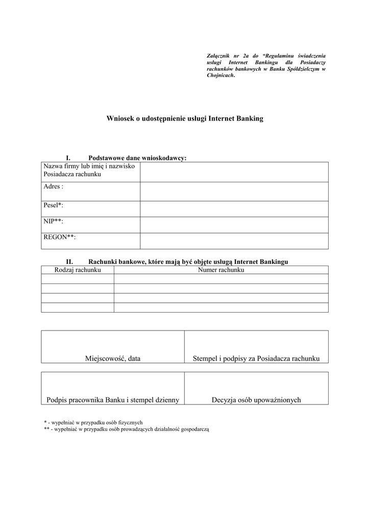 Załącznik nr 2a do “Regulaminu świadczenia usługi Internet Bankingu dla Posiadaczy rachunków bankowych w Banku Spółdzielczym w Chojnicach. Wniosek o udostępnienie usługi Internet Banking I. Podstawowe dane wnioskodawcy: Nazwa firmy lub imię i nazwisko Posiadacza rachunku Adres : Pesel*: NIP**: REGON**: II. Rachunki bankowe, które mają być objęte usługą Internet Bankingu Rodzaj rachunku Numer rachunku Miejscowość, data Stempel i podpisy za Posiadacza rachunku Podpis pracownika Banku i stempel dzienny Decyzja osób upoważnionych * - wypełniać w przypadku osób fizycznych ** - wypełniać w przypadku osób prowadzących działalność gospodarczą