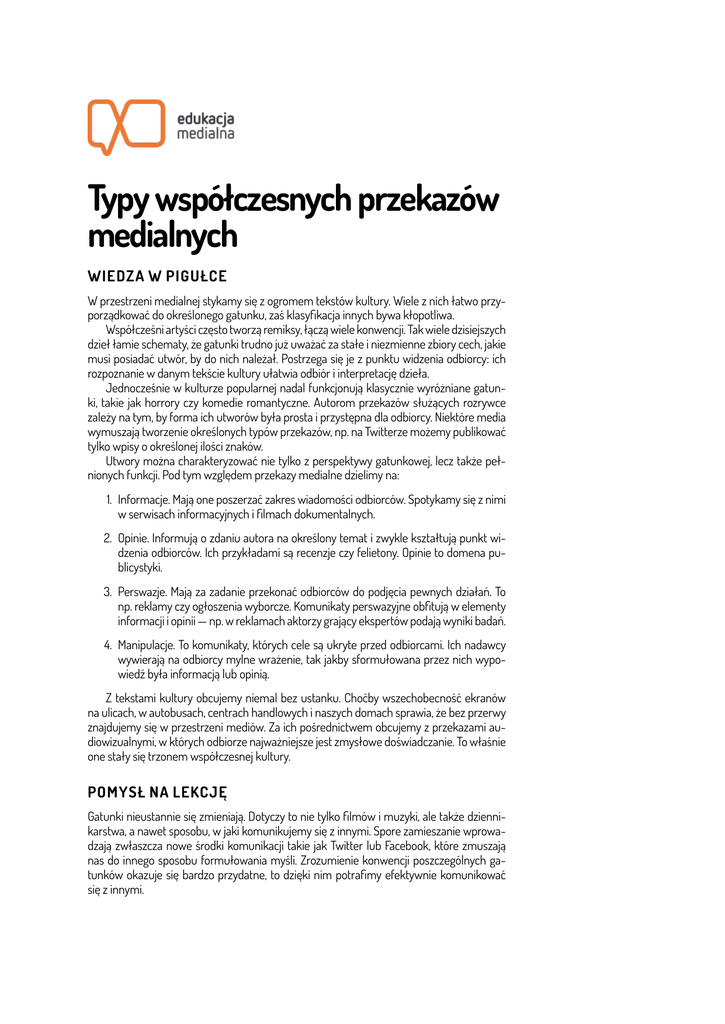 Typy współczesnych przekazów medialnych W przestrzeni medialnej stykamy się z ogromem tekstów kultury. Wiele z nich łatwo przyporządkować do określonego gatunku, zaś klasyfikacja innych bywa kłopotliwa. Współcześni artyści często tworzą remiksy, łączą wiele konwencji. Tak wiele dzisiejszych dzieł łamie schematy, że gatunki trudno już uważać za stałe i niezmienne zbiory cech, jakie musi posiadać utwór, by do nich należał. Postrzega się je z punktu widzenia odbiorcy: ich rozpoznanie w danym tekście kultury ułatwia odbiór i interpretację dzieła. Jednocześnie w kulturze popularnej nadal funkcjonują klasycznie wyróżniane gatunki, takie jak horrory czy komedie romantyczne. Autorom przekazów służących rozrywce zależy na tym, by forma ich utworów była prosta i przystępna dla odbiorcy. Niektóre media wymuszają tworzenie określonych typów przekazów, np. na Twitterze możemy publikować tylko wpisy o określonej ilości znaków. Utwory można charakteryzować nie tylko z perspektywy gatunkowej, lecz także pełnionych funkcji. Pod tym względem przekazy medialne dzielimy na: 1. Informacje. Mają one poszerzać zakres wiadomości odbiorców. Spotykamy się z nimi w serwisach informacyjnych i filmach dokumentalnych. 2. Opinie. Informują o zdaniu autora na określony temat i zwykle kształtują punkt widzenia odbiorców. Ich przykładami są recenzje czy felietony. Opinie to domena publicystyki. 3. Perswazje. Mają za zadanie przekonać odbiorców do podjęcia pewnych działań. To np. reklamy czy ogłoszenia wyborcze. Komunikaty perswazyjne obfitują w elementy informacji i opinii — np. w reklamach aktorzy grający ekspertów podają wyniki badań. 4. Manipulacje. To komunikaty, których cele są ukryte przed odbiorcami. Ich nadawcy wywierają na odbiorcy mylne wrażenie, tak jakby sformułowana przez nich wypowiedź była informacją lub opinią. Z tekstami kultury obcujemy niemal bez ustanku. Choćby wszechobecność ekranów na ulicach, w autobusach, centrach handlowych i naszych domach sprawia, że bez przerwy znajdujemy się w przestrzeni mediów. Za ich pośrednictwem obcujemy z przekazami audiowizualnymi, w których odbiorze najważniejsze jest zmysłowe doświadczanie. To właśnie one stały się trzonem współczesnej kultury. Gatunki nieustannie się zmieniają. Dotyczy to nie tylko filmów i muzyki, ale także dziennikarstwa, a nawet sposobu, w jaki komunikujemy się z innymi. Spore zamieszanie wprowadzają zwłaszcza nowe środki komunikacji takie jak Twitter lub Facebook, które zmuszają nas do innego sposobu formułowania myśli. Zrozumienie konwencji poszczególnych gatunków okazuje się bardzo przydatne, to dzięki nim potrafimy efektywnie komunikować się z innymi. ele peracy ne Uczestniczki i uczestnicy zajęć: • rozumieją, że żyjemy w epoce kolażu, w której granice poszczególnych konwencji gatunkowych są celowo łamane; • wiedzą, że poszczególne środki przekazu, z których korzystamy, komunikując się z innymi, wymagają odmiennych zasad formułowania swoich myśli; • pamiętają, że wiedza na temat gatunków i różnic pomiędzy nimi często bywa przydatna w życiu, jest częścią medialnego savoir-vivre; • potrafią formułować własne komunikaty w zrozumiały sposób, niezależnie od typu medium, z którego korzystają. rze ie za 1. Czas: 5 min Forma: dyskusja Pomoce: tablica, kreda lub marker Zadaj pytanie: • Jakie cechy powinny charakteryzować przekazy o charakterze • informacyjnym, • opinii, • perswazji, • manipulacji? Najistotniejsze cechy wskazywane przez uczestniczki i uczestników zajęć zapisuj w punktach na tablicy. Jako pytania pomocnicze rozważ: • Co odróżnia opinię od informacji? • Czy każda opinia ma charakter perswazji? • Gdzie leży granica pomiędzy perswazją a manipulacją? • Jaki charakter mają reklamy — perswazji, manipulacji czy może opinii? • Jaki charakter mają najczęściej programy publicystyczne w radiu i telewizji — perswazyjny, opiniotwórczy, informacyjny, a może mają cechy manipulacji? • Czy łatwo jest odróżnić poszczególne gatunki medialne we współczesnych środkach masowego przekazu? 2. Czas: 10 min Forma: praca wgrupach Urszula Dobrowolska, Michał Wysocki, Piotr Drzewiecki Typy współczesnych przekazów medialnych 2 Podziel uczestniczki i uczestników zajęć na 4 grupy. Każdy z zespołów poproś o przygotowanie krótkich (nie dłuższych niż 2–3 zdania) przekazów medialnych w formie: • informacyjnej, • opinii, • przekazu perswazyjnego, • manipulacji. Za każdym razem przekaz powinien dotyczyć tej samej sytuacji: stomatolog, wypowiadając się do kamery, mówi o bardzo korzystnych dla zdrowia właściwościach nowej pasty do zębów. W jaki sposób powinna zostać przygotowana jego wypowiedź, aby była zgodna z konwencją wskazanych gatunków medialnych? 3. Czas: 10 min Forma: dyskusja Poproś kolejne zespoły o zaprezentowanie wyników ich pracy. Zachęć pozostałe grupy do wygłaszania komentarzy i opinii. Jako pytania pomocnicze rozważ: • Jakie warunki muszą zostać spełnione, aby zakwalifikować przekaz jako informacyjny? • Czym powinien różnić się przekaz perswazyjny od opinii? • W jakich okolicznościach przekaz przyjmie postać manipulacji? (Przykładowo: gdyby okazało się, że wypowiadająca się osoba nie jest lekarzem, a aktorem, lub gdyby przytaczane przez nią dane nie odwoływały się do autentycznych badań.) • Jaki charakter mają najczęściej reklamy, które oglądamy w telewizji lub których słuchamy w radiu? • W jaki sposób możemy starać się ustrzec przed uleganiem manipulacjom, które stosowane są w reklamach produktów różnego typu? 4. Czas: 5 min Forma: praca wgrupach Pomoce: materiał pomocniczy „Typy współczesnych przekazów medialnych” Podziel uczestniczki i uczestników zajęć na 6 grup. Każdy z zespołów powinien otrzymać jeden los z ma