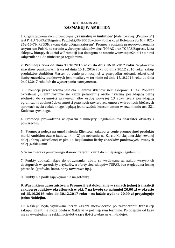 REGULAMIN AKCJI ZASMAKUJ W AMBITION 1. Organizatorem akcji promocyjnej „Zasmakuj w Ambition” (dalej zwanej: „Promocją”) jest P.H.U. TOPAZ Zbigniew Paczóski, 08-300 Sokołów Podlaski, ul. Kolejowa 8b, NIP: 821262-10-76; REGON, zwane dalej „Organizatorem”. Promocja zostanie przeprowadzona na terytorium Polski, na terenie wybranych sklepów sieci TOPAZ oraz TOPAZ Express. Lista sklepów biorących udział w Promocji jest dostępna na stronie www.topaz24.pl i stanowi załącznik nr 1 do niniejszego regulaminu. 2. Promocja trwa od dnia 15.10.2016 roku do dnia 06.01.2017 roku. Wydawanie znaczków punktowych trwa od dnia 15.10.2016 roku do dnia 30.12.2016 roku. Zakup produktów Ambition Master po cenie promocyjnej w przypadku zebrania określonej liczby znaczków punktowych jest możliwy w terminie od dnia 15.10.2016 roku do dnia 06.01.2017 roku lub do wyczerpania asortymentu. 3. Promocja przeznaczona jest dla Klientów sklepów sieci sklepów TOPAZ. Poprzez określenie „Klient” rozumie się każdą pełnoletnią osobę fizyczną, posiadającą pełną zdolność do czynności prawnych albo osobę powyżej 13 roku życia posiadającą ograniczoną zdolność do czynności prawnych zawierającą umowę w drobnych, bieżących sprawach życia codziennego, będącą jednocześnie konsumentem w rozumieniu art. 221 Kodeksu cywilnego. 4. Promocja prowadzona w oparciu o niniejszy Regulamin ma charakter otwarty i powszechny. 5. Promocja polega na umożliwieniu Klientowi zakupu w cenie promocyjnej produktu marki Ambition Azure (załącznik nr 2) po zebraniu na Karcie Kolekcjonerskiej, zwanej dalej „Kartą”, określonej w pkt. 14 Regulaminu liczby znaczków punktowych, zwanych dalej „Naklejkami”. 6. Wzór znaczka punktowego stanowi załącznik nr 3 do niniejszego Regulaminu. 7. Punkty upoważniające do otrzymania rabatu są wydawane za zakup wszystkich dostępnych w sprzedaży artykułów z oferty sieci sklepów TOPAZ, bez względu na formę płatności (gotówka, karta, bony towarowe itp.). 8. Punkty nie podlegają wymianie na gotówkę. 9. Warunkiem uczestnictwa w Promocji jest dokonanie w ramach jednej transakcji zakupu produktów określonych w pkt. 7 na kwotę co najmniej 20,00 zł w okresie od 15.10.2016 roku do 30.12.2017 roku – za każde wydane 20,00 zł przysługuje jedna Naklejka. 10. Naklejki będą wydawane przez kasjera niezwłocznie po zakończeniu transakcji zakupu. Klient nie może odebrać Naklejki w późniejszym terminie. Po odejściu od kasy nie są uwzględniane reklamacje dotyczące ilości wydawanych Naklejek. 11. Zebrane Naklejki należy nakleić na Kartę. Karty będą dostępne w sklepach sieci TOPAZ biorących udział w Promocji przez cały czas jej trwania. Karta wraz z naklejonymi Naklejkami stanowi znak legitymujący na okaziciela do zakupu po cenie promocyjnej – na warunkach opisanych w Regulaminie produktów marki Ambition Azure (określonych w załączniku nr 2) 12. Ilość punktów naklejanych na kupon, uprawniających do zakupu po cenie promocyjnej jednego wybranego produktu marki Ambition Master, określona jest w załączniku nr 2 do niniejszego Regulaminu. Lista produktów marki Ambition Azure objętych promocją wraz z cenami znajduje się w załączniku nr 2 do niniejszego Regulaminu. 13. W celu zakupu produktu marki Ambition Azure objętego niniejszą Promocją w cenie uwzględniającej rabat określony niniejszym Regulaminem, Klient powinien wziąć samodzielnie z oznaczonej ekspozycji objęty Promocją i wybrany przez siebie produkt marki Ambition Azure i udać się z nim do kasy. Przy kasie Klient powinien przekazać kasjerowi wybrany produkt wraz z Kartą z naklejonymi Naklejkami. Naklejki powinny znajdować się na jednej Karcie. Karta podlega zatrzymaniu przez kasjera. Wykorzystana Karta nie może być ponownie użyta. 14. Zakup po cenie promocyjnej określony w pkt. 13 nie zostanie przyznany w następujących sytuacjach: a) na Karcie nie znajduje się wymagana liczba Punktów; b) Karta lub Naklejka została podrobiona, przerobiona lub skopiowana; c) Karta lub Naklejka jest zniszczona i nieczytelna. 15. W przypadku zniszczenia lub zagubienia Karty lub Naklejki, duplikaty nie będą wydawane. 16. Klient może dokonać zakupu dowolnej liczby produktów marki Ambition Azure po cenie promocyjnej, jednakże każdorazowo musi spełnić wszystkie warunki określone w niniejszym Regulaminie. 17. Zwroty produktów marki Ambition Azure nie będą uwzględniane. Wszelkie informacje o Promocji dostępne w materiałach reklamowych i na ulotkach mają jedynie charakter informacyjny i nie stanowią oferty w rozumieniu art. 66 Kodeksu cywilnego. 18. Reklamacje jakościowe produktów Ambition Azure, Klient może zgłosić w miejscu zakupu lub bezpośrednio u producenta na adres: [email protected] podając datę i miejsce zakupu. 19. Organizator Promocji ponosi odpowiedzialność za treść Regulaminu, przebieg Promocji i naliczanie rabatu oraz rozpatrzenie ewentualnych reklamacji. 20. Wszelkie reklamacje dotyczące sposobu przeprowadzenia Promocji Klienci mogą zgłaszać na piśmie, listem poleconym na adres siedziby Organizatora, w okresie trwania Promocji oraz po jej zakończeniu. W reklamacji należy podać adres, na który ma zostać przesłana odpowiedź Organizatora, Reklamacje rozpatrywane będą przez Organizatora w terminie 14 dni od daty wpłynięcia reklamacji. W przypadku, gdy rozpatrzenie złożonej reklamacji będzie wymagać od Organizatora podjęcia dodatkowych czynności, czas na jej rozpatrzenie może ulec stosownemu przedłużeniu, o czym Klient zostanie pisemnie poinformowany w terminie 14 dni od dnia otrzymania reklamacji. W przypadku nieudzielenia odpowiedzi w terminie, reklamację uważa się za uwzględnioną. 21. Treść niniejszego Regulaminu będzie udostępniona w okresie trwania promocji wszystkim jej potencjalnym uczestnikom w Punkcie Informacji wszystkich sklepów określonych w pkt. 2 oraz na stronie internetow