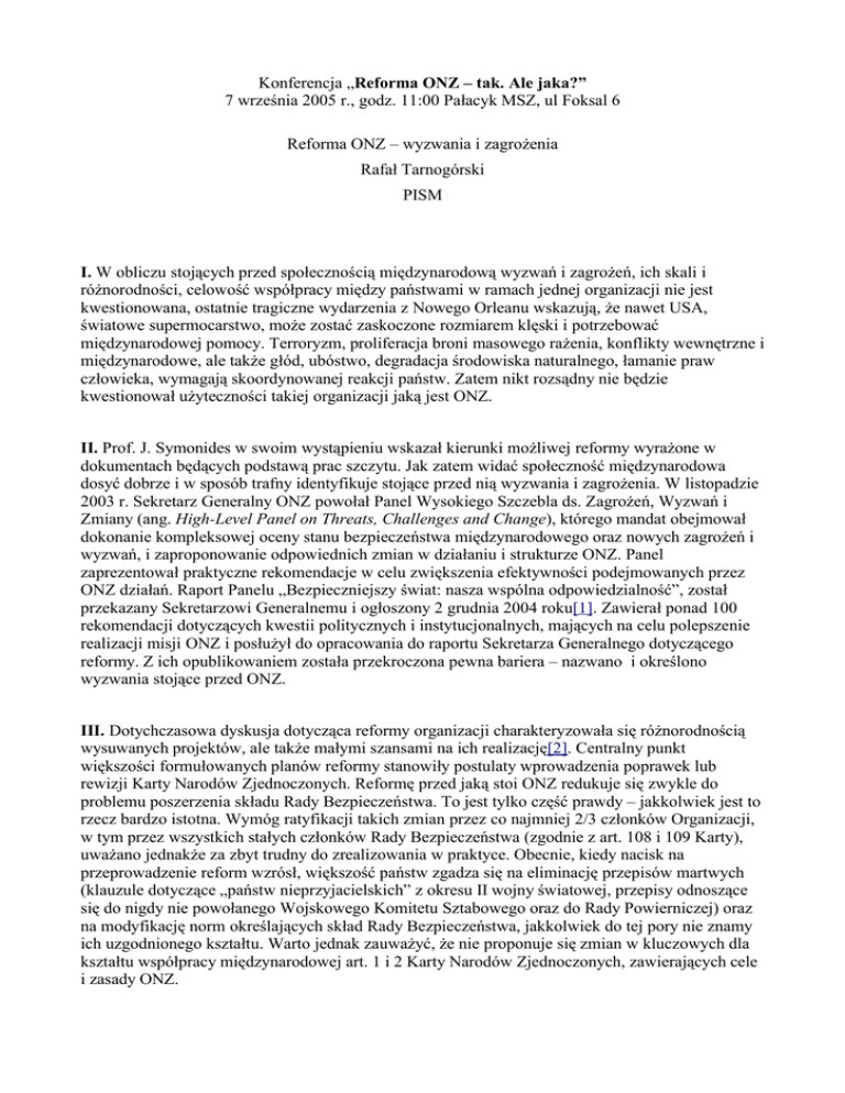 Konferencja „Reforma ONZ – tak. Ale jaka?” 7 września 2005 r., godz. 11:00 Pałacyk MSZ, ul Foksal 6 Reforma ONZ – wyzwania i zagrożenia Rafał Tarnogórski PISM I. W obliczu stojących przed społecznością międzynarodową wyzwań i zagrożeń, ich skali i różnorodności, celowość współpracy między państwami w ramach jednej organizacji nie jest kwestionowana, ostatnie tragiczne wydarzenia z Nowego Orleanu wskazują, że nawet USA, światowe supermocarstwo, może zostać zaskoczone rozmiarem klęski i potrzebować międzynarodowej pomocy. Terroryzm, proliferacja broni masowego rażenia, konflikty wewnętrzne i międzynarodowe, ale także głód, ubóstwo, degradacja środowiska naturalnego, łamanie praw człowieka, wymagają skoordynowanej reakcji państw. Zatem nikt rozsądny nie będzie kwestionował użyteczności takiej organizacji jaką jest ONZ. II. Prof. J. Symonides w swoim wystąpieniu wskazał kierunki możliwej reformy wyrażone w dokumentach będących podstawą prac szczytu. Jak zatem widać społeczność międzynarodowa dosyć dobrze i w sposób trafny identyfikuje stojące przed nią wyzwania i zagrożenia. W listopadzie 2003 r. Sekretarz Generalny ONZ powołał Panel Wysokiego Szczebla ds. Zagrożeń, Wyzwań i Zmiany (ang. High-Level Panel on Threats, Challenges and Change), którego mandat obejmował dokonanie kompleksowej oceny stanu bezpieczeństwa międzynarodowego oraz nowych zagrożeń i wyzwań, i zaproponowanie odpowiednich zmian w działaniu i strukturze ONZ. Panel zaprezentował praktyczne rekomendacje w celu zwiększenia efektywności podejmowanych przez ONZ działań. Raport Panelu „Bezpieczniejszy świat: nasza wspólna odpowiedzialność”, został przekazany Sekretarzowi Generalnemu i ogłoszony 2 grudnia 2004 roku[1]. Zawierał ponad 100 rekomendacji dotyczących kwestii politycznych i instytucjonalnych, mających na celu polepszenie realizacji misji ONZ i posłużył do opracowania do raportu Sekretarza Generalnego dotyczącego reformy. Z ich opublikowaniem została przekroczona pewna bariera – nazwano i określono wyzwania stojące przed ONZ. III. Dotychczasowa dyskusja dotycząca reformy organizacji charakteryzowała się różnorodnością wysuwanych projektów, ale także małymi szansami na ich realizację[2]. Centralny punkt większości formułowanych planów reformy stanowiły postulaty wprowadzenia poprawek lub rewizji Karty Narodów Zjednoczonych. Reformę przed jaką stoi ONZ redukuje się zwykle do problemu poszerzenia składu Rady Bezpieczeństwa. To jest tylko część prawdy – jakkolwiek jest to rzecz bardzo istotna. Wymóg ratyfikacji takich zmian przez co najmniej 2/3 członków Organizacji, w tym przez wszystkich stałych członków Rady Bezpieczeństwa (zgodnie z art. 108 i 109 Karty), uważano jednakże za zbyt trudny do zrealizowania w praktyce. Obecnie, kiedy nacisk na przeprowadzenie reform wzrósł, większość państw zgadza się na eliminację przepisów martwych (klauzule dotyczące „państw nieprzyjacielskich” z okresu II wojny światowej, przepisy odnoszące się do nigdy nie powołanego Wojskowego Komitetu Sztabowego oraz do Rady Powierniczej) oraz na modyfikację norm określających skład Rady Bezpieczeństwa, jakkolwiek do tej pory nie znamy ich uzgodnionego kształtu. Warto jednak zauważyć, że nie proponuje się zmian w kluczowych dla kształtu współpracy międzynarodowej art. 1 i 2 Karty Narodów Zjednoczonych, zawierających cele i zasady ONZ. IV. Ważnym aspektem powinno być uzgodnienie nowych zasad, na których powinno zostać oparte międzynarodowe współdziałanie. Punktem wyjścia jest tutaj Karta Narodów Zjednoczonych – zawierająca podstawowe reguły prawne określające kształt ładu międzynarodowego. Refleksja nad wiążącymi normami prawnymi umieszczonymi w Karcie Narodów Zjednoczonych musi stanowić podstawę dyskusji o reformie. Wartości, leżące u podstaw utworzenia Organizacji, i określone zgodnie z nimi cele i zasady, pozostają aktualne również w XXI wieku. Nie można ich zatem ignorować przy rozpatrywaniu przyszłego kształtu i roli ONZ[3]. V. Warto wspomnieć polską inicjatywę z 2002 r. dotycząca reformy ONZ. Przemawiając 15 września 2002 r. na 57. sesji Zgromadzenia Ogólnego ONZ, ówczesny minister spraw zagranicznych Włodzimierz Cimoszewicz zaproponował podjęcie działań w celu uchwalenia „Nowego Aktu Politycznego dla Narodów Zjednoczonych u progu XXI wieku” – politycznej deklaracji zawierającej współczesną interpretację wartości, celów i zasad umieszczonych w Karcie Narodów Zjednoczonych[4]. Nowa droga reformy miałaby polegać na dostosowaniu mandatu ONZ do nowych okoliczności i nowych wyzwań, bez zmiany brzmienia jej podstawowego aktu prawnego, jakim jest Karta Narodów Zjednoczonych. VI. Jakkolwiek obecna reforma, dokonywana niejako przy okazji jubileuszu jest wynikiem dłuższej refleksji nad kształtem organizacji, wydaje się, że niezwykle istotnym bodźcem była zmiana jaka dokonała się po zakończeniu zimnej wojny, zmiana obowiązującego dotąd paradygmatu międzynarodowego. Jeżeli przyjrzymy się propozycjom zmian dostrzeżemy pewne skoncentrowanie na kwestiach bezpieczeństwa, można zatem postawić tezę, że właśnie kwestie związane z nowymi rodzajami zagrożeń – terroryzmem stanowią jądro nowej reformy. Po pierwsze, jako zagadnienia należące do sfery bezpieczeństwa traktowane są również inne niż militarne aspekty stosunków międzynarodowych. Konieczne jest wypracowanie nowego porozumienia w dziedzinie bezpieczeństwa. Dla jednych państw priorytetem jest walka z terroryzmem lub zapobiegnie rozprzestrzeniania broni masowej zagłady, dla innych na pierwszy plan wysuwa się walka z głodem czy też kwestia dostępu do wody. Kolejną kwestią jest traktowanie jako zagadnień bezpieczeństwa międzynarodowego niektórych kwestii związanych z sytuacją jednostek wewnątrz państwa. Znacze