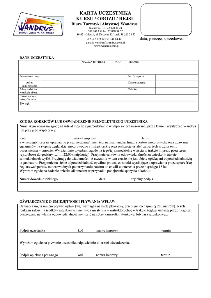 KARTA UCZESTNIKA KURSU / OBOZU / REJSU Biura Turystyki Aktywnej Wandrus Warszawa, tel. 22 828 34 24 502 647 139 fax. 22 828 34 52 80-431 Gdańsk, ul. Kubacza 12/1, tel. 58 520 28 52 data, pieczęć, sprzedawca 502 647 139, fax 58 344 84 44 e-mail: [email protected] www.wandrus.com.pl DANE UCZESTNIKA NAZWA IMPREZY KOD TERMIN Nazwisko i imię Nr. Paszportu Adres zamieszkania Adres rodziców w trakcie obozu Nazwa i adres szkoły/ uczelni Data urodzenia Telefon Uwagi: ZGODA RODZICÓW LUB OŚWIADCZENIE PEŁNOLETNIEGO UCZESTNIKA Niniejszym wyrażam zgodę na udział mojego syna/córki/mnie w imprezie organizowanej przez Biuro Turystyczne Wandrus lub przy jego współpracy. Kod nazwa imprezy termin a w szczególności na uprawianie przez niego/nią/mnie: żeglarstwa, windsurfingu, sportów motorowych, oraz zdawanie egzaminów na stopnie żeglarskie, motorowodne i instruktorskie oraz realizację ustaleń zawartych w zgłoszeniu uczestnictwa – umowie. Wyrażam/nie wyrażam, zgodę na jego/jej samodzielne wyjścia w trakcie imprezy poza teren rejsu/obozu do godziny …….. 22:00 (najpóźniej). Przejmuję całkowitą odpowiedzialność za dziecko w trakcie samodzielnych wyjść. Przyjmuję do wiadomości, iż uczestnik w tym czasie nie jest objęty opieką ani odpowiedzialnością organizatora. Przyjmuję na siebie odpowiedzialność cywilno-prawną za skutki wynikające z uprawiania przez syna/córkę żeglarstwa/sportów motorowodnych po otrzymaniu patentu do chwili ukończenia przez nią/niego 18 lat. Wyrażam zgodę na badanie dziecka alkomatem w przypadku podejrzenia spożycia alkoholu. Numer dowodu osobistego data czytelny podpis OŚWIADCZENIE O UMIEJĘTNOŚCI PŁYWANIA WPŁAW Oświadczam, iż umiem pływać wpław (wg. wymagań na kartę pływacką, przepłynę co najmniej 200 metrów). Jeżeli rozkazu założenia środków ratunkowych nie wyda mi sternik – instruktor, chcę w trakcie żeglugi uznanej przez niego za bezpieczną, na własną odpowiedzialność nie nosić na sobie kamizelki ratunkowej lub pasa ratunkowego. Podpis uczestnika kod nazwa imprezy termin Wyrażam zgodę na pływanie uczestnika odpowiednio do treści oświadczenia. Podpis opiekuna prawnego kod nazwa imprezy termin INFORMACJA O ZDROWIU UCZESTNIKA Informacja rodziców (np. na co jest uczulony, jak znosi jazdę samochodem, czy przyjmuje stale leki i w jakich dawkach, czy nosi aparat ortodontyczny lub okulary). ………………………………………………………………………………………………………………………………… ………………………………………………………………………………………………………………………………… Stwierdzam, iż podałem (am) wszystkie znane mi informacje, które mogą pomóc w zapewnieniu jemu/jej/mnie opieki. Data i czytelny podpis opiekuna prawnego / pełnoletniego uczestnika Informacja pielęgniarki szkolnej / lekarza szkolnego o stanie zdrowia i szczepieniach ………………………………………………………………………………………………………………………………… ………………………………………………………………………………………………………………………………… ZAŚWIADCZENIE LEKARSKIE Po zbadaniu __________________________________________________ *niepotrzebne skreślić jako kandydata/tki na obóz (imprezę żeglarską) i zapoznaniu się z informacjami opiekunów o jego/jej stanie zdrowia stwierdzam brak przeciwwskazań do*: - uprawiania żeglarstwa na śródlądziu i morzu, - uprawiania jachtingu motorowodnego, windsurfingu, kajakarstwa, - jazdy na nartach wodnych, wakeboardzie, na spadochronie za motorówką, jazdy autokarem, - wspinaczki skałkowej uczestnictwa w uprawianiu sportów zimowych: - jazdy na nartach i snowboardzie, - jazdy na skuterach śnieżnych - jazdy na bojerach i icesurfingu, uczestnictwa w innych imprezach, zgodnie z ich profilem i programem ……………………………………………………… …………………………………………………………………………………………………………………………………... miejscowość, data, pieczęć i podpis LEKARZA Uzupełnioną Kartę Uczestnika należy zabrać na obóz/rejs/kurs prosimy nie odsyłać Karty Uczestnika do biura Uczestnik korzystający z Dojazdu Zorganizowanego musi posiadać przy sobie aktualną, czytelną legitymację szkolną lub studencką