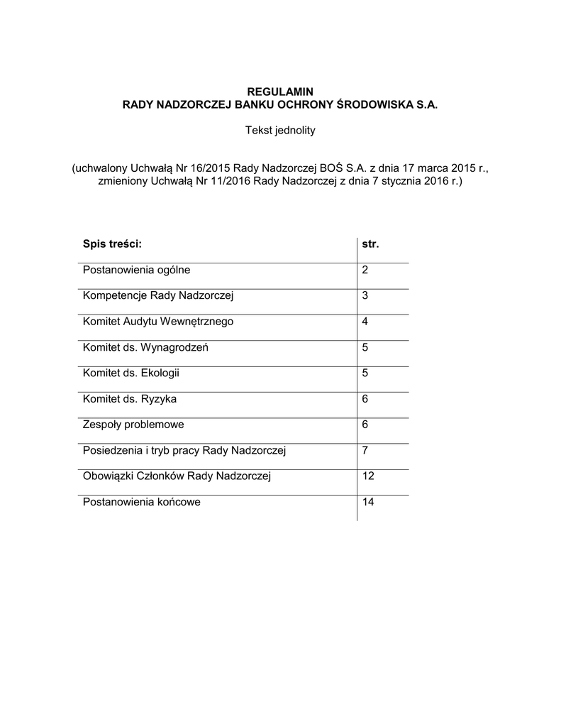 REGULAMIN RADY NADZORCZEJ BANKU OCHRONY ŚRODOWISKA S.A. Tekst jednolity (uchwalony Uchwałą Nr 16/2015 Rady Nadzorczej BOŚ S.A. z dnia 17 marca 2015 r., zmieniony Uchwałą Nr 11/2016 Rady Nadzorczej z dnia 7 stycznia 2016 r.) Spis treści: str. Postanowienia ogólne 2 Kompetencje Rady Nadzorczej 3 Komitet Audytu Wewnętrznego 4 Komitet ds. Wynagrodzeń 5 Komitet ds. Ekologii 5 Komitet ds. Ryzyka 6 Zespoły problemowe 6 Posiedzenia i tryb pracy Rady Nadzorczej 7 Obowiązki Członków Rady Nadzorczej 12 Postanowienia końcowe 14 Postanowienia ogólne §1 Użyte w niniejszym Regulaminie określenia oznaczają: 1) 2) 3) 4) 5) 6) Bank, BOŚ S.A. – Bank Ochrony Środowiska S.A., komórka audytu wewnętrznego – wydzielony w strukturze organizacyjnej Centrali departament dokonujący audytów wewnętrznych, organizacyjnie podlegający Prezesowi Zarządu; merytoryczny nadzór nad działalnością tej komórki sprawuje Komitet Audytu, Rada, Rada Nadzorcza – Rada Nadzorcza Banku Ochrony Środowiska S.A., Regulamin – Regulamin Rady Nadzorczej Banku Ochrony Środowiska S.A., Transakcja własna – transakcja, której przedmiotem są instrumenty finansowe1, zawierana przez członka Rady lub na jego rachunek, pod warunkiem, że: a) zawarcie tej transakcji wykracza poza zakres obowiązków służbowych członka Rady, albo b) transakcja zawierana jest na rachunek członka Rady lub: małżonka członka Rady, krewnego członka Rady do trzeciego stopnia, osoby związanej z członkiem Rady z tytułu przysposobienia, opieki lub kurateli, powinowatego członka Rady do drugiego stopnia, osoby pozostającej z członkiem Rady we wspólnym gospodarstwie domowym przez okres co najmniej roku przed datą zawarcia transakcji, innej osoby pozostającej z członkiem Rady w stosunkach powodujących, że członek Rady ma istotny interes w zawarciu danej transakcji na rzecz tej innej osoby, z wyłączeniem normalnych opłat i prowizji należnych z tytułu zawarcia transakcji, zwykła większość głosów – sytuacja, gdy w głosowaniu liczba głosów „za” jest większa niż liczba głosów „przeciw” (głosy wstrzymujące się i nieważne nie są brane pod uwagę). §2 1. Regulamin określa organizację oraz sposób wykonywania czynności przez Radę Nadzorczą, w zakresie nie uregulowanym w Statucie Banku i w przepisach prawa. 2. W okresach pomiędzy posiedzeniami, Radę Nadzorczą reprezentuje przewodniczący, a w razie jego dłuższej nieobecności uprawnienia te wykonuje wiceprzewodniczący. Instrumenty finansowe – instrumenty, o których mowa w art. 2 Ustawy z dnia 29 lipca 2005r. o obrocie instrumentami finansowymi (Dz. U. z 2010 r., Nr 211, poz.1384 – tekst jednolity, ze zm.), będące przedmiotem działalności Banku, obejmujące w szczególności: 1) papiery wartościowe emitowane przez Skarb Państwa lub Narodowy Bank Polski, 2) papiery wartościowe emitowane przez: a) Bank, b) spółki, w których Bank jest zaangażowany kapitałowo, c) innych emitentów, z którymi Bank współpracuje, 3) niedopuszczone do obrotu zorganizowanego papiery wartościowe, w tym: a) akcje i inne udziałowe papiery wartościowe, b) dłużne papiery wartościowe, 4) niedopuszczone do obrotu zorganizowanego instrumenty niebędące papierami wartościowymi, w tym: a) tytuły uczestnictwa w funduszach inwestycyjnych, b) instrumenty terminowe i pochodne, c) strukturyzowane produkty depozytowe. 1 2 §3 1. W przypadku odwołania, rezygnacji lub śmierci członka Rady Nadzorczej w trakcie trwania kadencji, do czasu obsadzenia wakatu, Rada może działać w zmniejszonym składzie, lecz nie mniejszym niż 5 osób. 2. W przypadku wygaśnięcia mandatu przewodniczącego, wiceprzewodniczącego lub sekretarza Rady Nadzorczej, Rada – na najbliższym posiedzeniu – dokonuje odpowiedniego wyboru, w celu obsadzenia wakatu. Kompetencje Rady Nadzorczej §4 1. Kompetencje Rady Nadzorczej określają w szczególności: Ustawa Prawo bankowe, Ustawa Kodeks spółek handlowych, Ustawa o rachunkowości, uchwały Komisji Nadzoru Finansowego, Statut Banku, a także inne przepisy wewnętrzne i zewnętrzne regulujące działalność Banku. 2. Z zastrzeżeniem ust. 1, do kompetencji Rady Nadzorczej należy w szczególności: 1) nawiązywanie stosunku pracy z członkami Zarządu poprzez zawieranie stosownych umów. Rada Nadzorcza może upoważnić przewodniczącego Rady do zawierania takich umów – na warunkach przyjętych każdorazowo przez Radę, 2) sporządzanie corocznego sprawozdania z działalności Rady, wraz ze zwięzłą oceną sytuacji Banku (z uwzględnieniem oceny systemu kontroli wewnętrznej oraz systemu zarządzania ryzykiem istotnym dla Banku) - w celu przedłożenia Walnemu Zgromadzeniu do zatwierdzenia, 3) rozpatrywanie i ocena otrzymywanych od Zarządu informacji o wszystkich istotnych sprawach dotyczących działalności Banku, 4) sprawowanie nadzoru nad funkcjonowaniem w Banku systemu kontroli wewnętrznej i systemu zarządzania ryzykiem oraz nad przebiegiem procesu sprawozdawczości finansowej, w tym m.in.: a) powoływanie Komitetu Audytu Wewnętrznego, uchwalanie regulaminu określającego organizację i zadania tego Komitetu oraz ustalanie jego składu, b) zatwierdzanie przepisów wewnętrznych Banku, dotyczących w szczególności: - działania systemu kontroli wewnętrznej w Banku, - działania systemu zarządzania ryzykiem w Banku, - zarządzania poszczególnymi rodzajami ryzyka bankowego, c) rozpatrywanie i ocena okresowych raportów przeprowadzonych audytów wewnętrznych, prezentujących wyniki d) rozpatrywanie i ocena okresowych informacji o skuteczności systemu kontroli wewnętrznej, 3 e) rozpatrywanie i ocena okresowych raportów o ryzyku związanym z prowadzoną działalnością oraz o sposobach zarządzania tym ryzykiem, f) rozpatrywanie i ocena rocznych sprawozdań Zarządu z działalności Banku i jego grupy kapitałowej, g) rozpatrywanie i ocena rocznych sprawozdań finansowych Banku i jego grupy ka