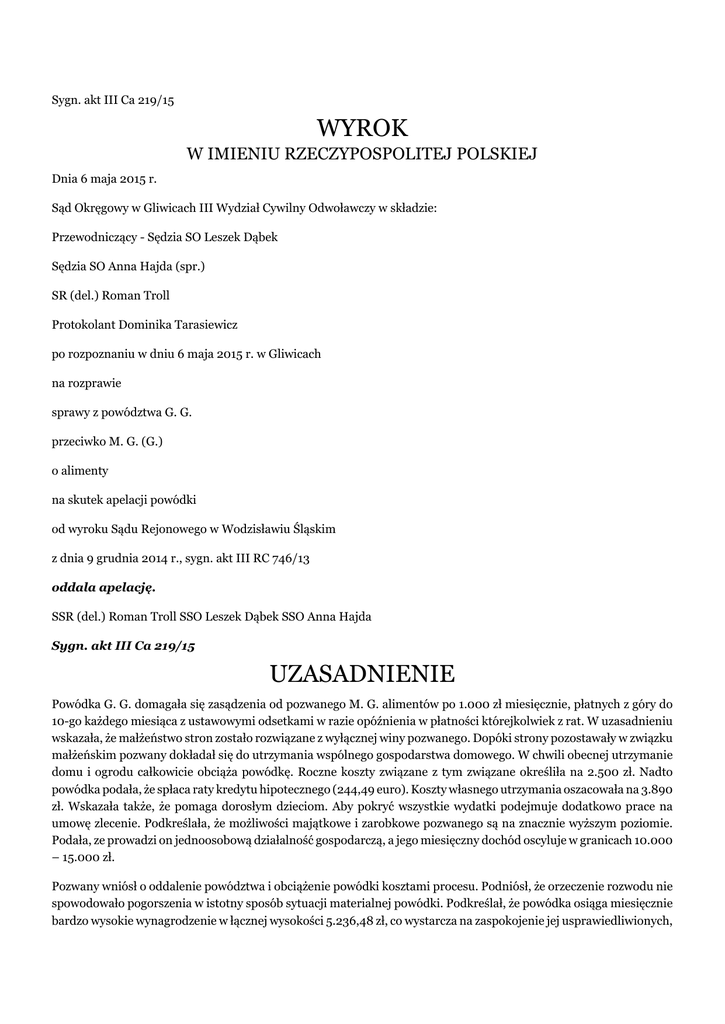 Sygn. akt III Ca 219/15 WYROK W IMIENIU RZECZYPOSPOLITEJ POLSKIEJ Dnia 6 maja 2015 r. Sąd Okręgowy w Gliwicach III Wydział Cywilny Odwoławczy w składzie: Przewodniczący - Sędzia SO Leszek Dąbek Sędzia SO Anna Hajda (spr.) SR (del.) Roman Troll Protokolant Dominika Tarasiewicz po rozpoznaniu w dniu 6 maja 2015 r. w Gliwicach na rozprawie sprawy z powództwa G. G. przeciwko M. G. (G.) o alimenty na skutek apelacji powódki od wyroku Sądu Rejonowego w Wodzisławiu Śląskim z dnia 9 grudnia 2014 r., sygn. akt III RC 746/13 oddala apelację. SSR (del.) Roman Troll SSO Leszek Dąbek SSO Anna Hajda Sygn. akt III Ca 219/15 UZASADNIENIE Powódka G. G. domagała się zasądzenia od pozwanego M. G. alimentów po 1.000 zł miesięcznie, płatnych z góry do 10-go każdego miesiąca z ustawowymi odsetkami w razie opóźnienia w płatności którejkolwiek z rat. W uzasadnieniu wskazała, że małżeństwo stron zostało rozwiązane z wyłącznej winy pozwanego. Dopóki strony pozostawały w związku małżeńskim pozwany dokładał się do utrzymania wspólnego gospodarstwa domowego. W chwili obecnej utrzymanie domu i ogrodu całkowicie obciąża powódkę. Roczne koszty związane z tym związane określiła na 2.500 zł. Nadto powódka podała, że spłaca raty kredytu hipotecznego (244,49 euro). Koszty własnego utrzymania oszacowała na 3.890 zł. Wskazała także, że pomaga dorosłym dzieciom. Aby pokryć wszystkie wydatki podejmuje dodatkowo prace na umowę zlecenie. Podkreślała, że możliwości majątkowe i zarobkowe pozwanego są na znacznie wyższym poziomie. Podała, ze prowadzi on jednoosobową działalność gospodarczą, a jego miesięczny dochód oscyluje w granicach 10.000 – 15.000 zł. Pozwany wniósł o oddalenie powództwa i obciążenie powódki kosztami procesu. Podniósł, że orzeczenie rozwodu nie spowodowało pogorszenia w istotny sposób sytuacji materialnej powódki. Podkreślał, że powódka osiąga miesięcznie bardzo wysokie wynagrodzenie w łącznej wysokości 5.236,48 zł, co wystarcza na zaspokojenie jej usprawiedliwionych, bieżących potrzeb, a także na utrzymanie domu oraz pomoc dzieciom. Przyznał, ze prowadzi działalność gospodarczą ale wskazał także, ze aktualnie przynosi ona straty. Wskazał, że spłaca raty 3 kredytów obrotowych w łącznej miesięcznej wysokości 4.745 zł. Zaskarżonym wyrokiem Sąd Rejonowy oddalił powództwo. Kosztami postępowania obciążył Skarb Państwa, a koszty zastępstwa procesowego wzajemnie między stronami zniósł. Orzeczenie to zapadło przy ustaleniu, że wyrokiem z 18 grudnia 2012r. w sprawie II RC 1258/11 Sąd Okręgowy w Gliwicach rozwiązał przez rozwód małżeństwo stron z winy pozwanego. Z małżeństwa stron pochodzi dwójka dzieci, które od kilku lat przebywają w Austrii. Do czasu rozwodu strony korzystały z domu w C., na budowę którego zaciągnęły kredyt hipoteczny, który obecnie spłaca zajmująca go powódka. Miesięczna rata wynosi około 1.300 zł. Miesięczne koszty utrzymania domu zamykają się w kwocie 1.185,50 zł. Do końca 2013 roku pozwany opłacał koszty związane z energią elektryczną, a do wrześnie 2013r. płacił za gaz. Pozwany ponosił opłacał także rachunki za wodę i wywóz nieczystości. Obecnie wszystkie te opłaty obciążają powódkę. Między stronami nie toczyło się postępowanie o podział majątku wspólnego. Sąd ustalił nadto, że dzieci stron od 2007r. mieszkały z ojcem w W. i pozostawały na jego utrzymaniu do 2012r., kiedy zamieszkały osobno. Syn byłych małżonków jest już samodzielny. Córka wciąż się uczy. Pozwany łozy na jej rzecz 850 zł alimentów. Powódka także wspiera ją finansowo w miarę możliwości. Do 2007 roku powódka prowadziła działalność gospodarczą w postaci apteki. W dniu 14 listopada 2006r. zaciągnęła kredyt obrotowy w kwocie 35.000 zł, który spłaciła 13 października 2014r. Powódka była zadłużona z tytułu prowadzonej działalności gospodarczej na kwotę 28.293,19 zł. Całość zobowiązania uregulowała. Począwszy od maja 2009r. pracuje w Aptece (...) na stanowisku kierownika apteki za średnim wynagrodzeniem 4.424,94 zł. Dodatkowo od 15 kwietnia 2013r. świadczy pracę na podstawie umowy zlecenia na rzecz apteki (...) pracując tam dwa weekendy miesięcznie w soboty po 12 godzin, a w niedzielę po 10 godzin. Z tego tytułu otrzymuje wynagrodzenie średnio 1.083,33 zł miesięcznie. Powódka często świadczy pracę także w godzinach nadliczbowych. Sąd ustalił, że pozwany prowadził własną działalność gospodarczą. W 2012r. wykazał Sygn. akt III Ca 219/15 przychód w wysokości 104.090,23 zł oraz stratę w kwocie 53.152,41 zł. W kolejnym roku przychód wyniósł 79.105,01 zł, a strata 13.640,66 zł. Z kolei w okresie od stycznia do maja 2014r. pozwany wykazał stratę w wysokości 7.517,49 zł. Począwszy od września 2004r. pozwany prowadził działalność gospodarczą o tym samym profilu na terenie Austrii. W 2007r. pozwany zaciągnął kredyt obrotowy na kwotę 55.000 zł. Okres kredytowania ustalono na 120 miesięcy. W dniu 30 maja 2014r. pozwany zawiesił działalność gospodarczą w Polsce. Od marca tego samego roku nie prowadził również placówki w W.. Aktualnie nie pracuje. Sąd ustalił ponadto, że po rozwodzie pozwany zamieszkał w mieszkaniu należącym do siostry. Ponosi jedynie wydatki związane z regulowaniem opłat za lokal w wysokości 215-225 zł miesięcznie. Oprócz tego spłaca raty trzech kredytów na łączna kwotę 6.526 zł miesięcznie. Utrzymuje się z pomocy rodziny – głównie siostry. Wskazując na treść art. 60 § 2 kro Sąd uznał, że na skutek rozwodu nie nastąpiło pogorszenie sytuacji materialnej powódki. Podkreślając okoliczność, że powódka osiąga stały dochód na poziomie porównywalnym z okresem małżeństwa a nadto podjęła prace na zlecenie Sąd uznał, że nałożenie na pozwanego, który w znacznym stopniu u