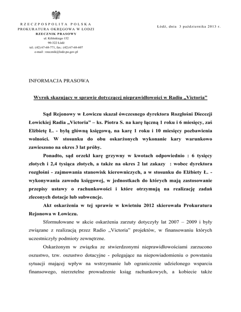 RZECZPOSPOLITA POLSKA PROKURATURA OKRĘGOWA W ŁODZI Ł ó d ź , d n i a 3 p a ź d z i e r n i ka 2 0 1 3 r . RZE CZNIK P RASOWY ul. Kilińskiego 152 90-322 Łódź tel.: (42) 67-68-771, fax.: (42) 67-68-607 e-mail : [email protected] INFORMACJA PRASOWA Wyrok skazujący w sprawie dotyczącej nieprawidłowości w Radiu „Victoria” Sąd Rejonowy w Łowiczu skazał ówczesnego dyrektora Rozgłośni Diecezji Łowickiej Radia „Victoria” – ks. Piotra S. na karę łączną 1 roku i 6 miesięcy, zaś Elżbietę Ł. - byłą główną księgową, na karę 1 roku i 10 miesięcy pozbawienia wolności. W stosunku do obu oskarżonych wykonanie kary warunkowo zawieszono na okres 3 lat próby. Ponadto, sąd orzekł karę grzywny w kwotach odpowiednio : 6 tysięcy złotych i 2,4 tysiąca złotych, a także na okres 2 lat zakazy : wobec dyrektora rozgłośni - zajmowania stanowisk kierowniczych, a w stosunku do Elżbiety Ł. wykonywania zawodu księgowej, w jednostkach do których mają zastosowanie przepisy ustawy o rachunkowości i które otrzymują na realizację zadań zleconych dotacje lub subwencje. Akt oskarżenia w tej sprawie w kwietniu 2012 skierowała Prokuratura Rejonowa w Łowiczu. Sformułowane w akcie oskarżenia zarzuty dotyczyły lat 2007 – 2009 i były związane z realizacją przez Radio „Victoria” projektów, w finansowaniu których uczestniczyły podmioty zewnętrzne. Oskarżonym w związku ze stwierdzonymi nieprawidłowościami zarzucono oszustwo, tzw. oszustwo dotacyjne - polegające na niepowiadomieniu o powstaniu sytuacji mającej wpływ na wstrzymanie lub ograniczenie udzielonego wsparcia finansowego, nierzetelne prowadzenie ksiąg rachunkowych, a kobiecie także 2 podrabianie różnego rodzaju, ponad 120 dokumentów, m. in. listy płac, rachunków, zakresów obowiązków, kart pracy i umów. Ujęte w akcie oskarżenia zarzuty łączyły się z realizacją projektu pod nazwą „Księstwo Łowickie – perła w koronie”, dotowanego przesz Narodowe Centrum Kultury w Warszawie, który miał służyć promocji regionu, a także z programem „Praca dla każdego”, finansowanym przez Wojewódzki Urząd Pracy w Łodzi, mającym na celu aktywizacją osób bezrobotnych na terenach wiejskich. Kolejny ujęty w akcie oskarżenia program pod nazwą „Na prowincji – jak korzystać z funduszy europejskich”, zakładał wykorzystanie funduszy unijnych i obejmował m. in. przygotowanie strony internetowej, produkcję i emisję audycji, konkursów oraz imprezy promocyjnej. Ministerstwo Rozwoju Regionalnego przyznało na ten projekt ponad 480 tysięcy złotych dotacji. W śledztwie stwierdzono także nieprawidłowości związane projektem „Kuba pytalski – młodzieżowy serwis ekologiczny”, realizowanym przy zaangażowaniu WFOŚ i GW w Warszawie. W wyroku sąd uznał oskarżonych winnymi przestępstw oszustwa dotacyjnego i nierzetelnego prowadzenia ksiąg rachunkowych, a byłą księgową fałszowania dokumentów. Orzeczenie w tej sprawie jest nieprawomocne. Po uzyskaniu uzasadnienia na piśmie prokuratura podejmie decyzję co do ewentualnej apelacji. Rzecznik Prasowy Prokuratury Okręgowej w Łodzi Krzysztof Kopania