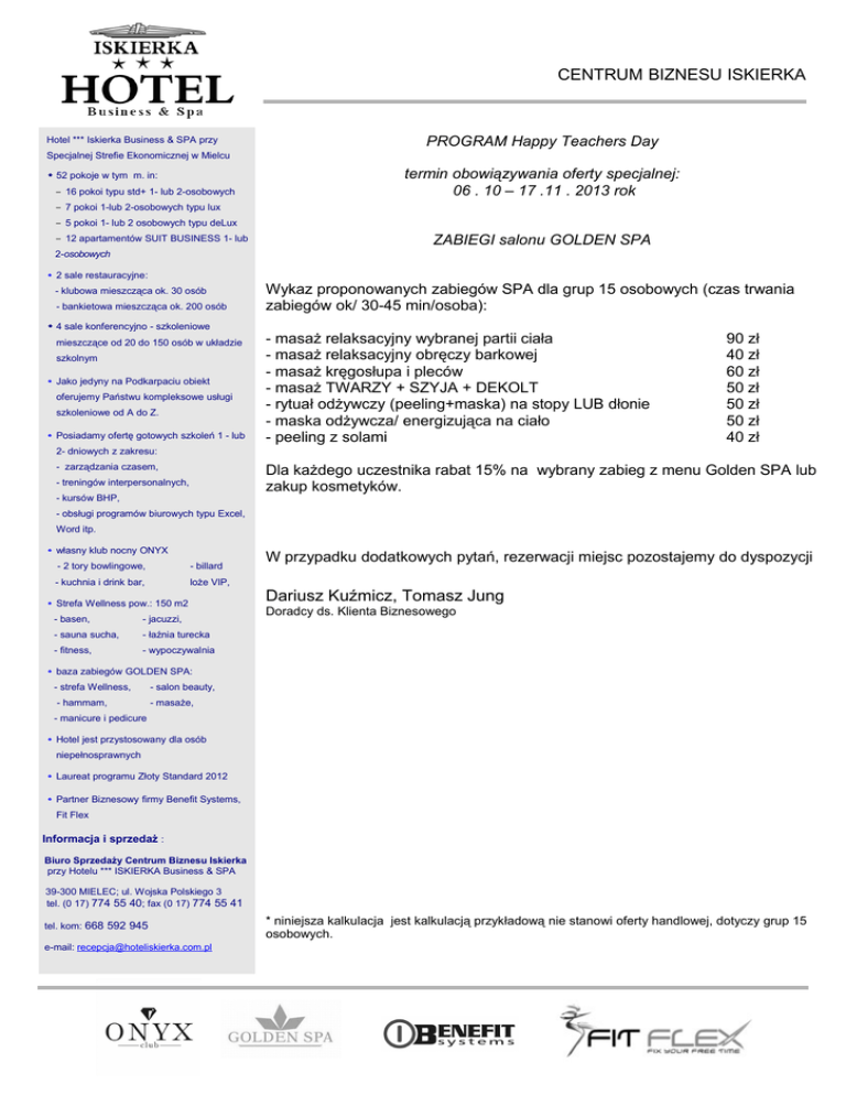 CENTRUM BIZNESU ISKIERKA Hotel *** Iskierka Business & SPA przy PROGRAM Happy Teachers Day Specjalnej Strefie Ekonomicznej w Mielcu 52 pokoje w tym m. in: − 16 pokoi typu std+ 1- lub 2-osobowych termin obowiązywania oferty specjalnej: 06 . 10 – 17 .11 . 2013 rok − 7 pokoi 1-lub 2-osobowych typu lux − 5 pokoi 1- lub 2 osobowych typu deLux − 12 apartamentów SUIT BUSINESS 1- lub ZABIEGI salonu GOLDEN SPA 2-osobowych 2 sale restauracyjne: - klubowa mieszcząca ok. 30 osób - bankietowa mieszcząca ok. 200 osób 4 sale konferencyjno - szkoleniowe mieszczące od 20 do 150 osób w układzie szkolnym Jako jedyny na Podkarpaciu obiekt oferujemy Państwu kompleksowe usługi szkoleniowe od A do Z. Posiadamy ofertę gotowych szkoleń 1 - lub Wykaz proponowanych zabiegów SPA dla grup 15 osobowych (czas trwania zabiegów ok/ 30-45 min/osoba): - masaż relaksacyjny wybranej partii ciała - masaż relaksacyjny obręczy barkowej - masaż kręgosłupa i pleców - masaż TWARZY + SZYJA + DEKOLT - rytuał odżywczy (peeling+maska) na stopy LUB dłonie - maska odżywcza/ energizująca na ciało - peeling z solami 90 zł 40 zł 60 zł 50 zł 50 zł 50 zł 40 zł 2- dniowych z zakresu: - zarządzania czasem, Dla każdego uczestnika rabat 15% na wybrany zabieg z menu Golden SPA lub zakup kosmetyków. - treningów interpersonalnych, - kursów BHP, - obsługi programów biurowych typu Excel, Word itp. własny klub nocny ONYX - 2 tory bowlingowe, - billard - kuchnia i drink bar, loże VIP, Strefa Wellness pow.: 150 m2 - basen, - jacuzzi, - sauna sucha, - łaźnia turecka - fitness, - wypoczywalnia W przypadku dodatkowych pytań, rezerwacji miejsc pozostajemy do dyspozycji Dariusz Kuźmicz, Tomasz Jung Doradcy ds. Klienta Biznesowego baza zabiegów GOLDEN SPA: - strefa Wellness, - salon beauty, - hammam, - masaże, - manicure i pedicure Hotel jest przystosowany dla osób niepełnosprawnych Laureat programu Złoty Standard 2012 Partner Biznesowy firmy Benefit Systems, Fit Flex Informacja i sprzedaż : Biuro Sprzedaży Centrum Biznesu Iskierka przy Hotelu *** ISKIERKA Business & SPA 39-300 MIELEC; ul. Wojska Polskiego 3 tel. (0 17) 774 55 40; fax (0 17) 774 55 41 tel. kom: 668 592 945 e-mail: [email protected] * niniejsza kalkulacja jest kalkulacją przykładową nie stanowi oferty handlowej, dotyczy grup 15 osobowych.