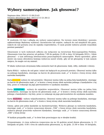Wybory samorządowe. Jak głosować? Napisano dnia: 2014-11-13 09:25:43 Ostatnia aktualizacja dnia: 2015-12-13 21:38:12 W niedzielę (16 bm.) odbędą się wybory samorządowe. Na terenie ziemi kłodzkiej i powiatu ząbkowickiego Będziemy wybierać: burmistrzów lub wójtów, radnych do rad miejskich lub gmin, radych do rad powiatu oraz do sejmiku województwa. O czym przede wyborcy przede wszystkim powinni pamiętać? Głosowanie w tych wyborach odbywa się wyłącznie na terytorium Rzeczypospolitej Polskiej. Głosowanie trwa bez przerwy od godziny 7:00 do godziny 21:00 w dniu 16 listopada 2014 r. Gdzie głosować – o tym informują obwieszczenia poszczególnych samorządów. Warto sprawdzić, gdzie mieści się nasza obwodowa komisja wyborcza nawet wtedy, gdy od lat głosujemy w tym samym miejscu, bo mogło coś się zmienić. W lokalu wyborczym otrzymamy kilka zestawów kart do głosowania: biały, żółty, niebieski i różowy. Karta BIAŁA – wybory do rad gmin i miast nie będących na prawach powiatu. Głosować można tylko na jednego kandydata, stawiając na karcie do głosowania znak „x” w kratce z lewej strony obok nazwiska kandydata Karta ŻÓŁTA – wybory do rad powiatów. Głosować można tylko na jedną listę kandydatów, stawiając na karcie do głosowania znak „x” w kratce z lewej strony obok nazwiska jednego z kandydatów z tej listy, przez co wskazuje się jego pierwszeństwo w uzyskaniu mandatu. Karta NIEBIESKA - wybory do sejmików województw. Głosować można tylko na jedną listę kandydatów, stawiając na karcie do głosowania znak „x” w kratce z lewej strony obok nazwiska jednego z kandydatów z tej listy, przez co wskazuje się jego pierwszeństwo do uzyskania mandatu. Karta RÓŻOWA – wybory wójta/burmistrza. Głosować można tylko na jednego kandydata, stawiając na karcie do głosowania znak „x” w kratce z lewej strony obok nazwiska kandydata. Gminy, gdzie jest jeden kandydat na burmistrza/wójta. Wyborca głosuje za wyborem kandydata, stawiając znak „x” w kratce oznaczonej słowem „TAK” z lewej strony obok nazwiska kandydata; wyborca głosuje przeciwko wyborowi kandydata, stawiając znak „x” w kratce oznaczonej słowem „NIE” z lewej strony W każdym przypadku znak „x” to dwie linie przecinające się w obrębie kratki). Przypominamy, iż cisza wyborcza rozpoczyna się na 24 godziny przed dniem głosowania, tj. 15 listopada od godz. 0.00 i trwa do zakończenia głosowania, tj. do godz. 21.00 w dniu 16 listopada, jeżeli żadna z obwodowych komisji wyborczych, w wyniku nadzwyczajnych wydarzeń, nie podejmie uchwały o przedłużeniu głosowania. Naruszenie zakazu prowadzenia agitacji wyborczej w okresie ciszy wyborczej stanowi wykroczenie, a naruszenie zakazu podawania do publicznej wiadomości wyników sondaży zachowań wyborczych i przewidywanych wyników wyborów — występek. Zatem ocena czy w konkretnym przypadku doszło do naruszenia tego zakazu nie będzie należała do Państwowej Komisji Wyborczej, lecz do organów ścigania i sądów. Źródła: informacji: pkw.gov.pl, grafika: mmwarszawa.pl