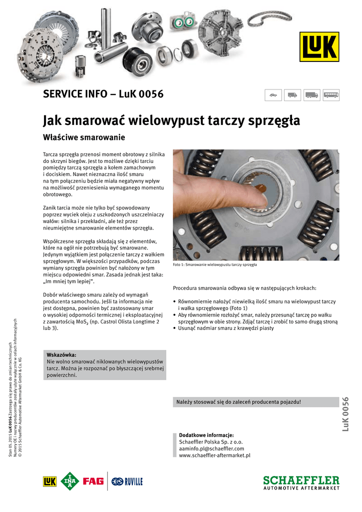 SERVICE INFO – LuK 0056 Jak smarować wielowypust tarczy sprzęgła Właściwe smarowanie Tarcza sprzęgła przenosi moment obrotowy z silnika do skrzyni biegów. Jest to możliwe dzięki tarciu pomiędzy tarczą sprzęgła a kołem zamachowym i dociskiem. Nawet nieznaczna ilość smaru na tym połączeniu będzie miała negatywny wpływ na możliwość przeniesienia wymaganego momentu obrotowego. Zanik tarcia może nie tylko być spowodowany poprzez wyciek oleju z uszkodzonych uszczelniaczy wałów: silnika i przekładni, ale też przez nieumiejętne smarowanie elementów sprzęgła. Dobór właściwego smaru zależy od wymagań producenta samochodu. Jeśli ta informacja nie jest dostępna, powinien być zastosowany smar o wysokiej odporności termicznej i eksploatacyjnej z zawartością MoS₂ (np. Castrol Olista Longtime 2 lub 3). Foto 1: Smarowanie wielowypustu tarczy sprzęgła Procedura smarowania odbywa się w następujących krokach: • Równomiernie nałożyć niewielką ilość smaru na wielowypust tarczy i wałka sprzęgłowego (Foto 1) • Aby równomiernie rozłożyć smar, należy przesunąć tarczę po wałku sprzęgłowym w obie strony. Zdjąć tarczę i zrobić to samo drugą stroną • Usunąć nadmiar smaru z krawędzi piasty Wskazówka: Nie wolno smarować niklowanych wielowypustów tarcz. Można je rozpoznać po błyszczącej srebrnej powierzchni. Należy stosować się do zaleceń producenta pojazdu! Dodatkowe informacje: Schaeffler Polska Sp. z o.o. [email protected] www.schaeffler-aftermarket.pl LuK 0056 Stan 05.2015 LuK 0056 Zastrzega się prawo do zmian technicznych Numery OE i nazwy producentów zostały użyte wyłącznie w celach informacyjnych © 2015 Schaeffler Automotive Aftermarket GmbH & Co. KG Współczesne sprzęgła składają się z elementów, które na ogół nie potrzebują być smarowane. Jedynym wyjątkiem jest połączenie tarczy z wałkiem sprzęgłowym. W większości przypadków, podczas wymiany sprzęgła powinien być nałożony w tym miejscu odpowiedni smar. Zasada jednak jest taka: „Im mniej tym lepiej”.