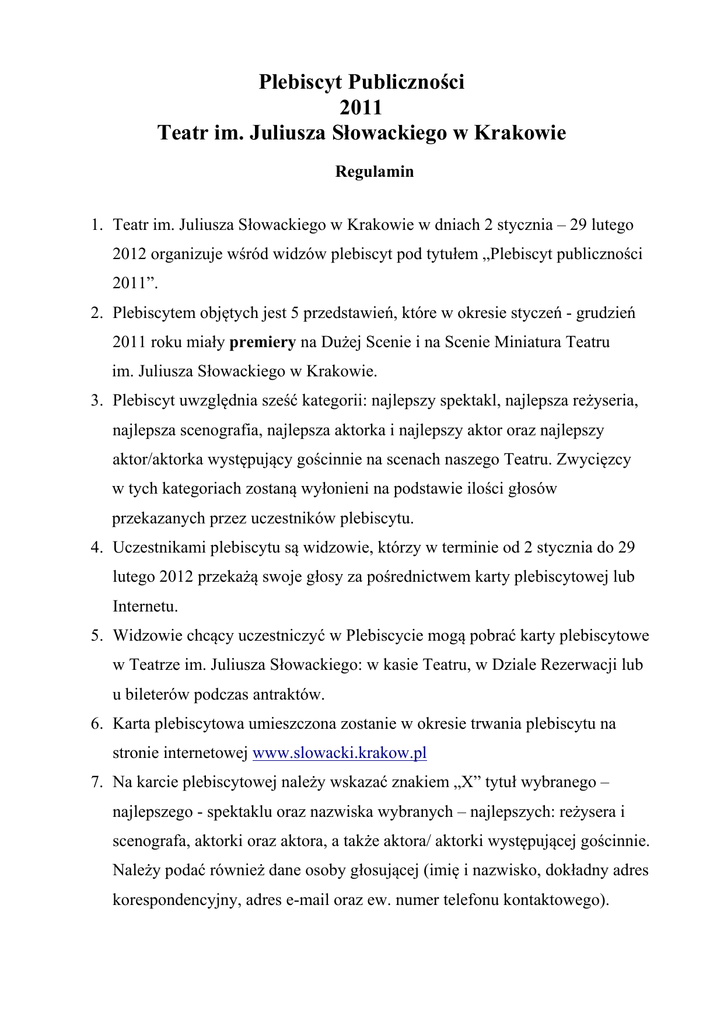 Plebiscyt Publiczności 2011 Teatr im. Juliusza Słowackiego w Krakowie Regulamin 1. Teatr im. Juliusza Słowackiego w Krakowie w dniach 2 stycznia – 29 lutego 2012 organizuje wśród widzów plebiscyt pod tytułem „Plebiscyt publiczności 2011”. 2. Plebiscytem objętych jest 5 przedstawień, które w okresie styczeń - grudzień 2011 roku miały premiery na Dużej Scenie i na Scenie Miniatura Teatru im. Juliusza Słowackiego w Krakowie. 3. Plebiscyt uwzględnia sześć kategorii: najlepszy spektakl, najlepsza reżyseria, najlepsza scenografia, najlepsza aktorka i najlepszy aktor oraz najlepszy aktor/aktorka występujący gościnnie na scenach naszego Teatru. Zwycięzcy w tych kategoriach zostaną wyłonieni na podstawie ilości głosów przekazanych przez uczestników plebiscytu. 4. Uczestnikami plebiscytu są widzowie, którzy w terminie od 2 stycznia do 29 lutego 2012 przekażą swoje głosy za pośrednictwem karty plebiscytowej lub Internetu. 5. Widzowie chcący uczestniczyć w Plebiscycie mogą pobrać karty plebiscytowe w Teatrze im. Juliusza Słowackiego: w kasie Teatru, w Dziale Rezerwacji lub u bileterów podczas antraktów. 6. Karta plebiscytowa umieszczona zostanie w okresie trwania plebiscytu na stronie internetowej www.slowacki.krakow.pl 7. Na karcie plebiscytowej należy wskazać znakiem „X” tytuł wybranego – najlepszego - spektaklu oraz nazwiska wybranych – najlepszych: reżysera i scenografa, aktorki oraz aktora, a także aktora/ aktorki występującej gościnnie. Należy podać również dane osoby głosującej (imię i nazwisko, dokładny adres korespondencyjny, adres e-mail oraz ew. numer telefonu kontaktowego). 8. Przekazując głos drogą internetową [email protected] należy w mailu podać tytuł wybranego spektaklu oraz nazwiska najlepszych w następującej kolejności: najlepszy spektakl, najlepsza reżyseria, najlepsza scenografia, najlepsza aktorka i najlepszy aktor oraz najlepszy aktor/aktorka występujący gościnnie na scenach naszego Teatru. Należy również podać dane osoby głosującej (imię i nazwisko, adres korespondencyjny, adres e-mail, numer telefonu kontaktowego). 9. Wypełnioną kartę plebiscytową można przesłać pocztą na adres: Teatr im. J. Słowackiego w Krakowie, pl. Św. Ducha 1, 31-023 Kraków, z dopiskiem „Plebiscyt” lub wrzucić w Teatrze do jednej z urn plebiscytowych ( w foyer Dużej Sceny oraz Sceny Miniatura, w kasie i w Dziale Rezerwacji). 10. Mile widziane będą napisane przez uczestników na karcie plebiscytowej komentarze - uzasadnienia wyboru najlepszych. Fragmenty najciekawszych opublikujemy w specjalnym wydaniu gazety Teatru pt. „Nasz Recenzent”. 11. Termin przekazania głosów upływa 29 lutego 2012. 12. Czytelnie i kompletnie wypełnione karty plebiscytowe będą uznane jako głosy ważne w plebiscycie. 13. Wszystkie karty plebiscytowe, przekazane w wersji drukowanej lub elektronicznej, wezmą udział w losowaniu atrakcyjnych nagród przekazanych przez Wydawnictwo Znak i Wydawnictwo Literackie w Krakowie oraz Teatr im. Juliusza Słowackiego w Krakowie. 14. Wyniki plebiscytu zostaną ogłoszone w dniu Międzynarodowego Dnia Teatru - 27 marca 2012 - na stronie internetowej Teatru im. Juliusza Słowackiego w Krakowie oraz w specjalnym wydaniu gazety Teatru pt. „Nasz Recenzent”. 15. Losowanie nagród wśród uczestników Plebiscytu odbędzie się 15 marca 2012. 16. Nazwiska osób nagrodzonych zostaną podane na stronie internetowej Teatru wraz z informacją o formie i terminie odbioru nagród. 17. Nagrody nieodebrane w Teatrze do końca marca 2012 zostaną przekazane pocztą na adres podany na kuponie lub w e-mailu.