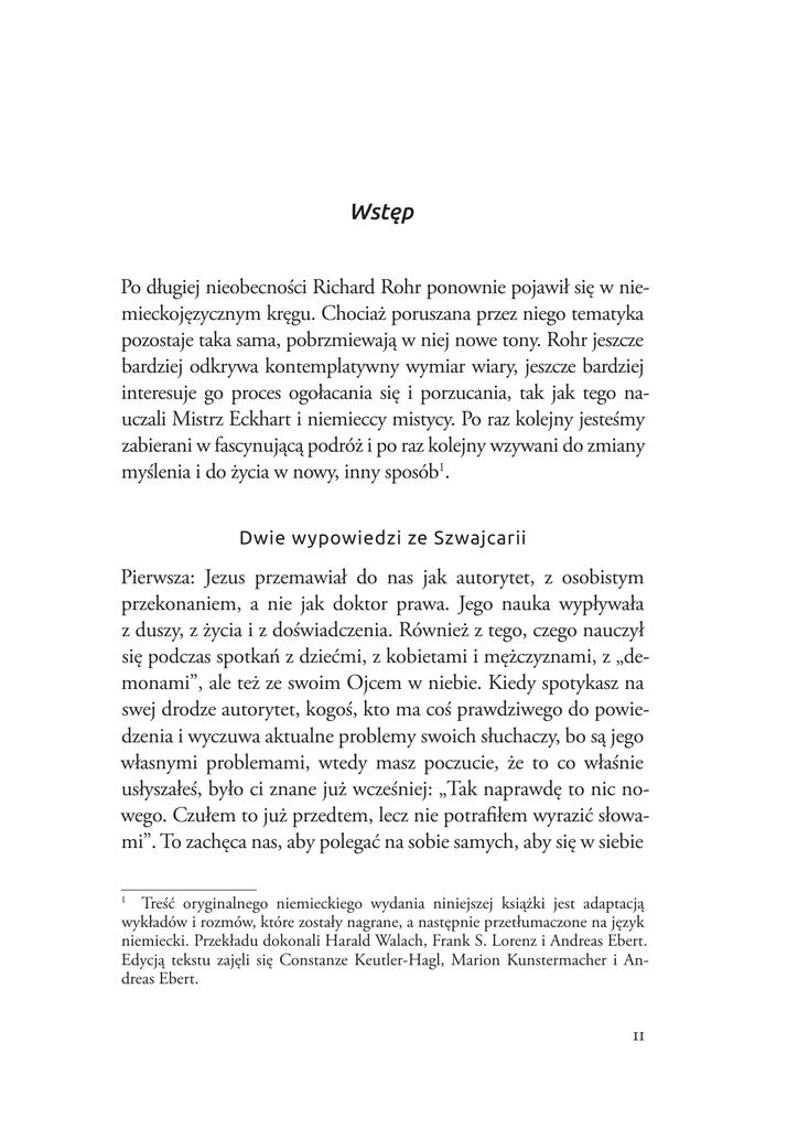 :VWôS Po długiej nieobecności Richard Rohr ponownie pojawił się w niemieckojęzycznym kręgu. Chociaż poruszana przez niego tematyka pozostaje taka sama, pobrzmiewają w niej nowe tony. Rohr jeszcze bardziej odkrywa kontemplatywny wymiar wiary, jeszcze bardziej interesuje go proces ogołacania się i porzucania, tak jak tego nauczali Mistrz Eckhart i niemieccy mistycy. Po raz kolejny jesteśmy zabierani w fascynującą podróż i po raz kolejny wzywani do zmiany myślenia i do życia w nowy, inny sposób1. 'ZLHZ\SRZLHG]L]H6]ZDMFDULL Pierwsza: Jezus przemawiał do nas jak autorytet, z osobistym przekonaniem, a nie jak doktor prawa. Jego nauka wypływała z duszy, z życia i z doświadczenia. Również z tego, czego nauczył się podczas spotkań z dziećmi, z kobietami i mężczyznami, z „demonami”, ale też ze swoim Ojcem w niebie. Kiedy spotykasz na swej drodze autorytet, kogoś, kto ma coś prawdziwego do powiedzenia i wyczuwa aktualne problemy swoich słuchaczy, bo są jego własnymi problemami, wtedy masz poczucie, że to co właśnie usłyszałeś, było ci znane już wcześniej: „Tak naprawdę to nic nowego. Czułem to już przedtem, lecz nie potrafiłem wyrazić słowami”. To zachęca nas, aby polegać na sobie samych, aby się w siebie Treść oryginalnego niemieckiego wydania niniejszej książki jest adaptacją wykładów i rozmów, które zostały nagrane, a następnie przetłumaczone na język niemiecki. Przekładu dokonali Harald Walach, Frank S. Lorenz i Andreas Ebert. Edycją tekstu zajęli się Constanze Keutler-Hagl, Marion Kunstermacher i Andreas Ebert. 1 11 :VWôS wsłuchać, aby zaufać temu, co słyszymy, czujemy i przypuszczamy. Dzieje się tak dlatego, że wszyscy mamy w sobie prawdziwego nauczyciela i mistrza. Jezus nazywa go Duchem Świętym, który poprowadzi nas wszystkich ku pełni prawdy. Nie znaczy to, że już nie potrzebujemy siebie nawzajem – raczej że możemy zaprzestać szukania mistrza i chłonięcia każdego słowa wypowiedzianego przez nauczyciela. Ktoś taki jest nam oczywiście niezbędny, kiedy jesteśmy dziećmi, lecz także jako dojrzali ludzie powinniśmy zwracać uwagę na nauczyciela w naszych sercach. Niemniej jednak spotykamy na swojej drodze nauczycieli, którzy potrafią wzmacniać nas za pomocą słów i pomagają otwierać się na to, czego życie i Duch Święty od dawna próbują nas nauczyć. Słowa ojca Richarda Rohra dały odwagę i nadzieję wielu ludziom. Po jednym z jego wykładów ktoś powiedział: „Tym razem nie wyszedłem z przekonaniem, że muszę zrobić to czy tamto i wtedy wszystko będzie dobrze. Nie chodzi o to, żebym więcej osiągnął, ale żebym bardziej zaufał: odpuść sobie, zaufaj Bogu, zaufaj życiu i temu, czego cię ono uczy”. Rohr nie naucza bierności, lecz aktywnego zaufania, działania i kontemplacji, zaangażowania w świat i umiejętności zatracenia się w Bogu. Moim pięknym doświadczeniem było uświadomienie sobie, że to, co stało się dla mnie ważne w ostatnich latach – a co niektórzy wciąż wkładają do jednego worka razem z teologią wyzwolenia, feminizmem i New Age – przez Richarda Rohra, franciszkanina, jest traktowane jak stara, zwyczajna i radosna franciszkańska teologia, jeśli możemy to w ogóle nazwać teologią. A może lepiej nazwać to prostą radością w Bogu, w Jezusie Chrystusie, w stworzeniu i stworzeniach postrzeganych tak, jak postrzegał je Brat Franciszek. Nauka Rohra nie jest zgodna z duchem czasu [Zeitgeist], lecz z duchem Jezusa i Kazania na Górze2. Pastor Felix Felix, Rundbrief der Diakonischen Gemeinschaft, Friedengasse, Basel (marzec 1990): 12–14. 2 12 :VWôS Druga: Napełniony ewangelicznym entuzjazmem ojciec Rohr wezwał swoich słuchaczy do podjęcia ryzyka i spojrzenia na Kościół taki, jakim mógłby być, ale nie jest (jeszcze). Bez usprawiedliwiania się, bez zbędnych dygresji pokazywał i przyznawał, że burżuazyjna, konsumpcyjna kultura chrześcijańskiego Zachodu jest nam znacznie bliższa niż Królestwo Boże. W tym sensie obecne chrześcijaństwo jest niebezpiecznie zarażone wirusami „bogactwa”, „komfortu” i „narodowego egoizmu”. Z drugiej jednak strony wciąż możliwe jest wytrwanie w miłości do tego Kościoła i jego tradycji. Taka postawa jest często rozumiana w niewłaściwy sposób. Ktoś, kto z determinacją obnaża prawdziwą sytuację, z miejsca klasyfikowany jest jako zły ptak kalający własne gniazdo. Jednak to właśnie ci, którzy inicjują krytykę, są w stanie zachować ten szczególny rodzaj miłości do swojego Kościoła i kraju, w którym mieszkają. Podnoszą głos, bo ważne jest, aby ich Kościół czy kraj nie weszły na jakąkolwiek ze starych dróg. Mam nadzieję, że nauczymy się lepiej przyjmować i akceptować głosy krytyki, w szczególności w Kościele, gdyż mogą być to głosy prorocze. Richard Rohr parafrazuje świętego Augustyna, mówiąc, że „wielu należy do Kościoła, nie należąc do Boga, ale też wielu należy do Boga, nie należąc do Kościoła”. Za ilustrację tego powiedzenia niech posłuży następujący epizod: do kościoła wchodzi człowiek, który swym wyglądem daleko odbiega od powszechnego pojęcia człowieka religijnego. Najwyraźniej nierozpieszczony przez życie – ubrany w znoszony garnitur, na staroświeckiej protezie kuśtyka wzdłuż głównej nawy, a obok niego maszeruje duży pies. Minąwszy zdziwionych zebranych, spokojnie umieszcza zapaloną świecę przed samą amboną i po cichu zasiada w bocznej nawie. Szkoda, że w kościołach wciąż brakuje takiej otwartości i naturalnej swobody3. Andreas Ebert 3 Beat Ruegger, Reformiertes Forum 12 (23 marca 1990): 19. 13