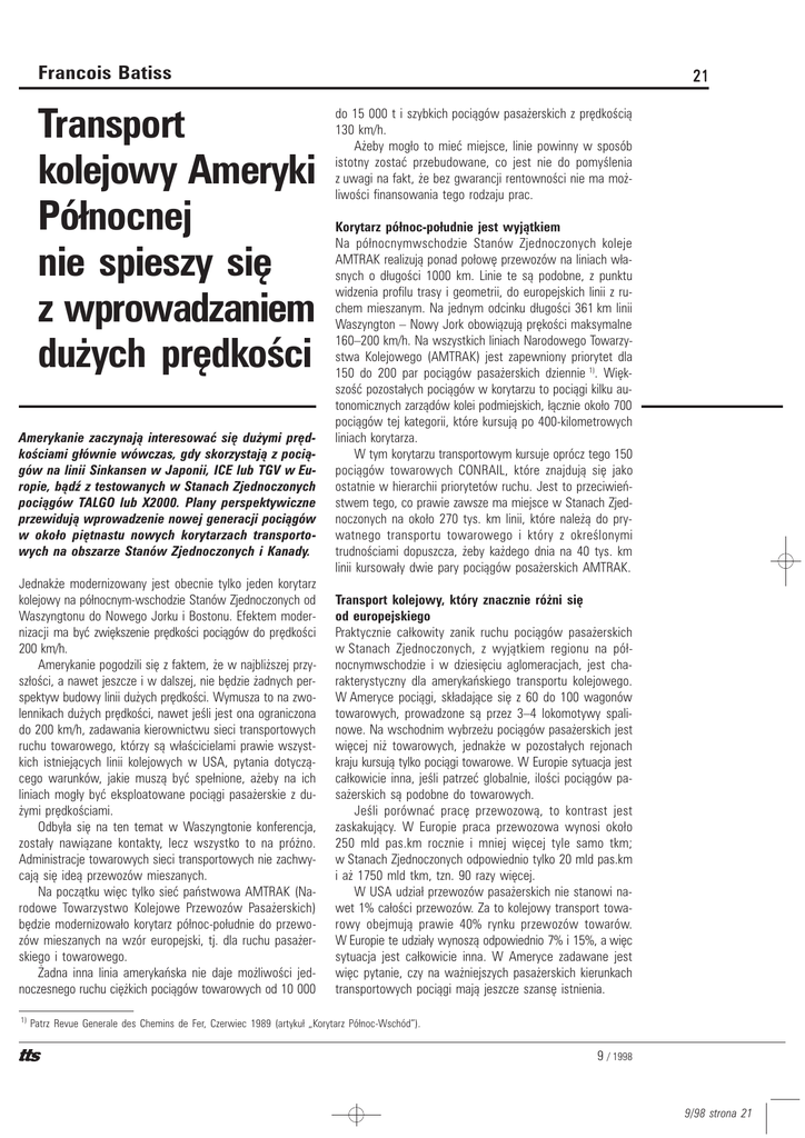 Francois Batiss Transport kolejowy Ameryki Pó³nocnej nie spieszy siê z wprowadzaniem du¿ych prêdkoœci Amerykanie zaczynaj¹ interesowaæ siê du¿ymi prêdkoœciami g³ównie wówczas, gdy skorzystaj¹ z poci¹gów na linii Sinkansen w Japonii, ICE lub TGV w Europie, b¹dŸ z testowanych w Stanach Zjednoczonych poci¹gów TALGO lub X2000. Plany perspektywiczne przewiduj¹ wprowadzenie nowej generacji poci¹gów w oko³o piêtnastu nowych korytarzach transportowych na obszarze Stanów Zjednoczonych i Kanady. Jednak¿e modernizowany jest obecnie tylko jeden korytarz kolejowy na pó³nocnym-wschodzie Stanów Zjednoczonych od Waszyngtonu do Nowego Jorku i Bostonu. Efektem modernizacji ma byæ zwiêkszenie prêdkoœci poci¹gów do prêdkoœci 200 km/h. Amerykanie pogodzili siê z faktem, ¿e w najbli¿szej przysz³oœci, a nawet jeszcze i w dalszej, nie bêdzie ¿adnych perspektyw budowy linii du¿ych prêdkoœci. Wymusza to na zwolennikach du¿ych prêdkoœci, nawet jeœli jest ona ograniczona do 200 km/h, zadawania kierownictwu sieci transportowych ruchu towarowego, którzy s¹ w³aœcicielami prawie wszystkich istniej¹cych linii kolejowych w USA, pytania dotycz¹cego warunków, jakie musz¹ byæ spe³nione, a¿eby na ich liniach mog³y byæ eksploatowane poci¹gi pasa¿erskie z du¿ymi prêdkoœciami. Odby³a siê na ten temat w Waszyngtonie konferencja, zosta³y nawi¹zane kontakty, lecz wszystko to na pró¿no. Administracje towarowych sieci transportowych nie zachwycaj¹ siê ide¹ przewozów mieszanych. Na pocz¹tku wiêc tylko sieæ pañstwowa AMTRAK (Narodowe Towarzystwo Kolejowe Przewozów Pasa¿erskich) bêdzie modernizowa³o korytarz pó³noc-po³udnie do przewozów mieszanych na wzór europejski, tj. dla ruchu pasa¿erskiego i towarowego. ¯adna inna linia amerykañska nie daje mo¿liwoœci jednoczesnego ruchu ciê¿kich poci¹gów towarowych od 10 000 1) 21 do 15 000 t i szybkich poci¹gów pasa¿erskich z prêdkoœci¹ 130 km/h. A¿eby mog³o to mieæ miejsce, linie powinny w sposób istotny zostaæ przebudowane, co jest nie do pomyœlenia z uwagi na fakt, ¿e bez gwarancji rentownoœci nie ma mo¿liwoœci finansowania tego rodzaju prac. Korytarz pó³noc-po³udnie jest wyj¹tkiem Na pó³nocnymwschodzie Stanów Zjednoczonych koleje AMTRAK realizuj¹ ponad po³owê przewozów na liniach w³asnych o d³ugoœci 1000 km. Linie te s¹ podobne, z punktu widzenia profilu trasy i geometrii, do europejskich linii z ruchem mieszanym. Na jednym odcinku d³ugoœci 361 km linii Waszyngton – Nowy Jork obowi¹zuj¹ prêkoœci maksymalne 160–200 km/h. Na wszystkich liniach Narodowego Towarzystwa Kolejowego (AMTRAK) jest zapewniony priorytet dla 150 do 200 par poci¹gów pasa¿erskich dziennie 1). Wiêkszoœæ pozosta³ych poci¹gów w korytarzu to poci¹gi kilku autonomicznych zarz¹dów kolei podmiejskich, ³¹cznie oko³o 700 poci¹gów tej kategorii, które kursuj¹ po 400-kilometrowych liniach korytarza. W tym korytarzu transportowym kursuje oprócz tego 150 poci¹gów towarowych CONRAIL, które znajduj¹ siê jako ostatnie w hierarchii priorytetów ruchu. Jest to przeciwieñstwem tego, co prawie zawsze ma miejsce w Stanach Zjednoczonych na oko³o 270 tys. km linii, które nale¿¹ do prywatnego transportu towarowego i który z okreœlonymi trudnoœciami dopuszcza, ¿eby ka¿dego dnia na 40 tys. km linii kursowa³y dwie pary poci¹gów posa¿erskich AMTRAK. Transport kolejowy, który znacznie ró¿ni siê od europejskiego Praktycznie ca³kowity zanik ruchu poci¹gów pasa¿erskich w Stanach Zjednoczonych, z wyj¹tkiem regionu na pó³nocnymwschodzie i w dziesiêciu aglomeracjach, jest charakterystyczny dla amerykañskiego transportu kolejowego. W Ameryce poci¹gi, sk³adaj¹ce siê z 60 do 100 wagonów towarowych, prowadzone s¹ przez 3–4 lokomotywy spalinowe. Na wschodnim wybrze¿u poci¹gów pasa¿erskich jest wiêcej ni¿ towarowych, jednak¿e w pozosta³ych rejonach kraju kursuj¹ tylko poci¹gi towarowe. W Europie sytuacja jest ca³kowicie inna, jeœli patrzeæ globalnie, iloœci poci¹gów pasa¿erskich s¹ podobne do towarowych. Jeœli porównaæ pracê przewozow¹, to kontrast jest zaskakuj¹cy. W Europie praca przewozowa wynosi oko³o 250 mld pas.km rocznie i mniej wiêcej tyle samo tkm; w Stanach Zjednoczonych odpowiednio tylko 20 mld pas.km i a¿ 1750 mld tkm, tzn. 90 razy wiêcej. W USA udzia³ przewozów pasa¿erskich nie stanowi nawet 1% ca³oœci przewozów. Za to kolejowy transport towarowy obejmuj¹ prawie 40% rynku przewozów towarów. W Europie te udzia³y wynosz¹ odpowiednio 7% i 15%, a wiêc sytuacja jest ca³kowicie inna. W Ameryce zadawane jest wiêc pytanie, czy na wa¿niejszych pasa¿erskich kierunkach transportowych poci¹gi maj¹ jeszcze szansê istnienia. Patrz Revue Generale des Chemins de Fer, Czerwiec 1989 (artyku³ „Korytarz Pó³noc-Wschód”). 9 / 1998 9/98 strona 21 22 Amerykañskie linie kolejowe s¹ lepiej przystosowane do przewozów towarowych ni¿ pasa¿erskich Amerykanie dowcipkuj¹, ¿e ich linie kolejowe w ostatnim stuleciu siê nie zmieni³y, z wyj¹tkiem zwiêkszenia dopuszczalnych nacisków na oœ, wynosz¹cymi od 25 do 36 t, to jest blisko dwukrotnie wiêcej ni¿ w Europie. Linie jednotorowe dominuj¹ na 95% sieci kolejowej, z wyj¹tkiem pó³nocnego-wschodu, aglomeracji miejskich i jednego lub dwóch odcinków na wa¿nych towarowych kierunkach transportowych. Tylko 0,3% linii jest zelektryfikowanych, tj. 550 km miêdzy Waszyngtonem oraz Nowym Jorkiem i New Haven. W najbli¿szym czasie sieæ trakcyjna bêdzie zawieszona do Bostonu, co oznacza, ¿e wówczas bêdzie zelektryfikowanych 800 km z istniej¹cych 270 tys. km linii. Profil linii kolejowych w Stanach Zjednoczonych pozwala na przewozy ciê¿kimi poci¹gami towarowymi o d³ugich sk³adach. Pasa¿erskie i towarowe przewozy mieszane s¹ rzadkoœci¹ niezbyt chêtnie utrzymywan¹ AMTRAK, narodowe towarzystwo, które realizuje wszystkie przewozy pasa¿erskie na wa¿niejszych